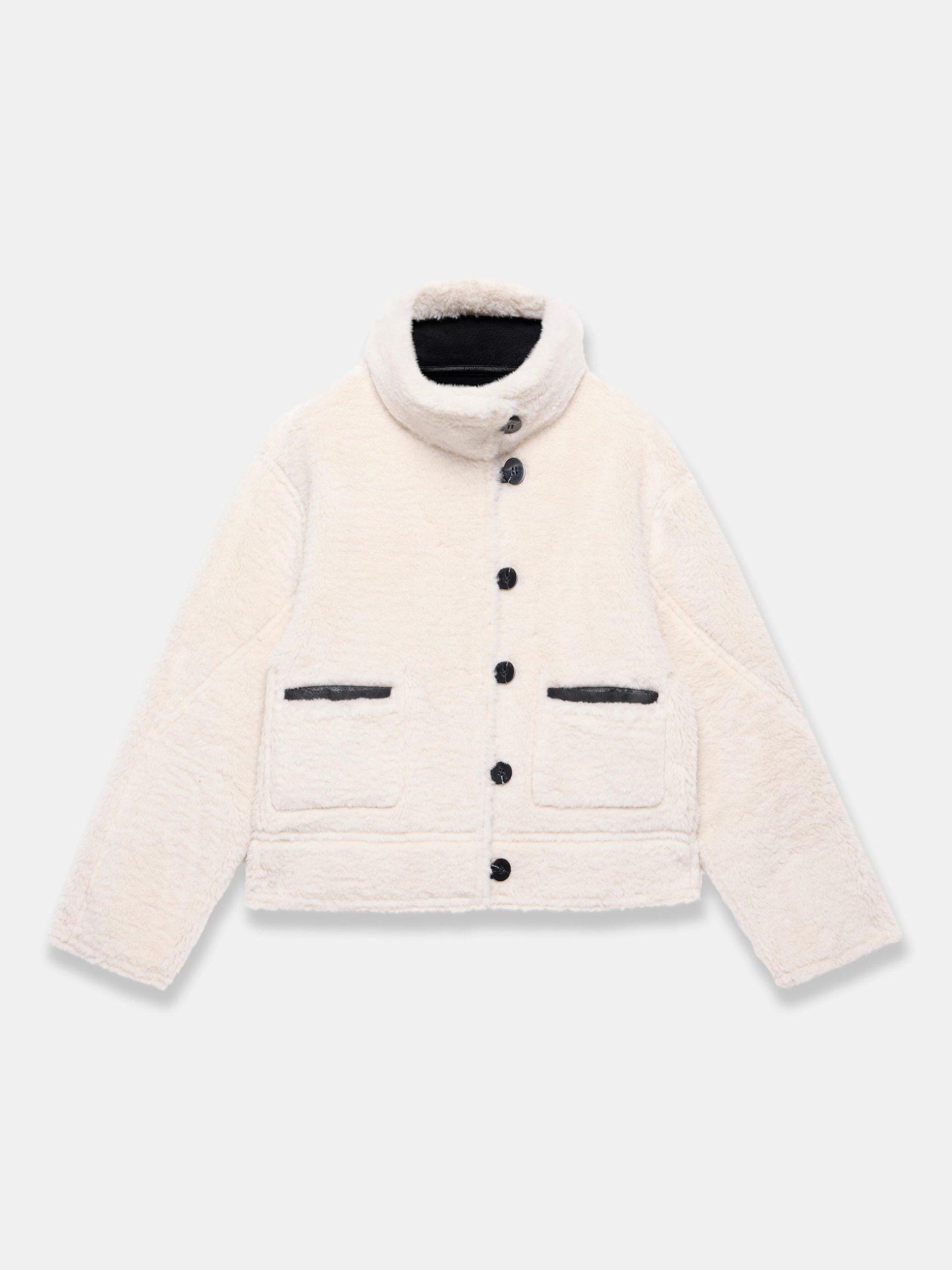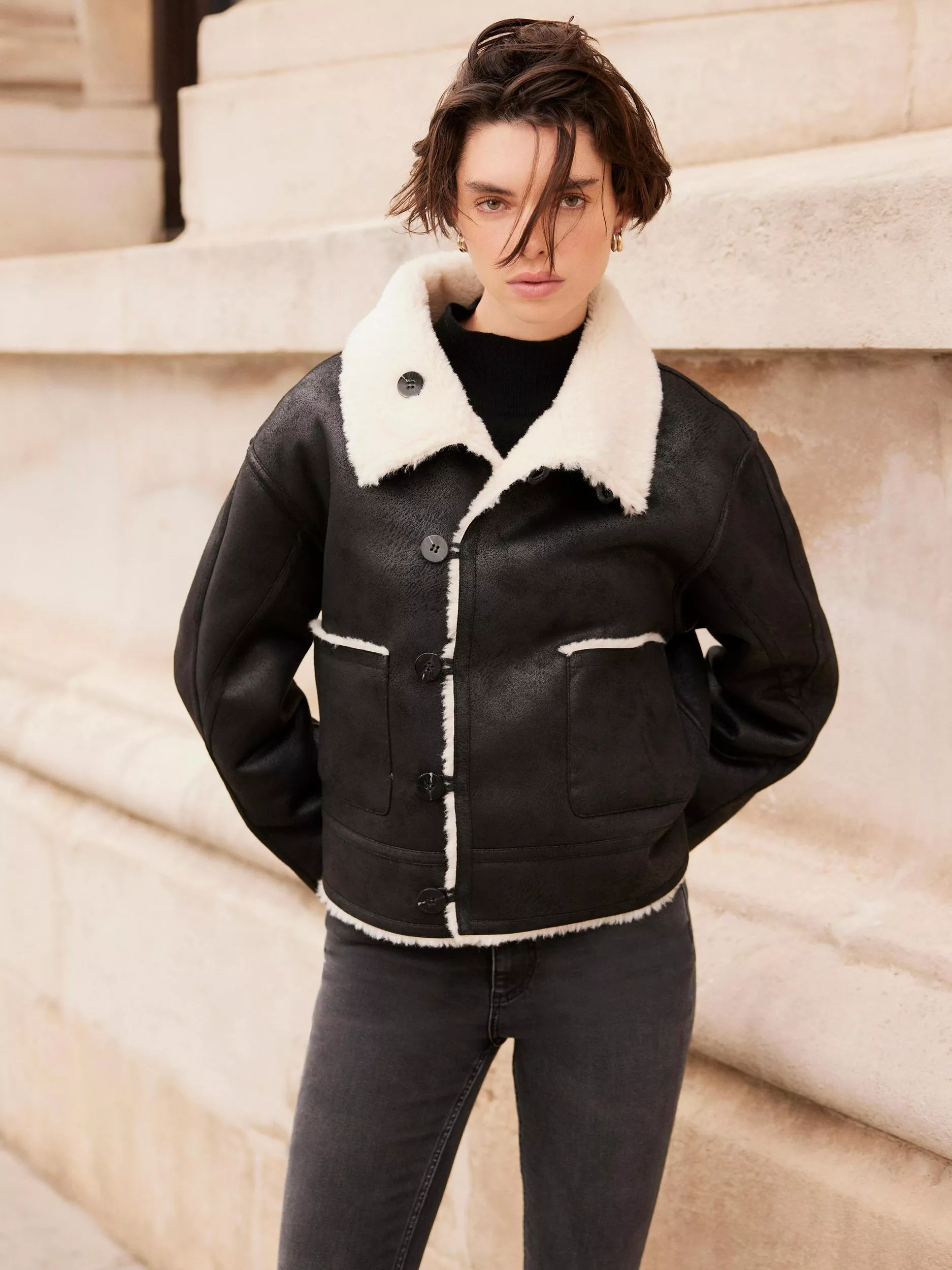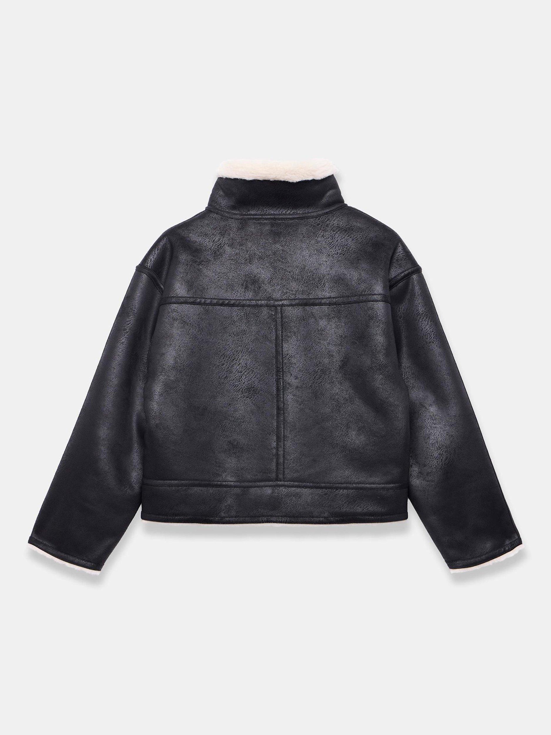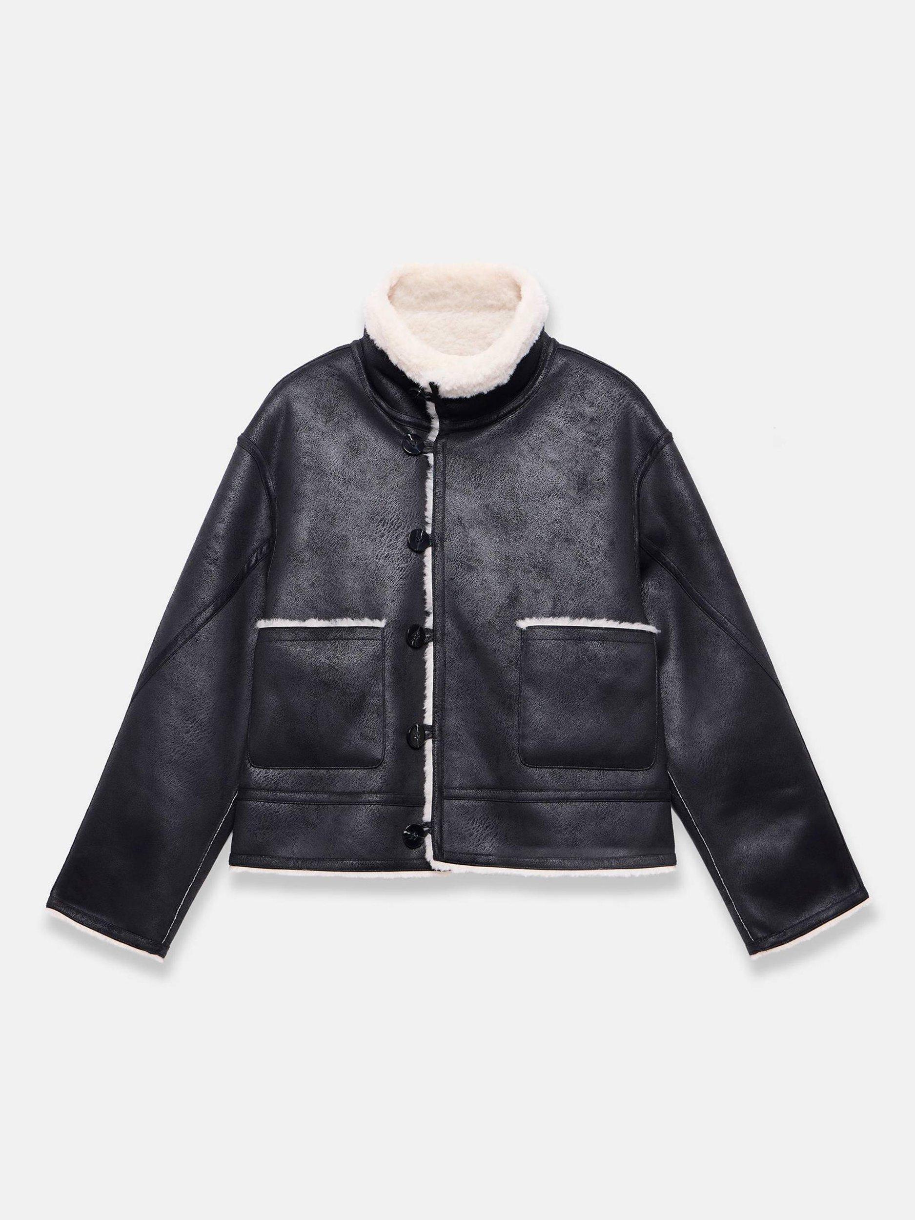 Black reversible aviator jacket featuring a high neckline, long sleeves, square pockets, faux fur linking with a button fastening through the front.