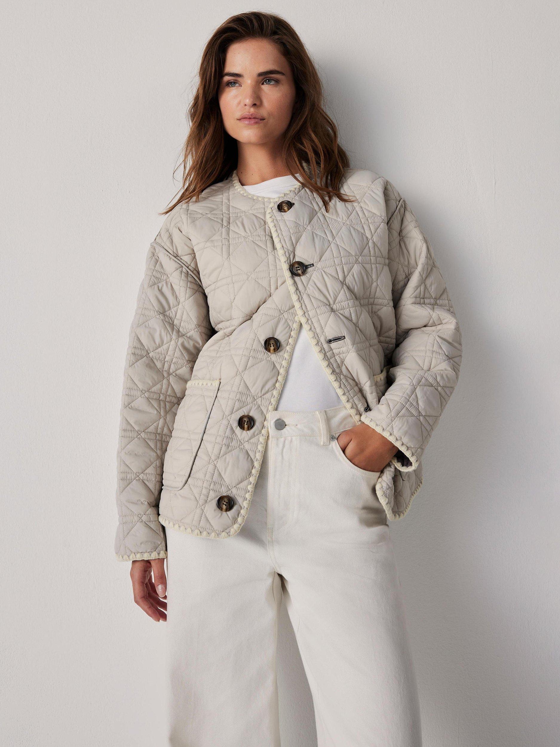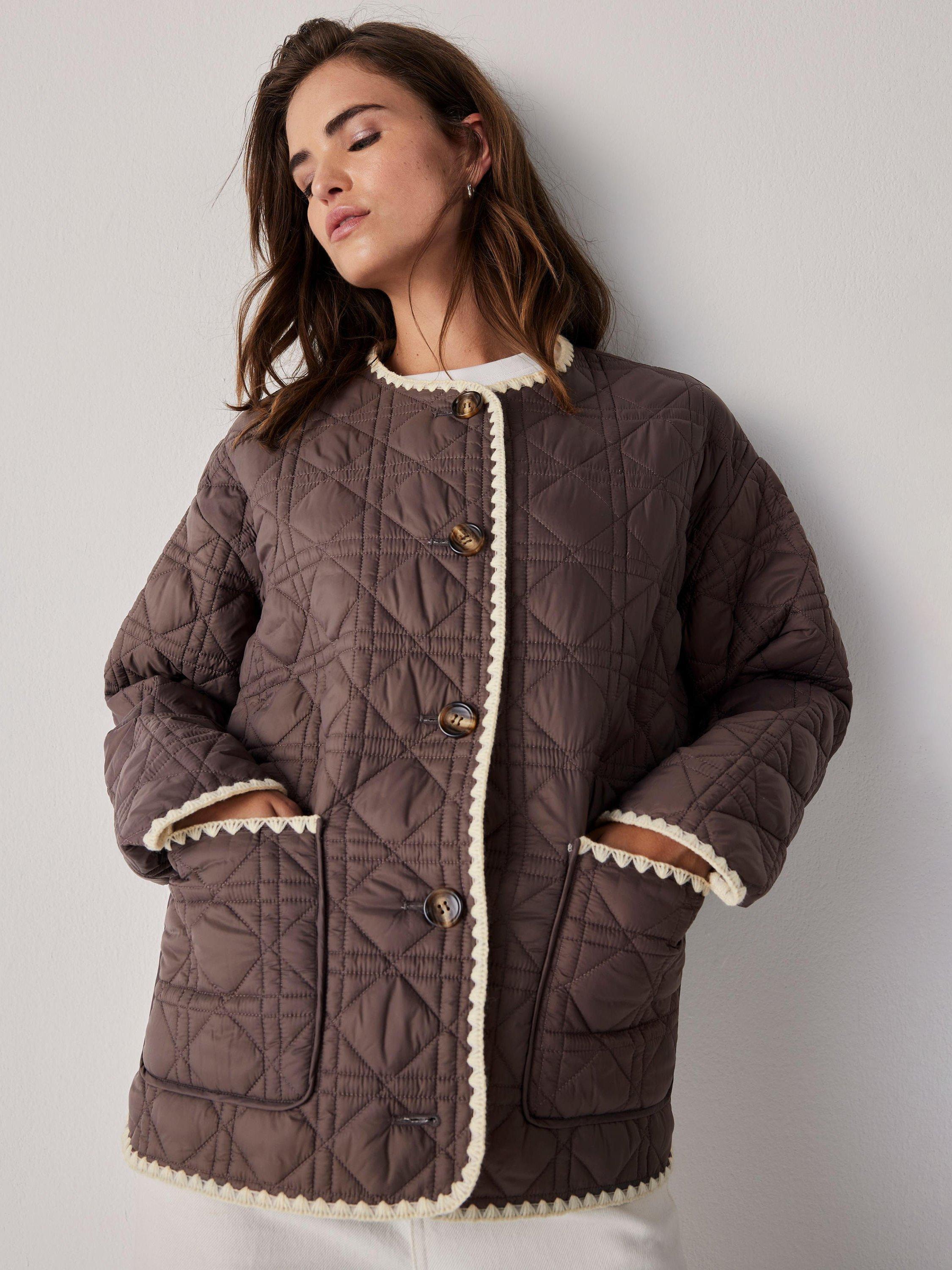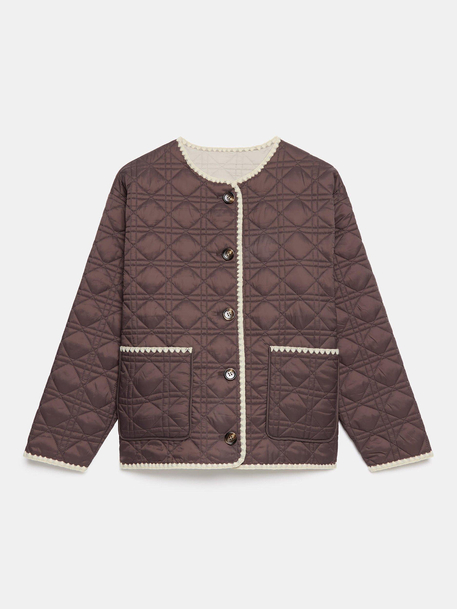 A quilted reversible jacket featuring a crew neckline, long sleeves, stitched trim, square pockets with a button fastening through the front.