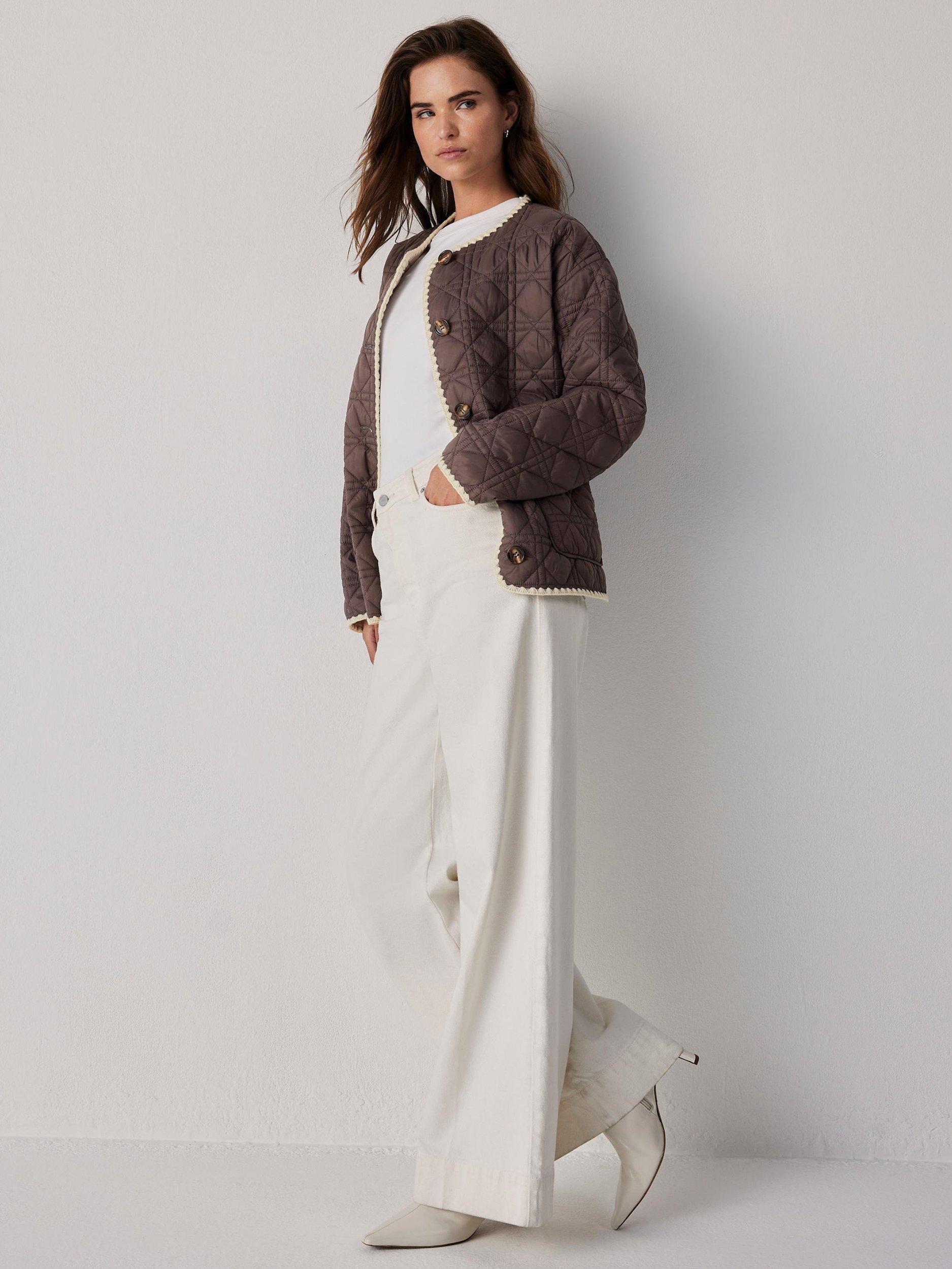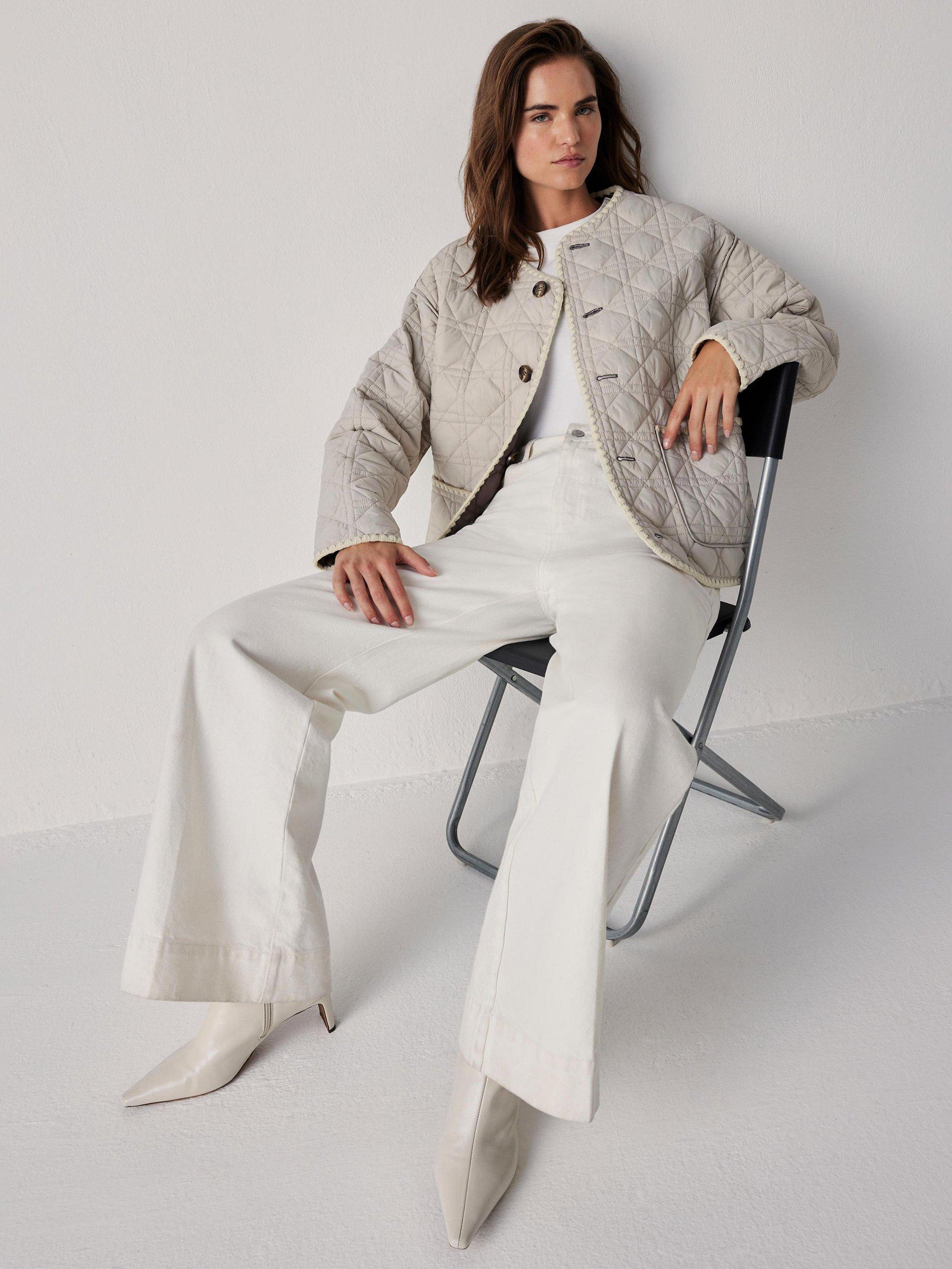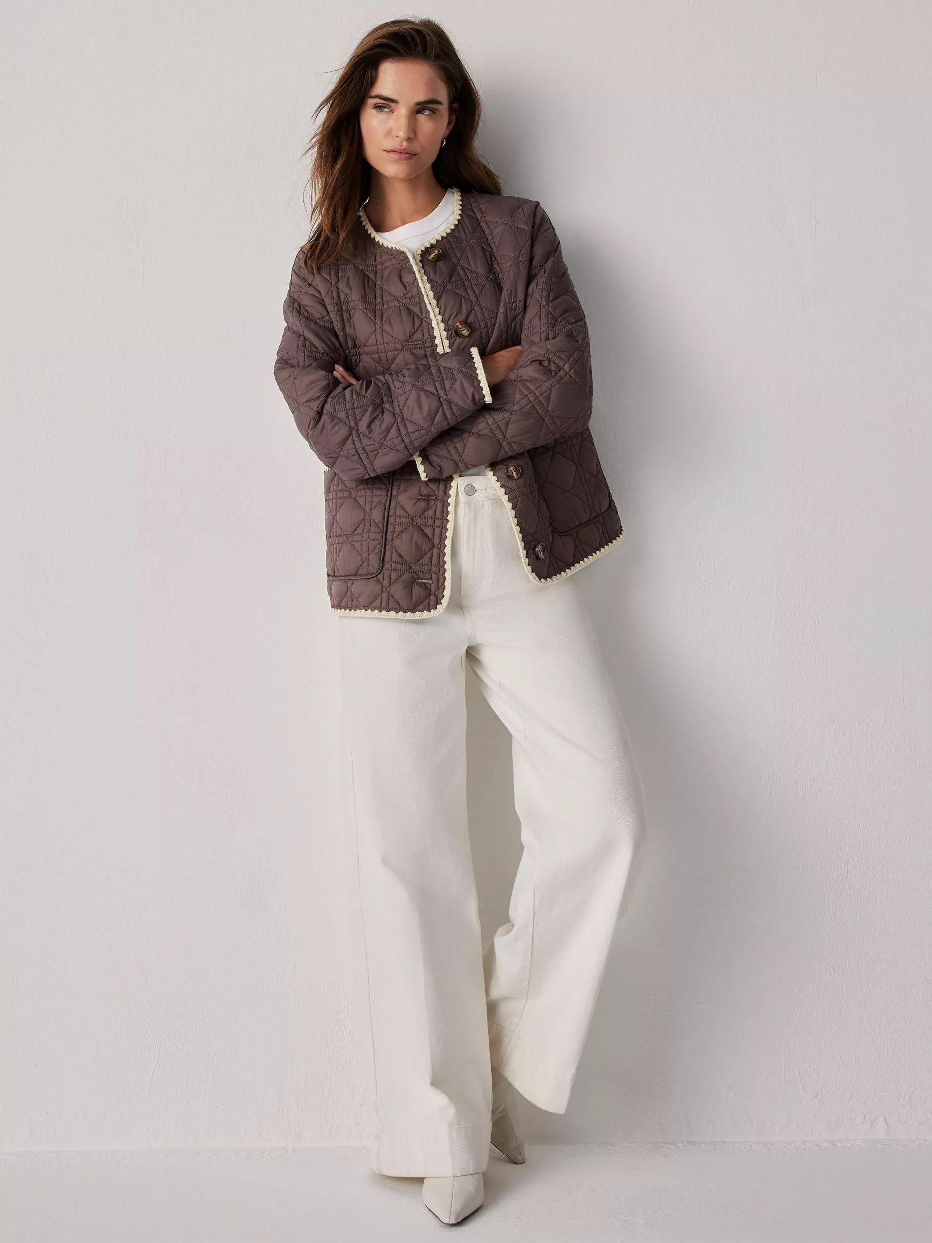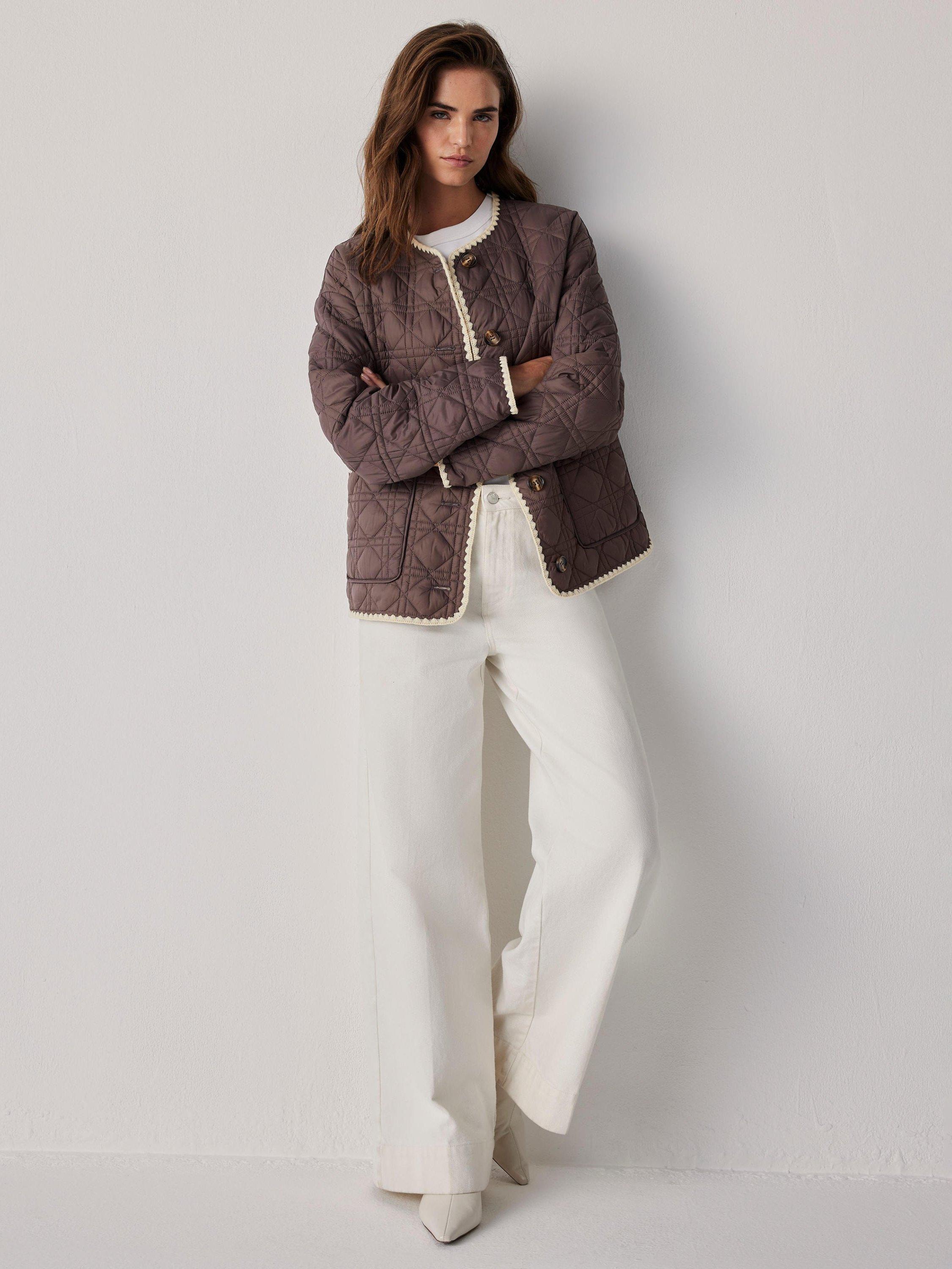 A quilted reversible jacket featuring a crew neckline, long sleeves, stitched trim, square pockets with a button fastening through the front.