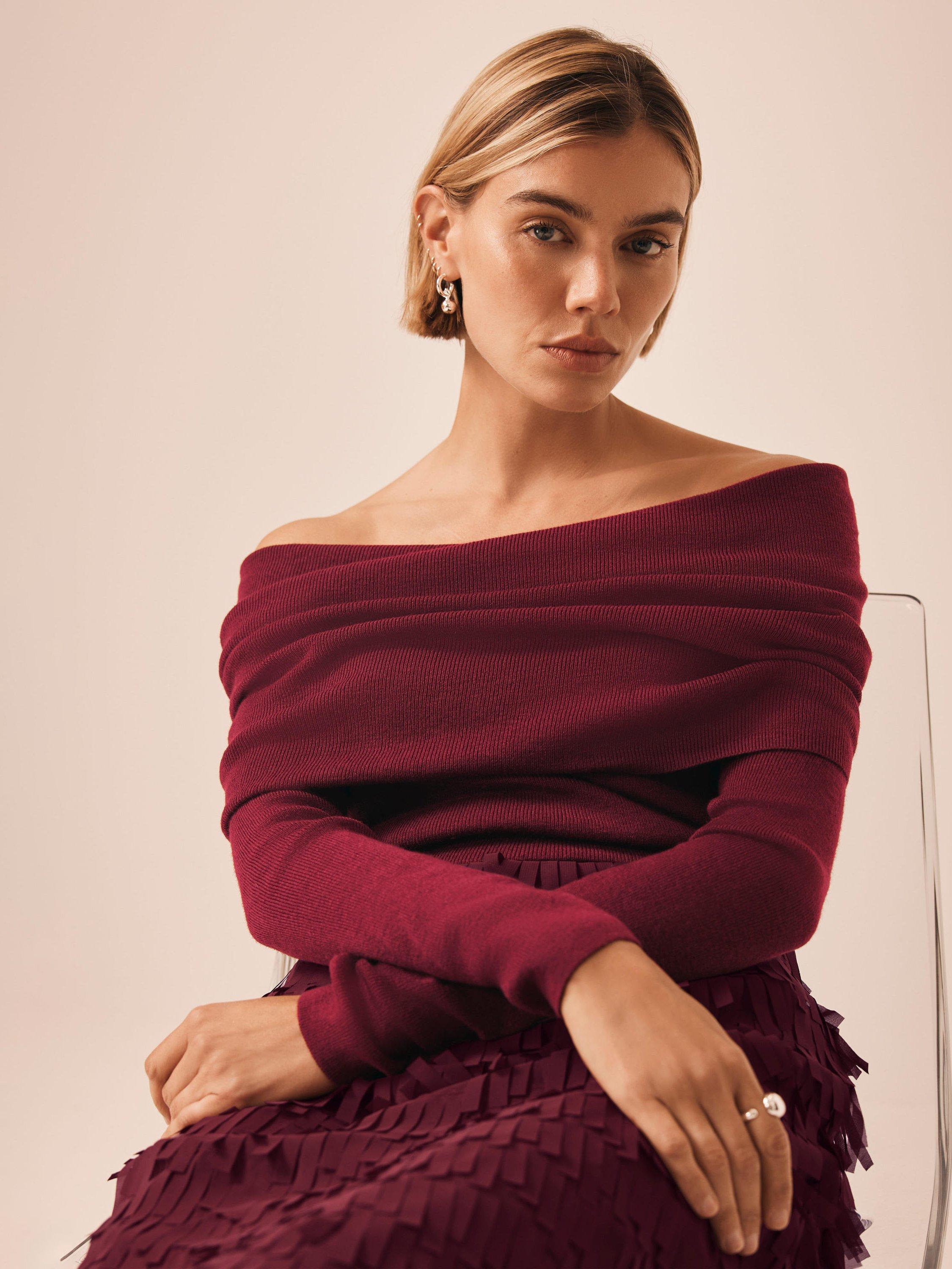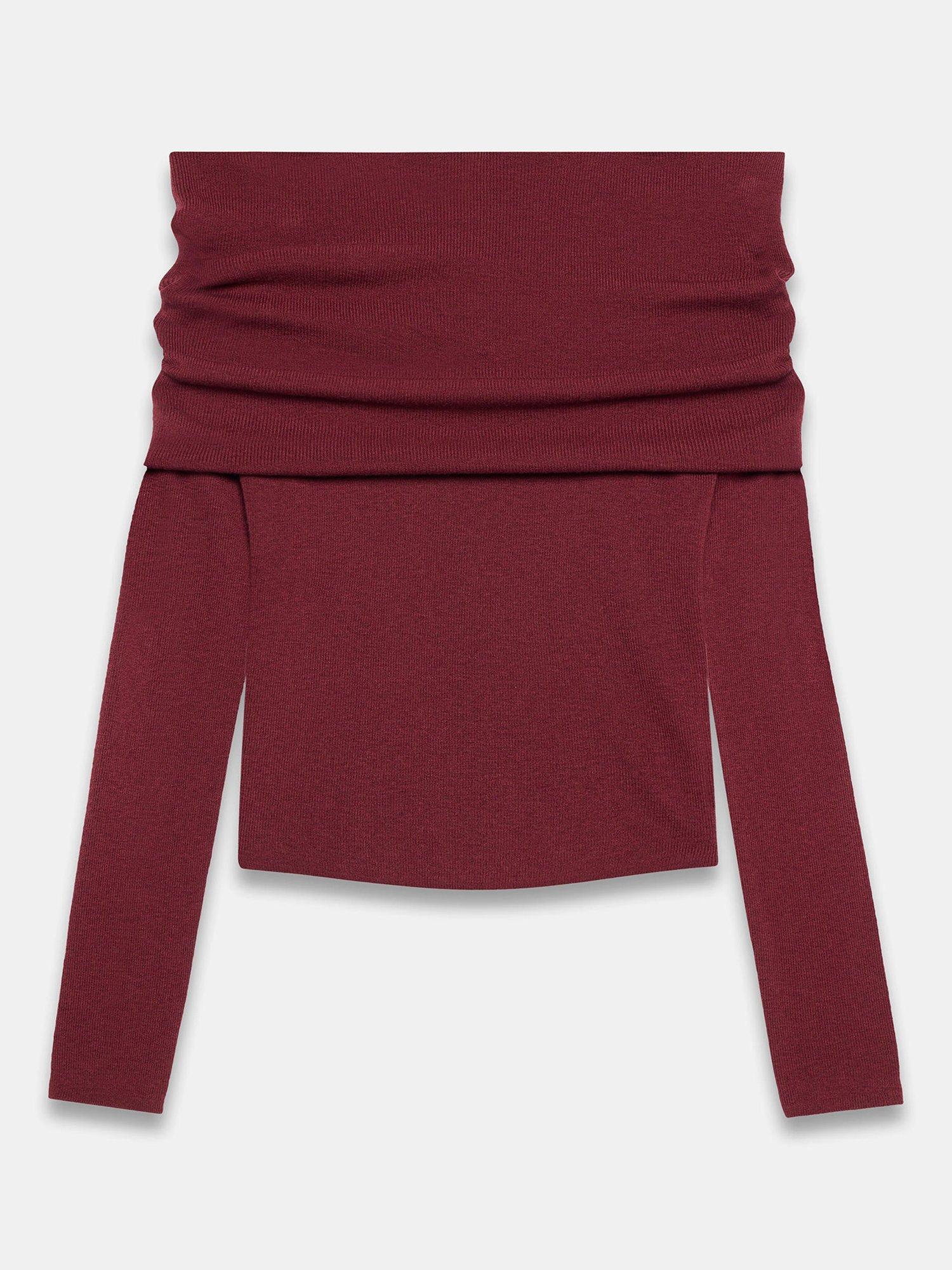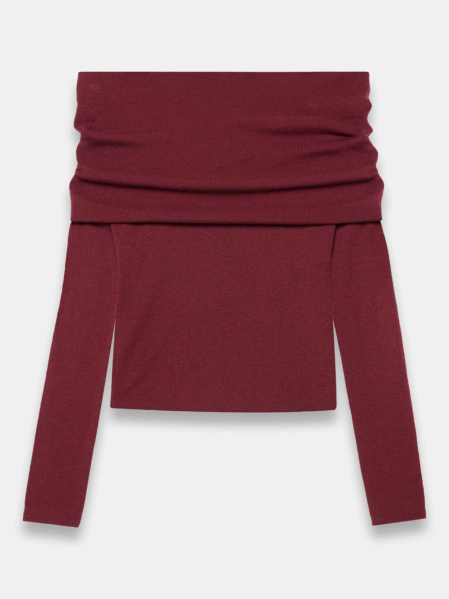 A ribbed top with a fold-over Bardot neckline and long sleeves.
