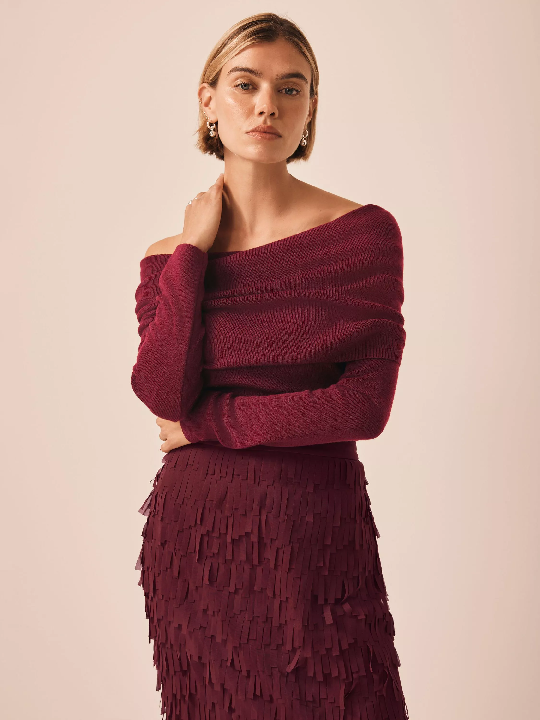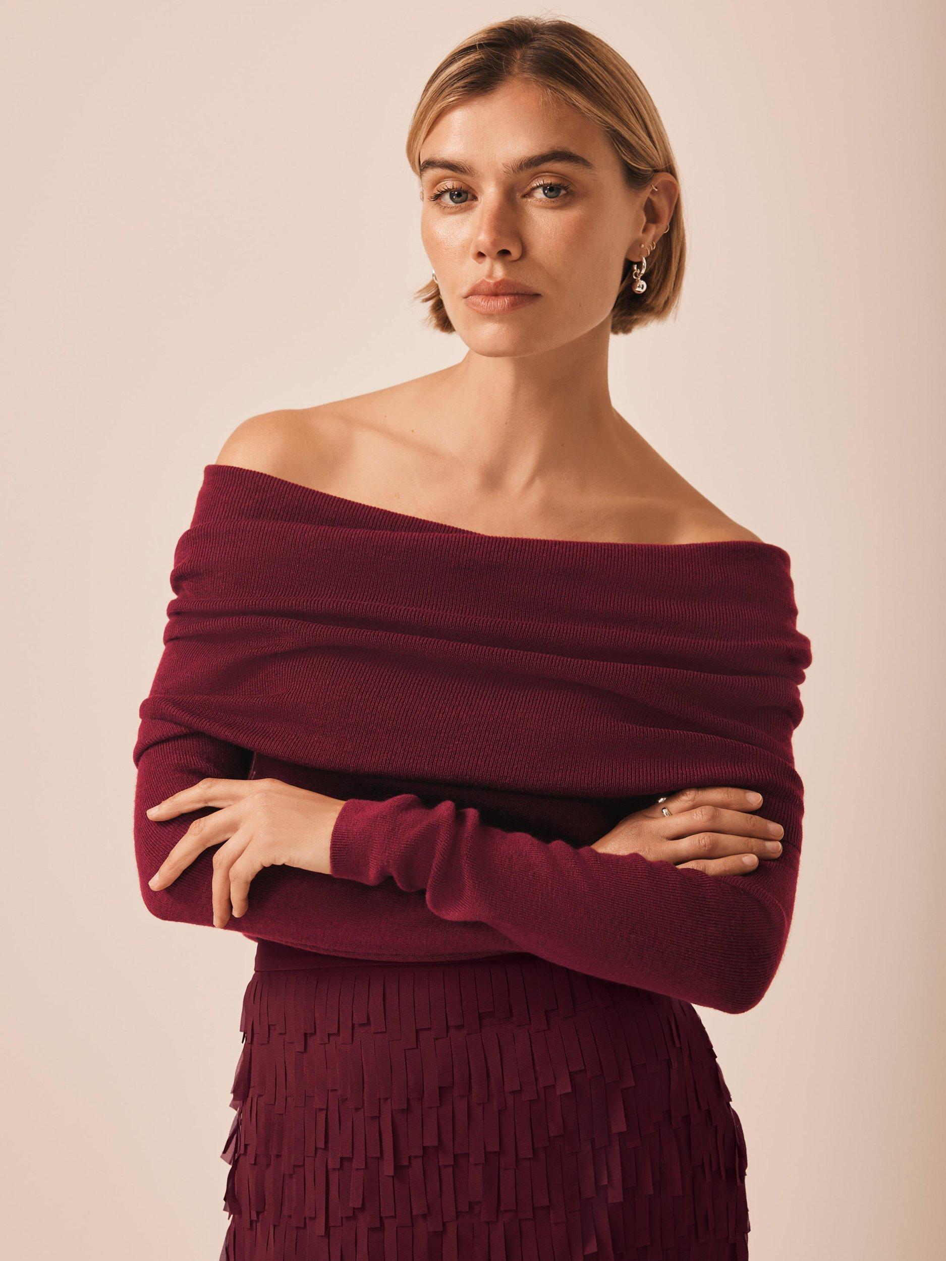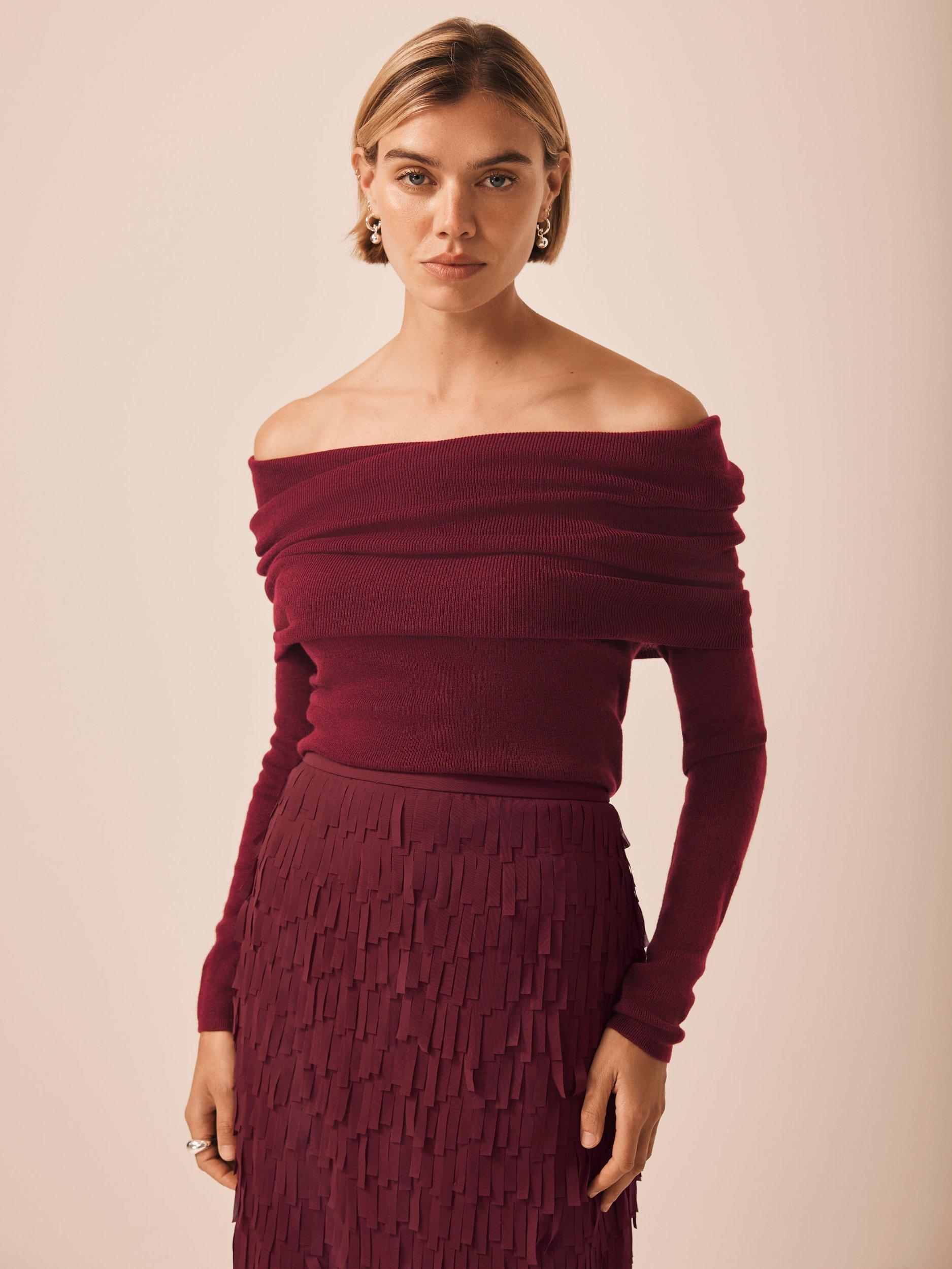 A ribbed top with a fold-over Bardot neckline and long sleeves.