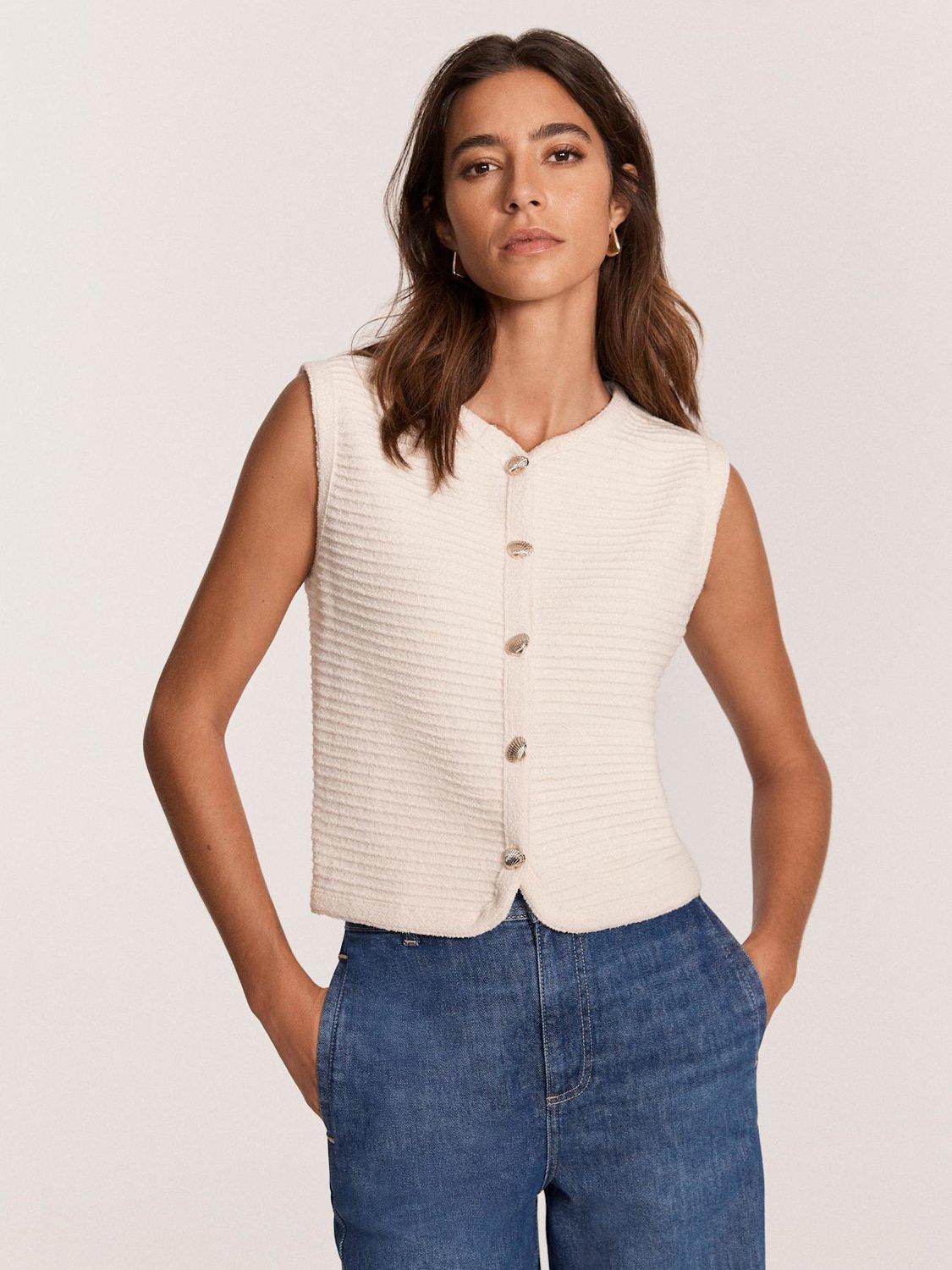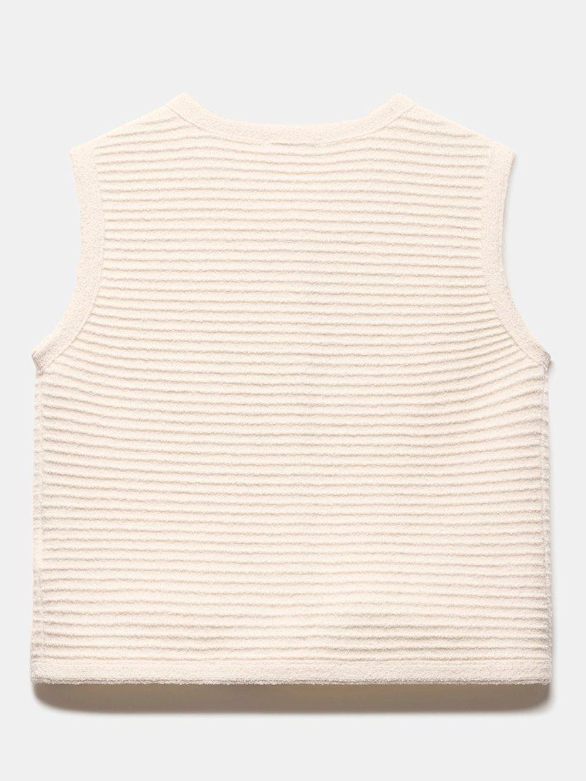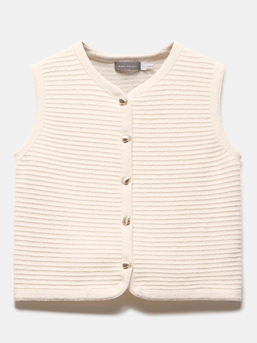 A ribbed waistcoat featuring a crew neckline and shell button fastenings through the front.