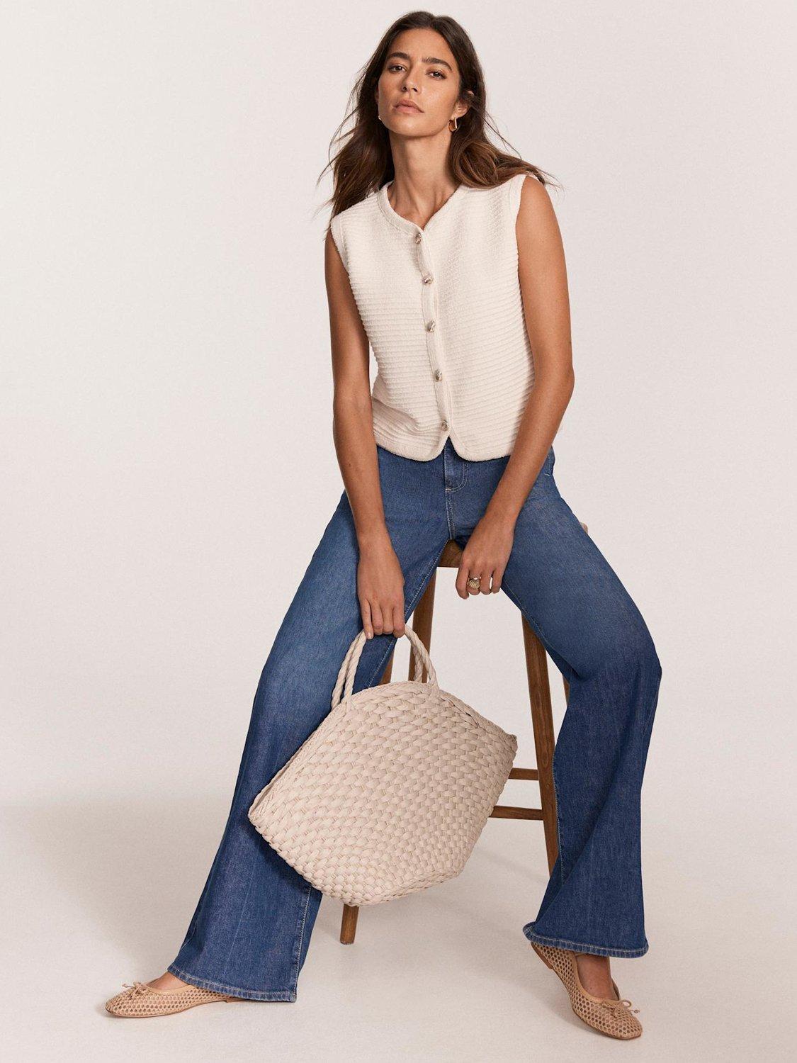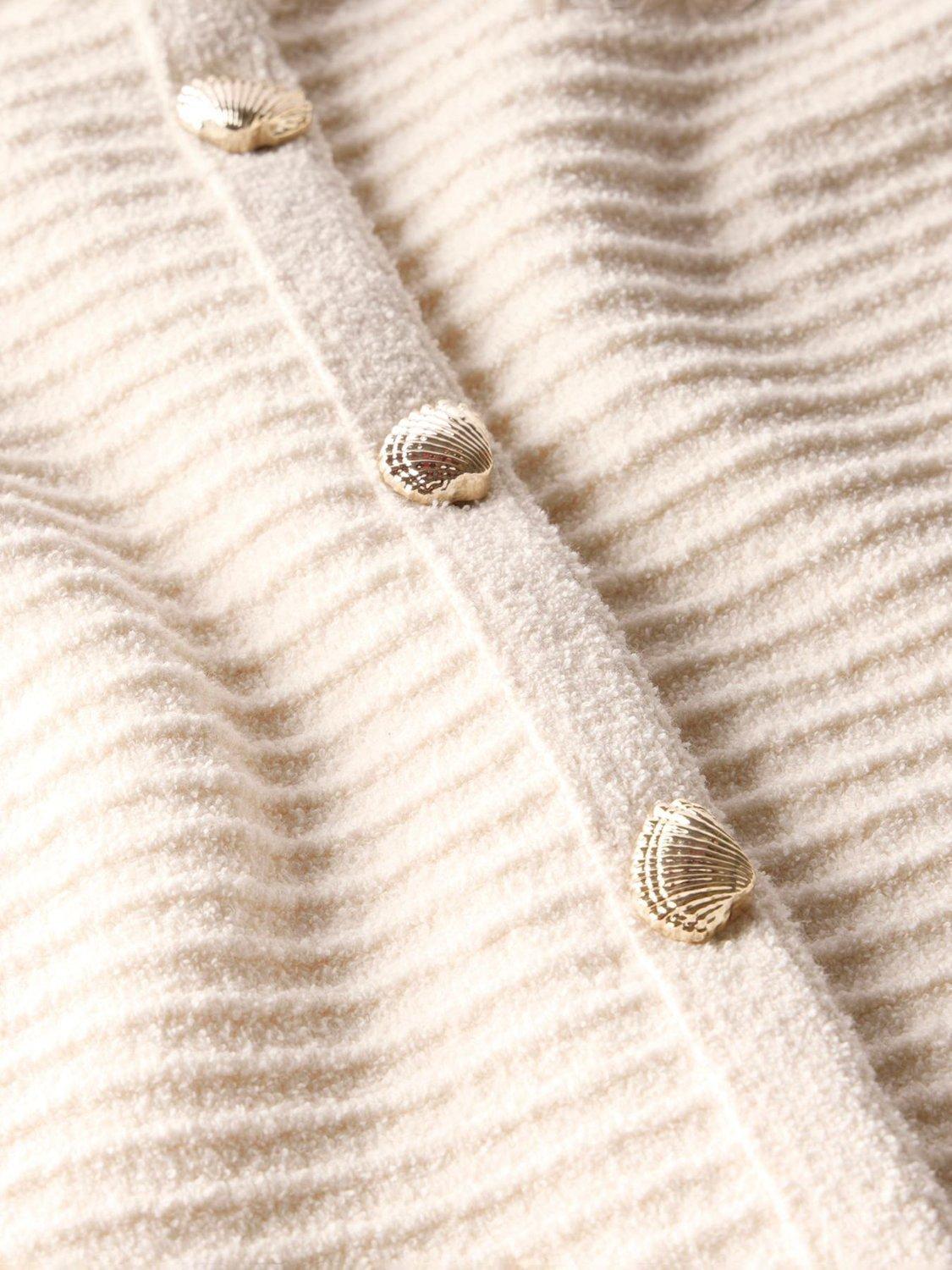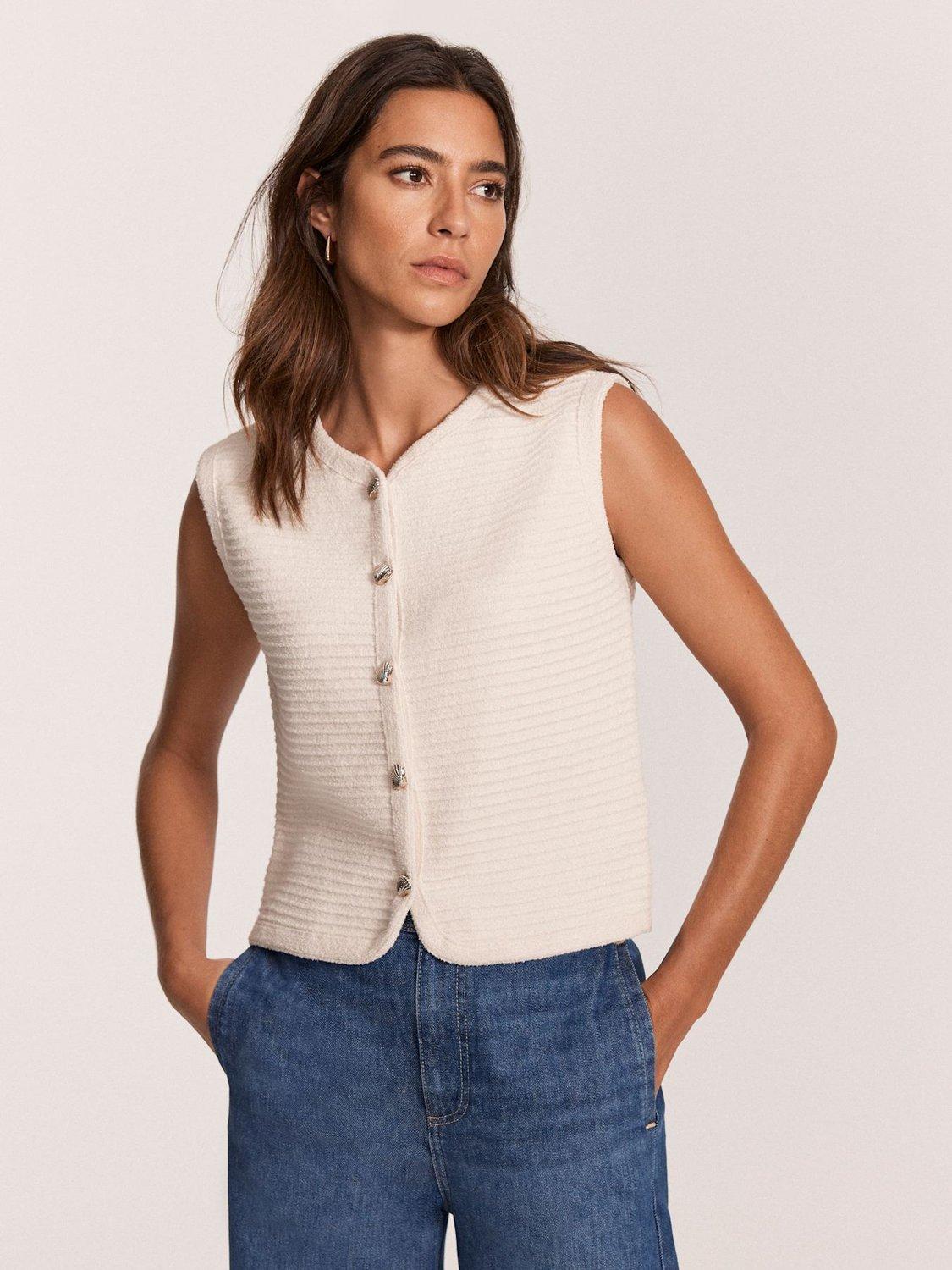 A ribbed waistcoat featuring a crew neckline and shell button fastenings through the front.