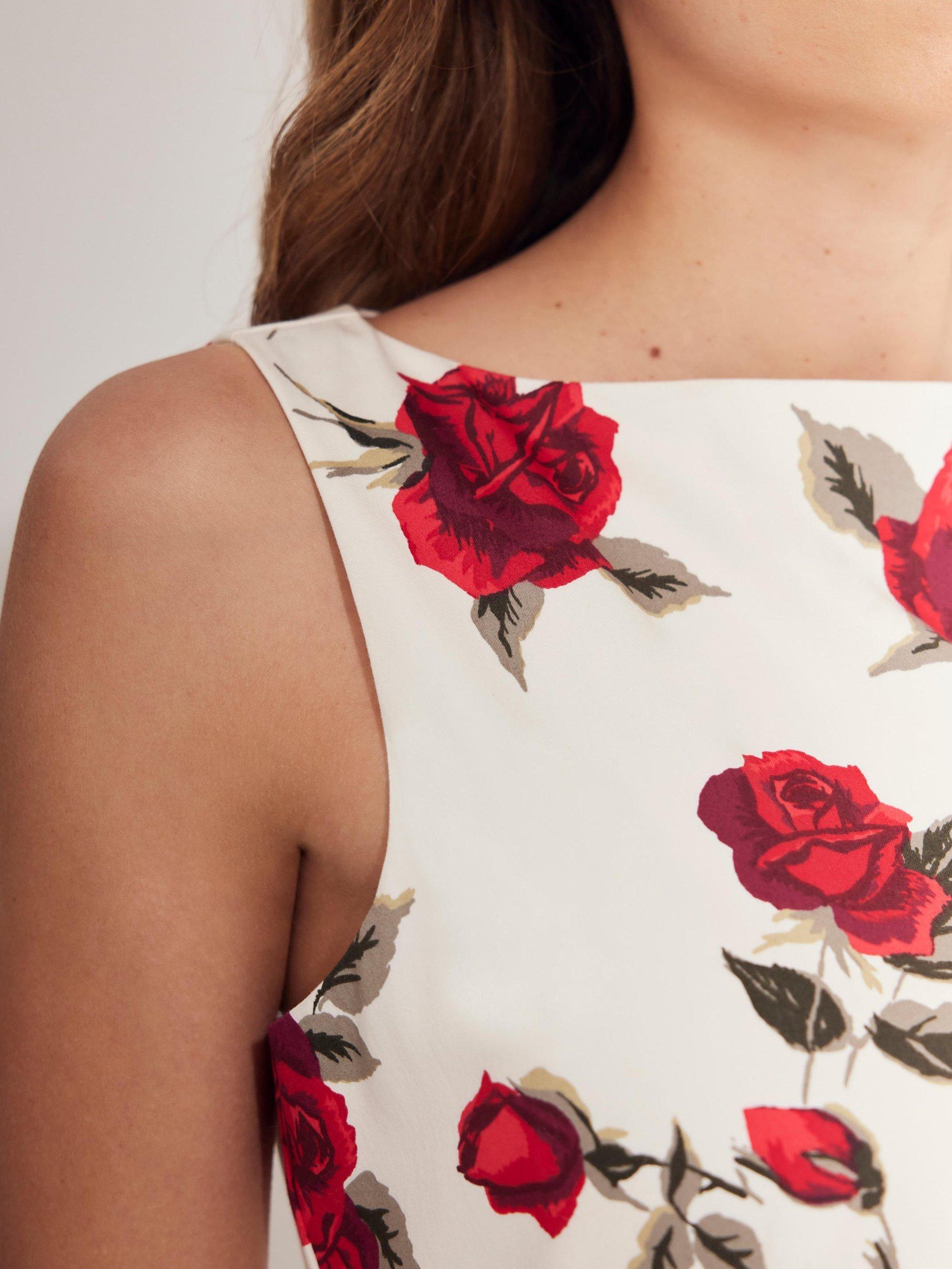 A rose print sleeveless dress in a midi silhouette with a crew neckline, rear split and zip fastening through the back.