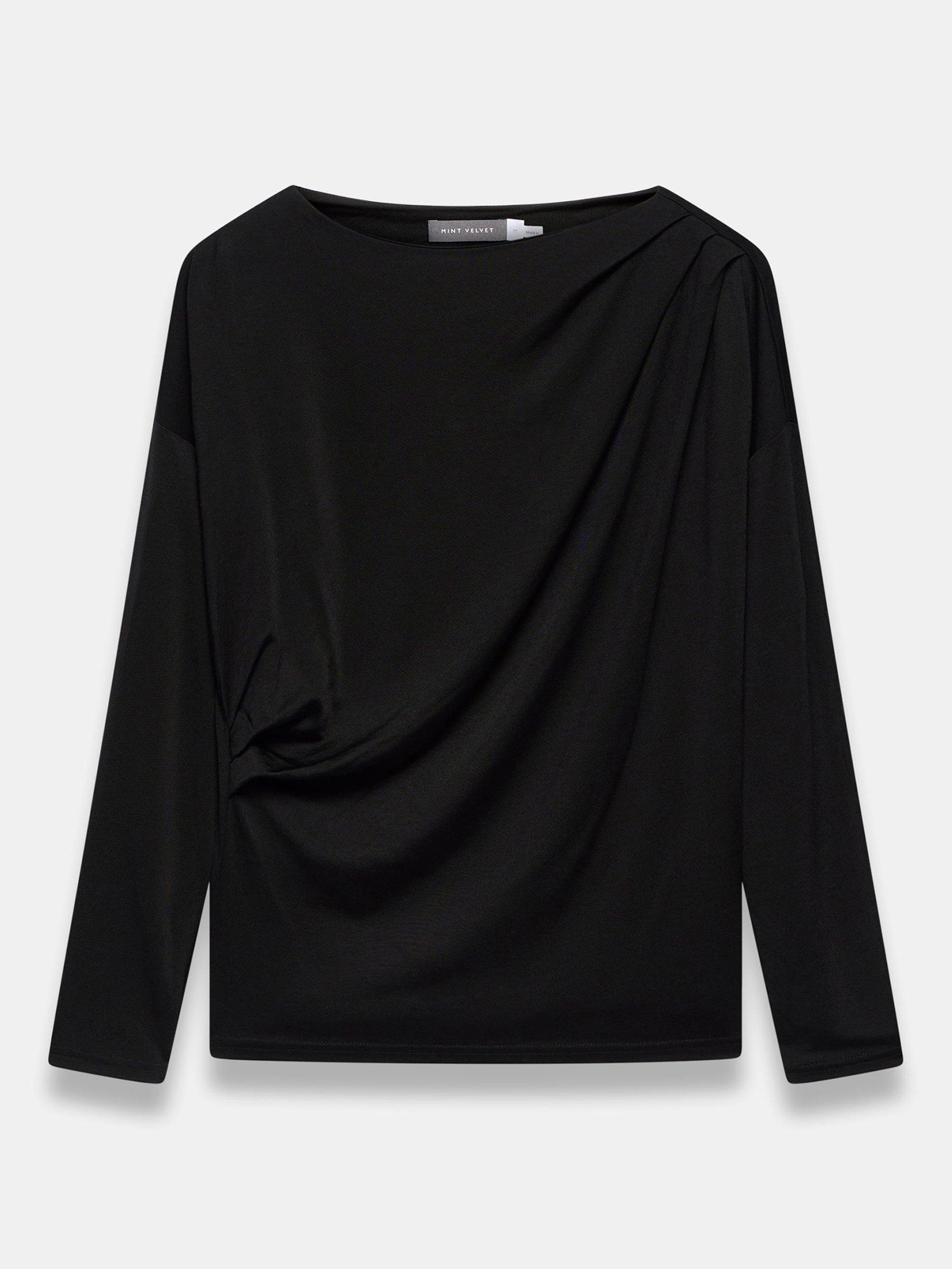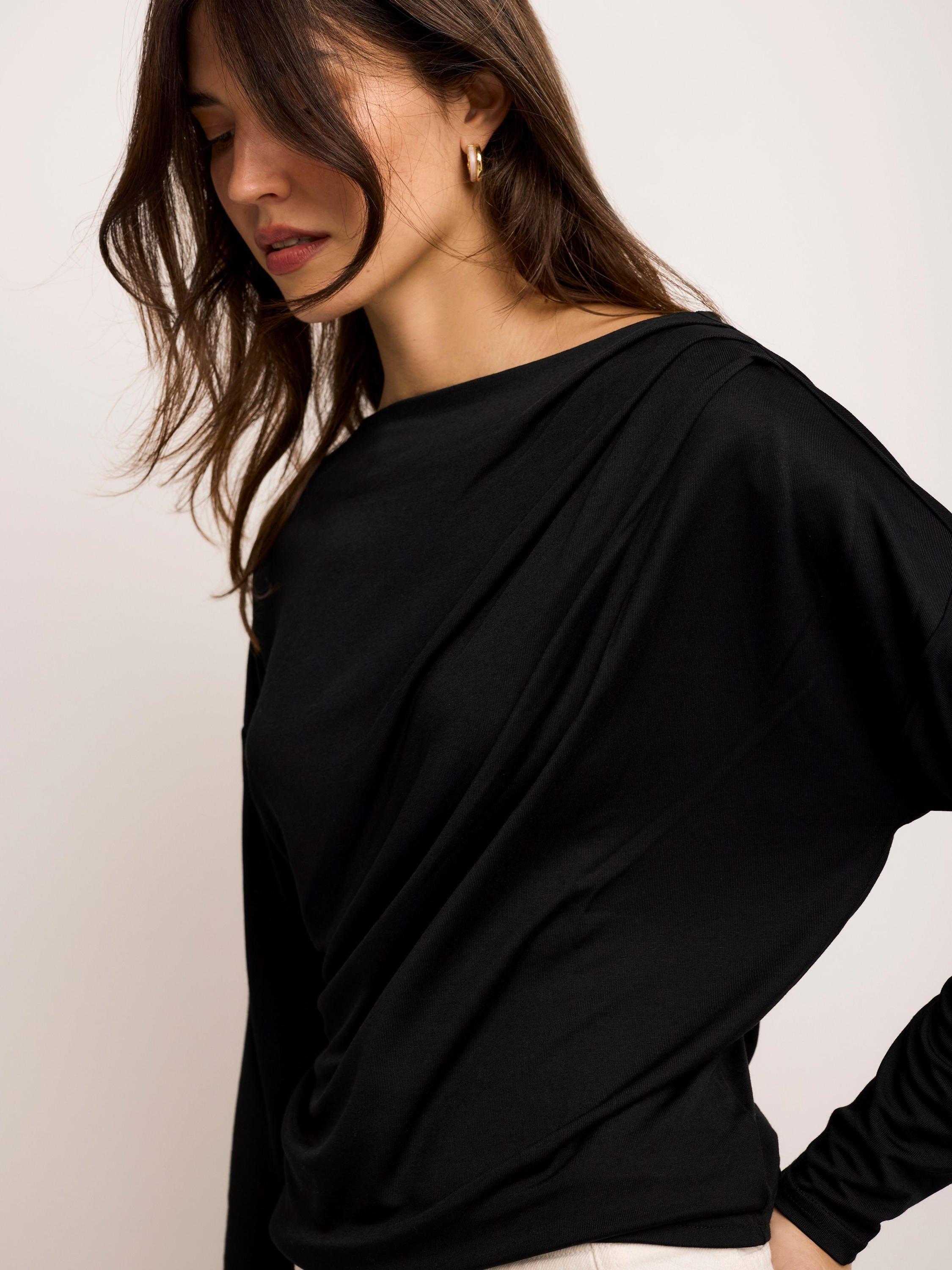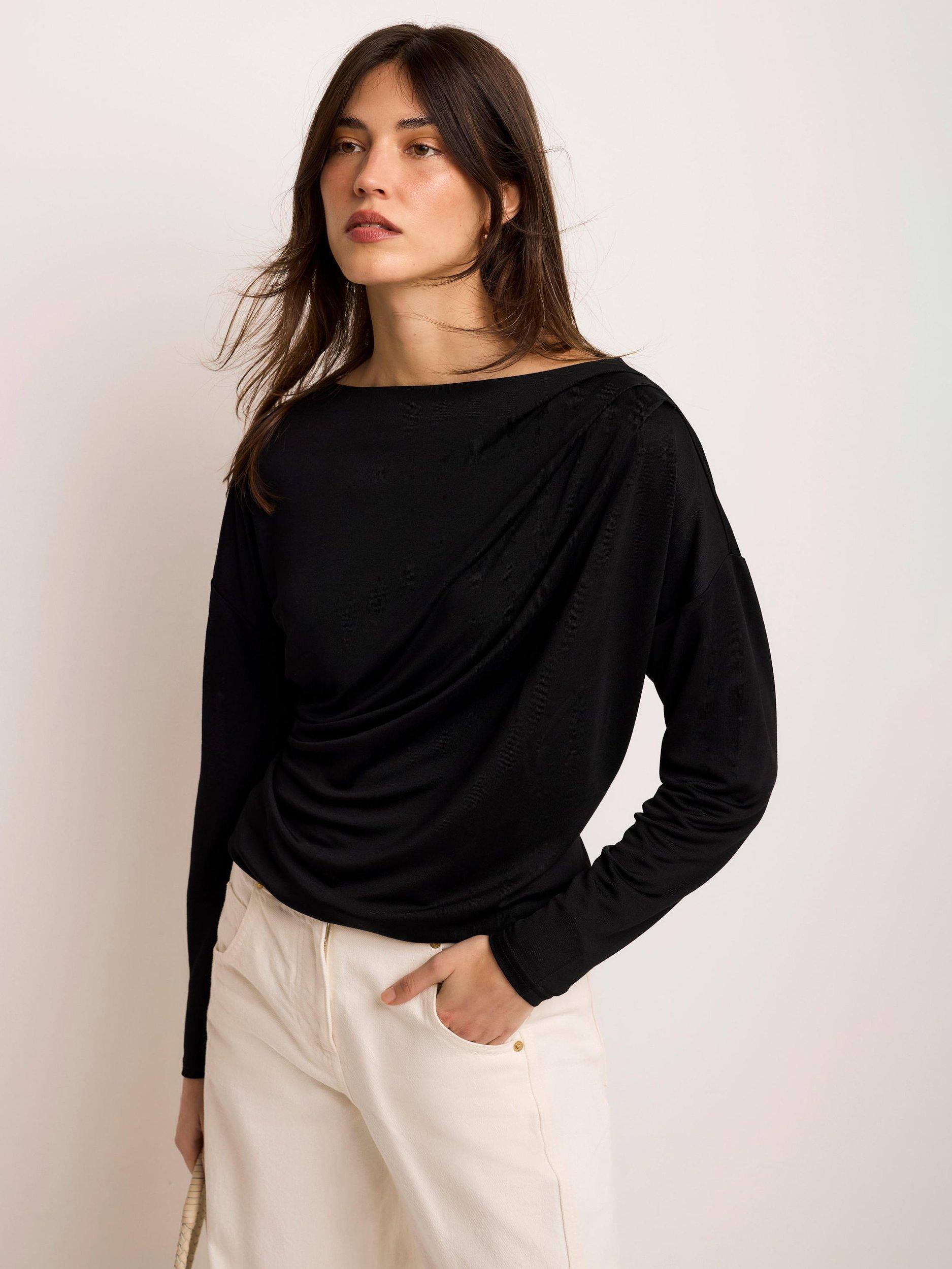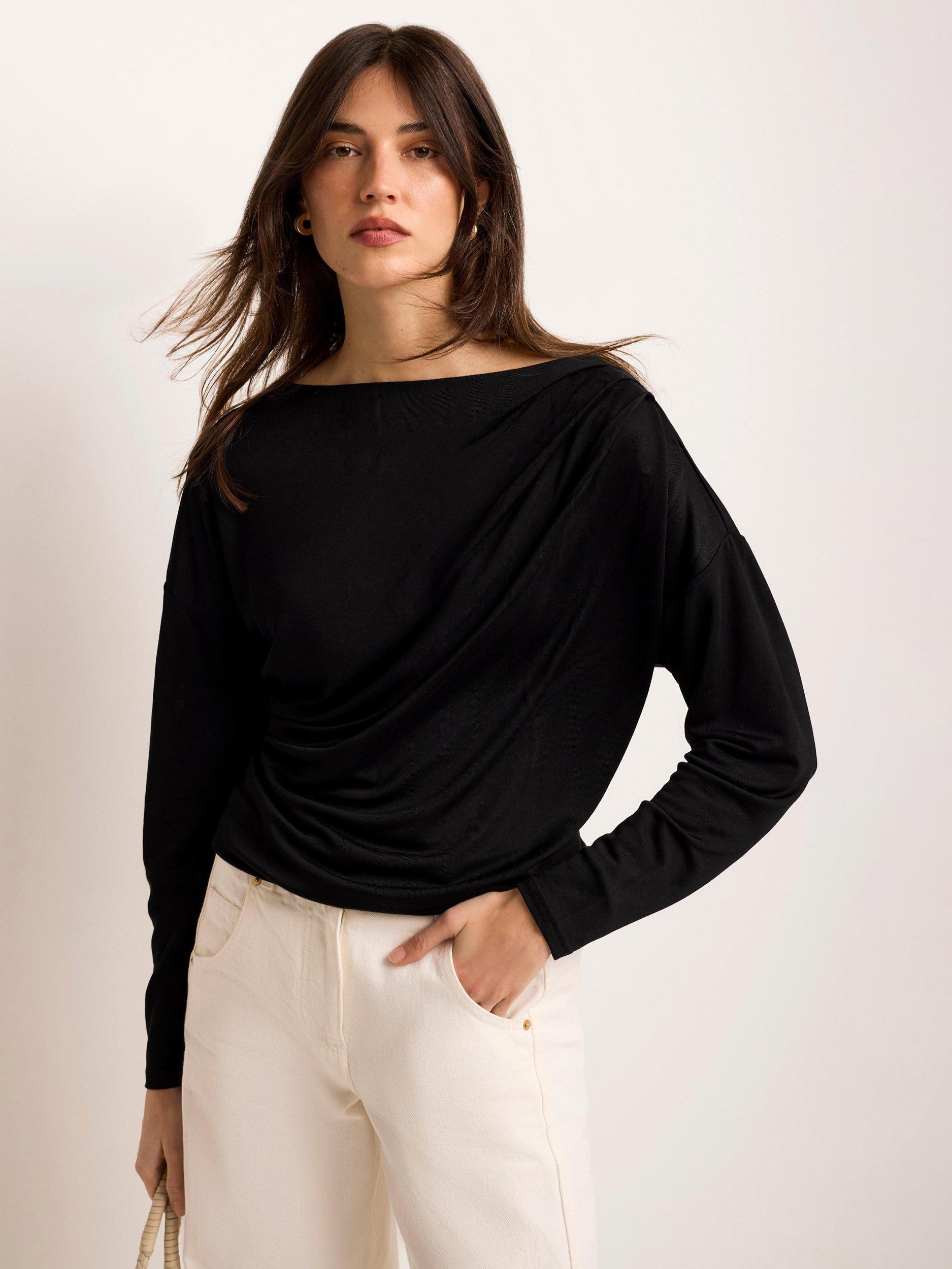 A lightweight top featuring a slash neckline, ruched detailing and long sleeves.