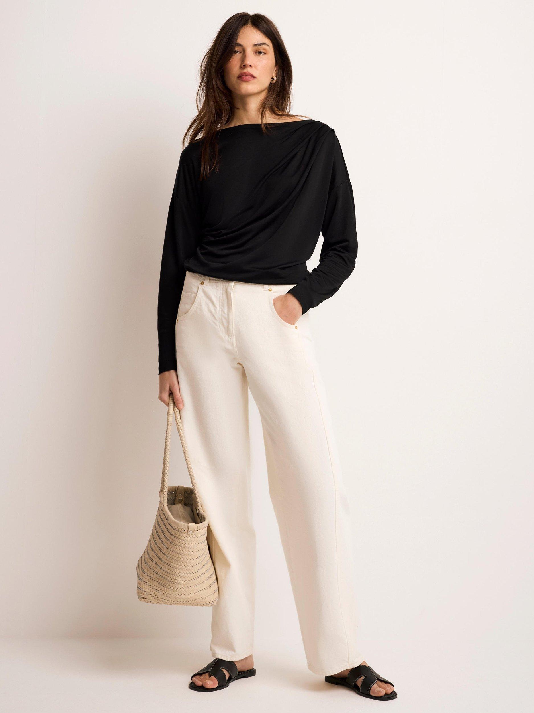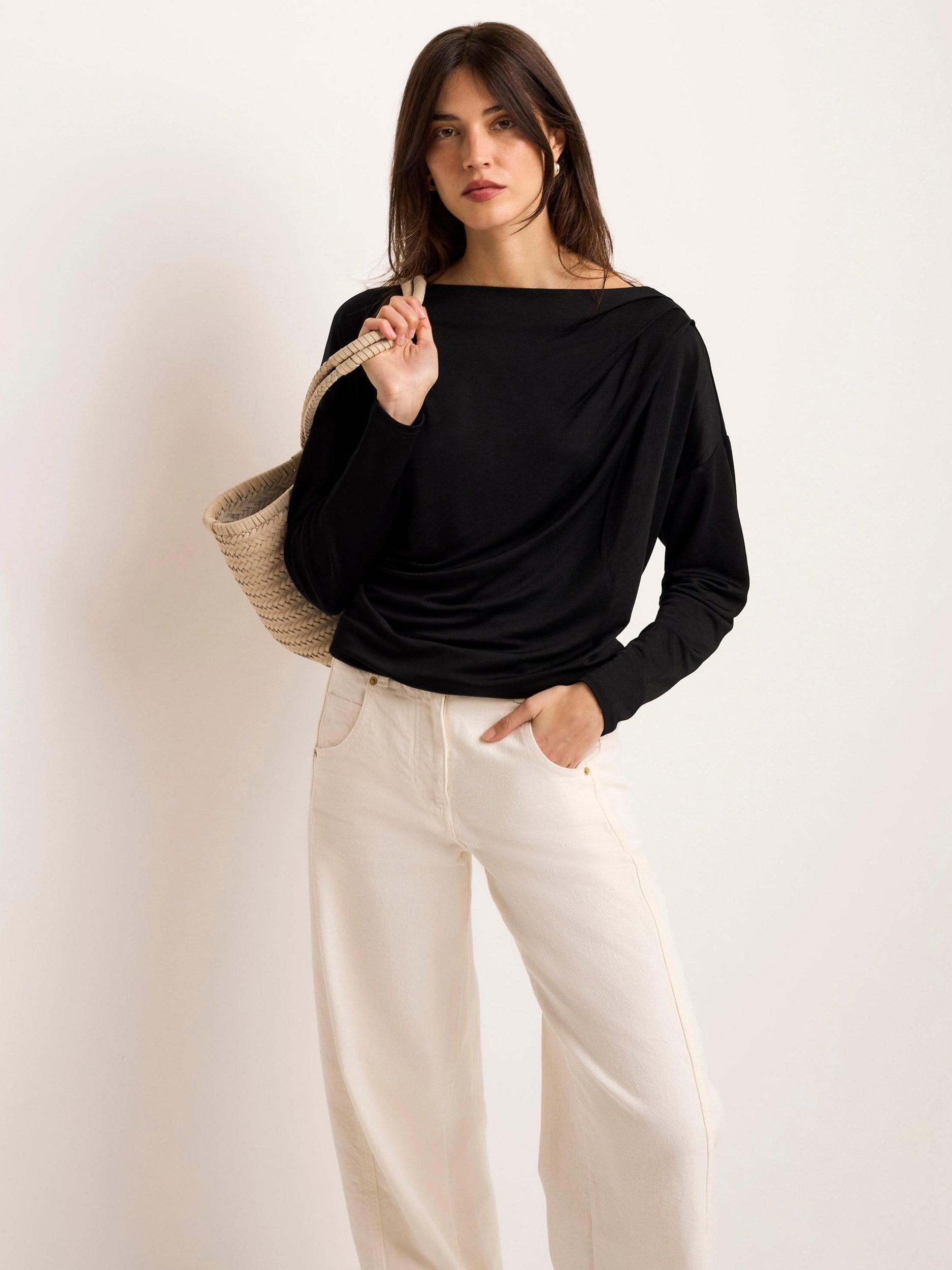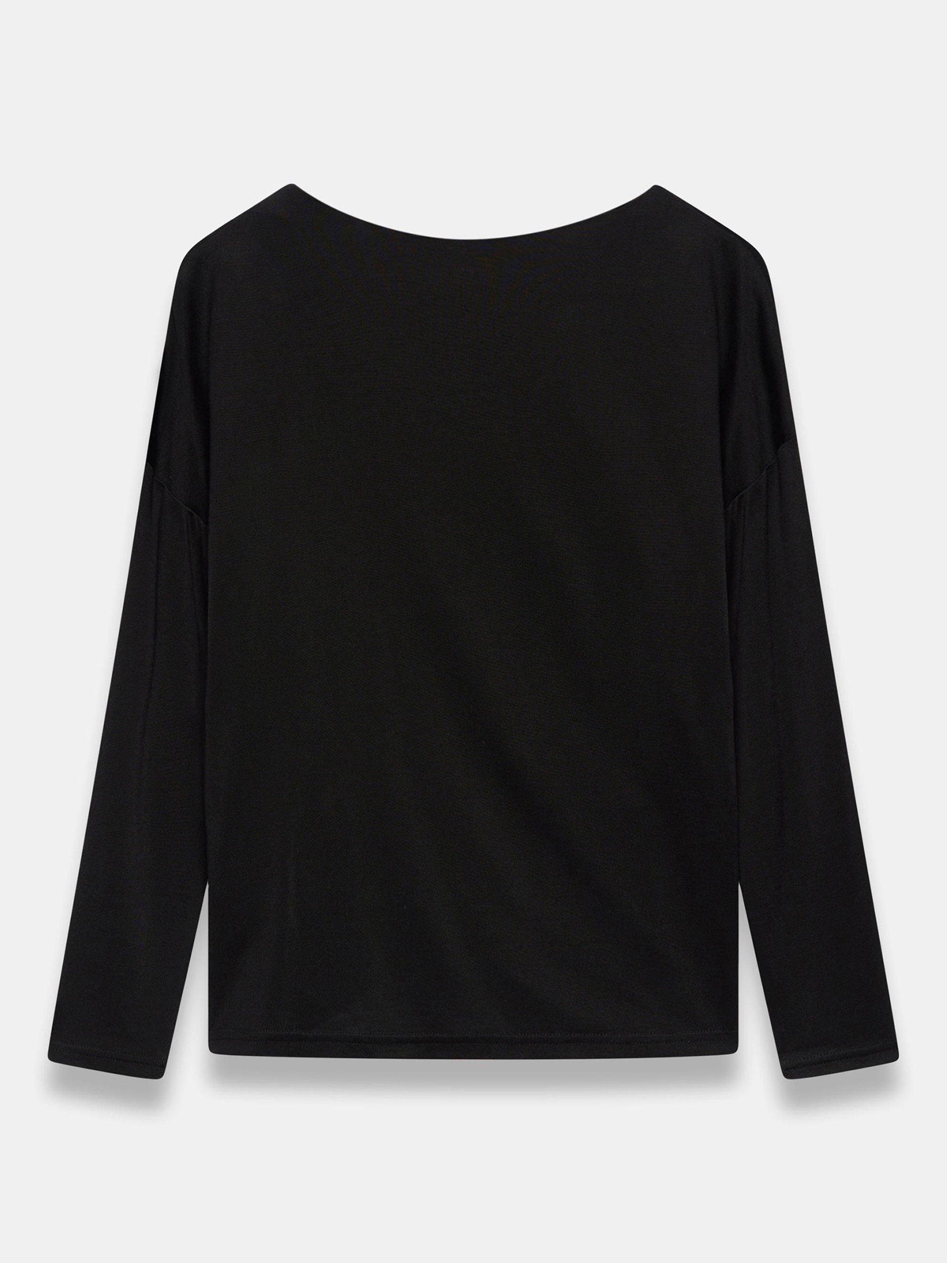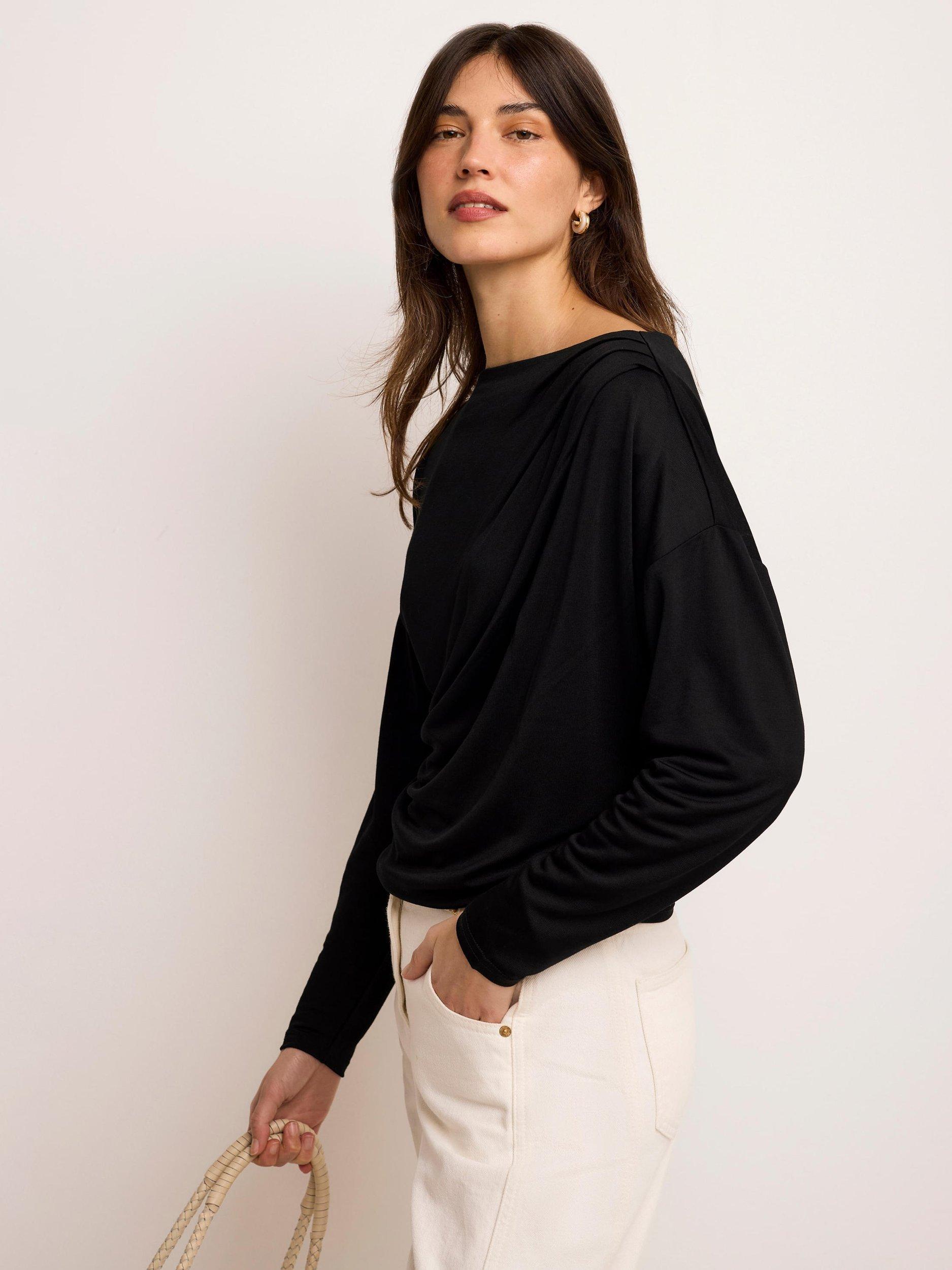 A lightweight top featuring a slash neckline, ruched detailing and long sleeves.