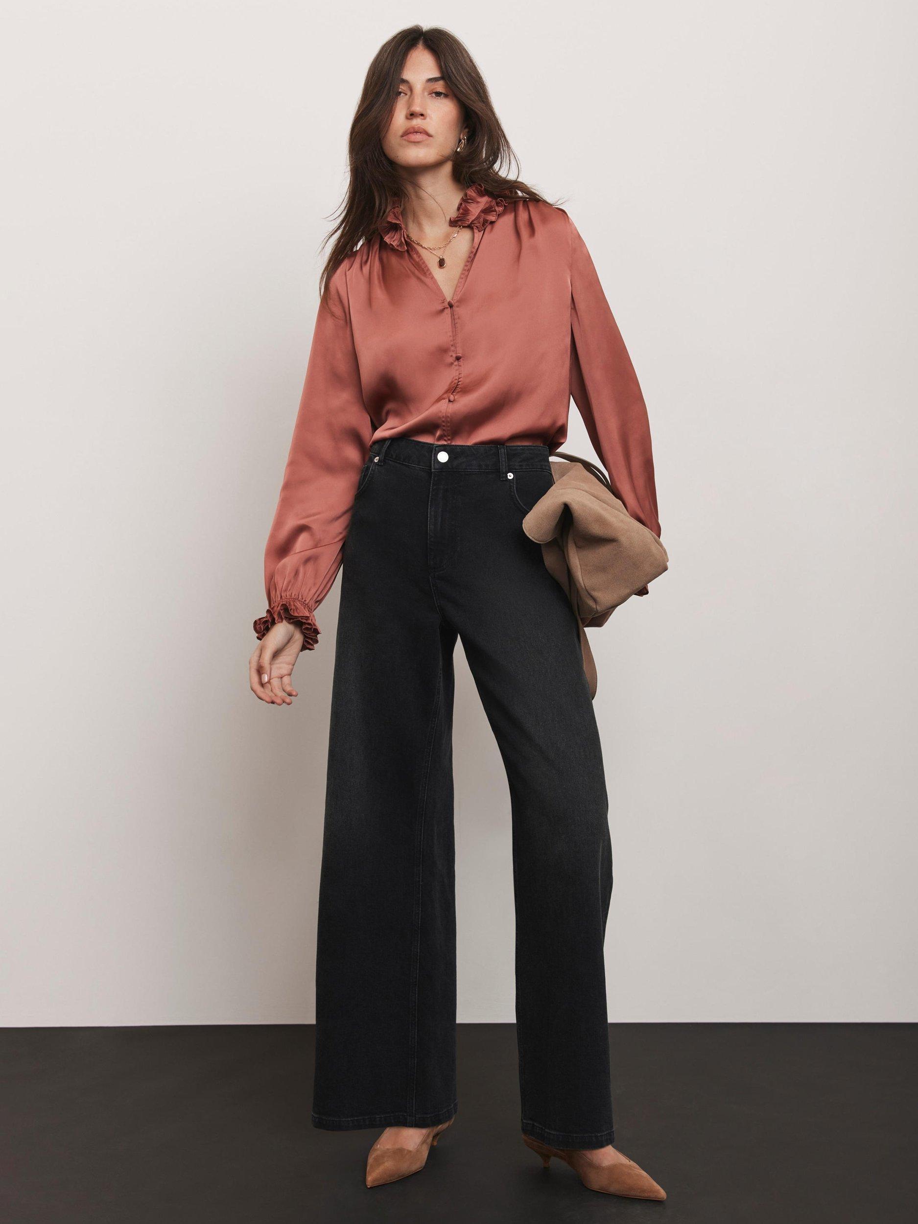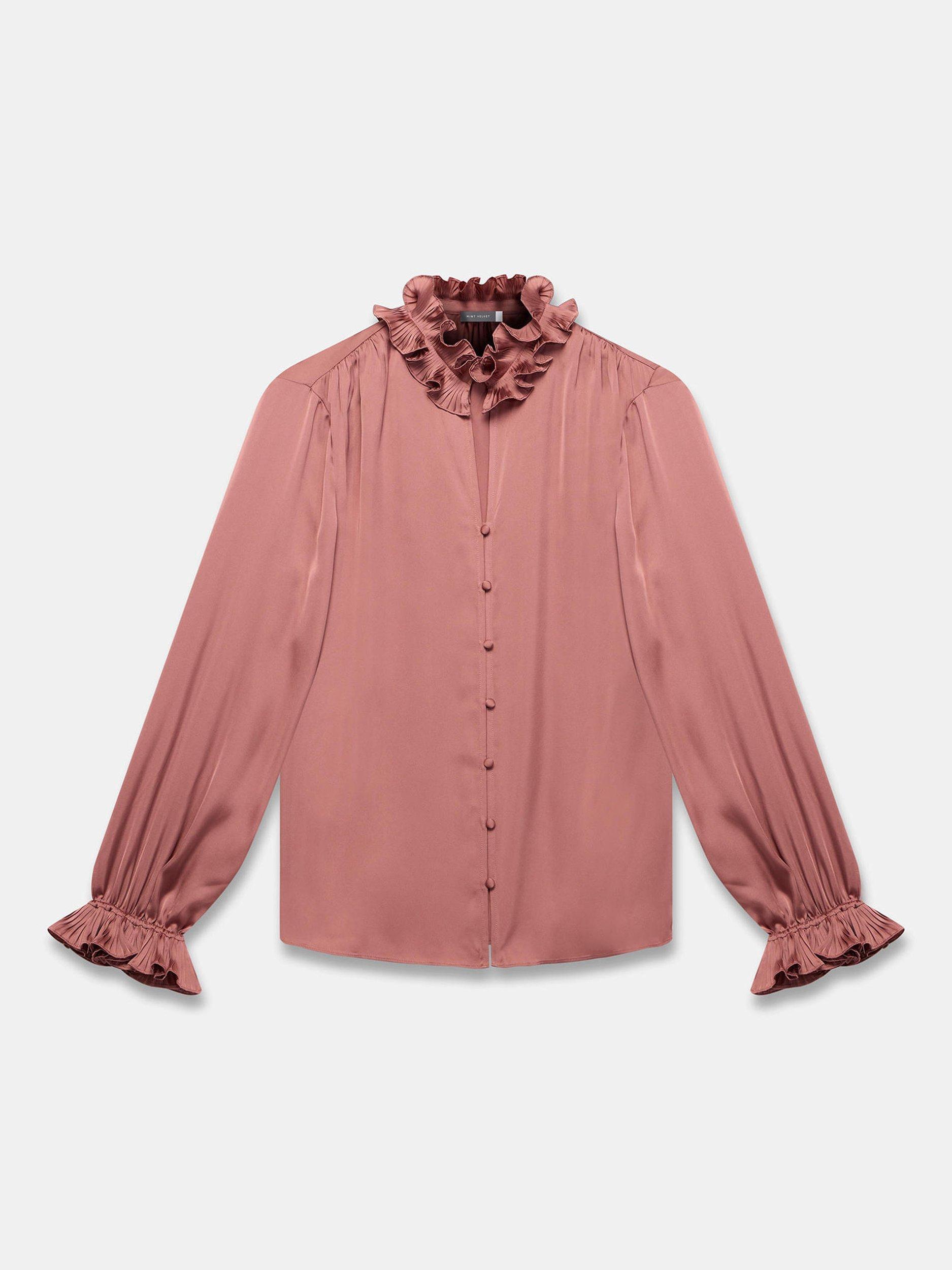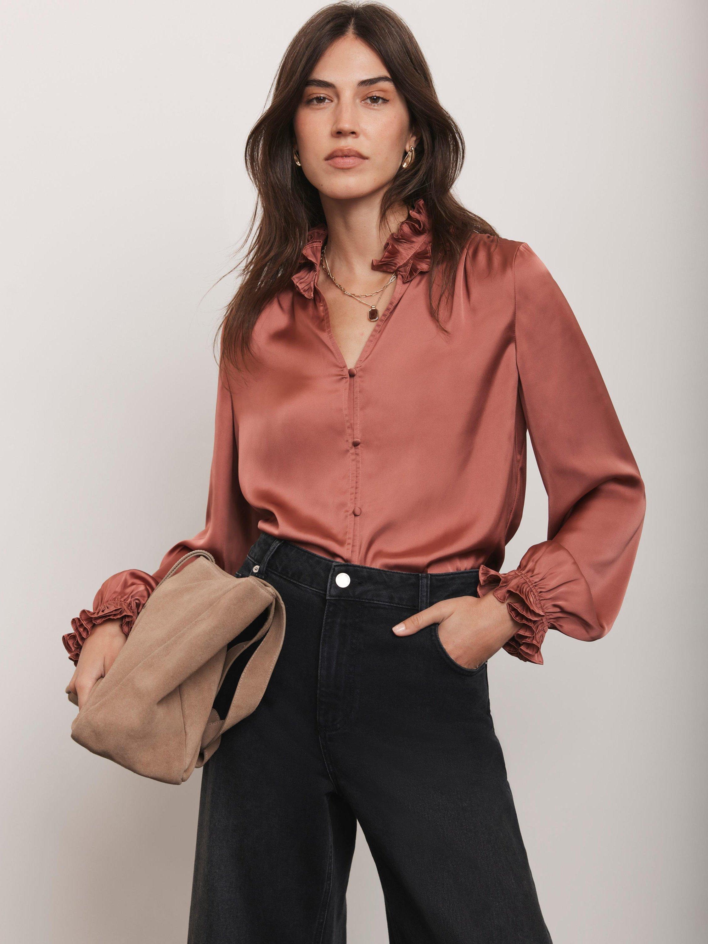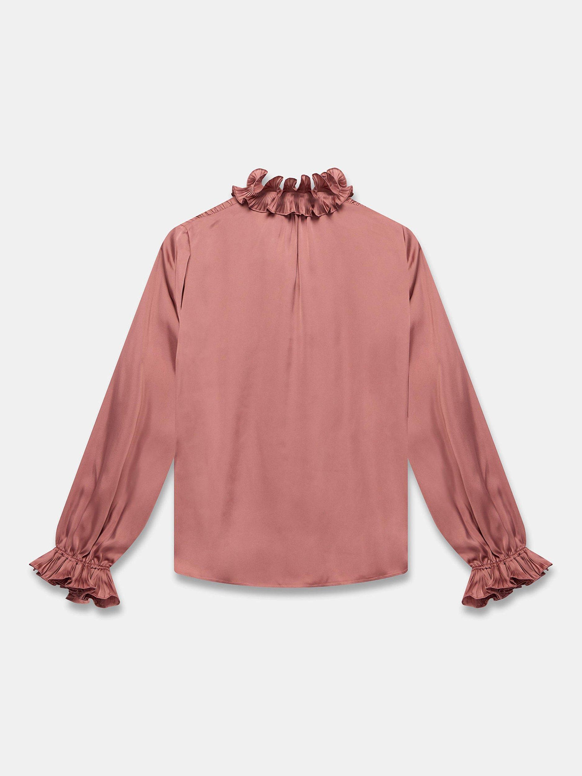 A satin blouse with a V-neckline featuring a ruffle high collar, long sleeves, elasticated ruffle cuffs with button fastenings through the front.