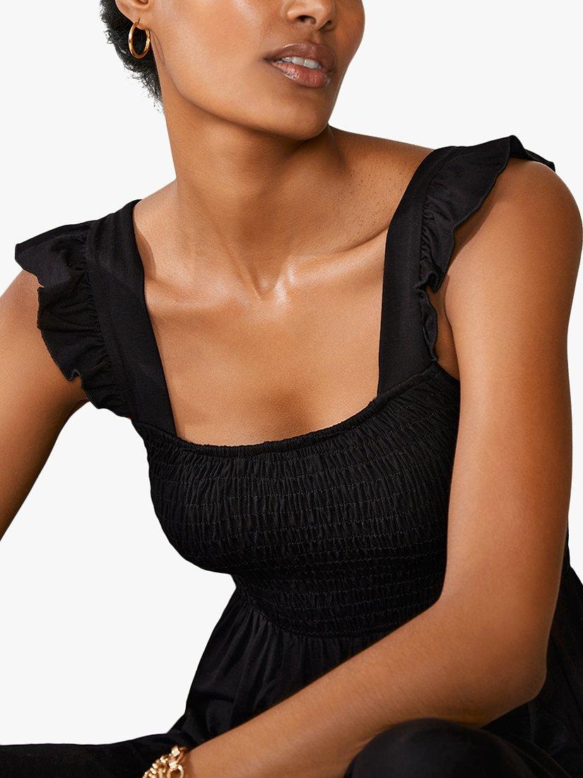 Cut from Mint Velvet's finest jersey, this jumpsuit is both flattering and polished, as well as extremely comfortable. It's designed with a smocked bodice for extra stretch and falls to a wide-leg hem. Finished with wide straps with ruffles for a feminine touch, pair yours with sandals and a basket bag for a sleek summer look.