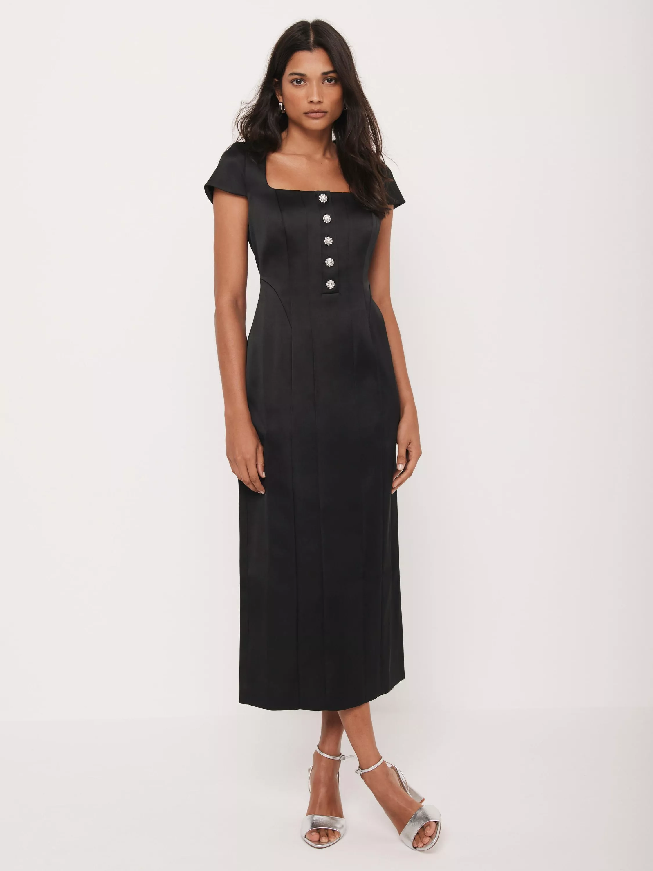 Black dress in a midi silhouette featuring a square neckline, cap sleeves, diamanté buttons and a zip fastening through the back.