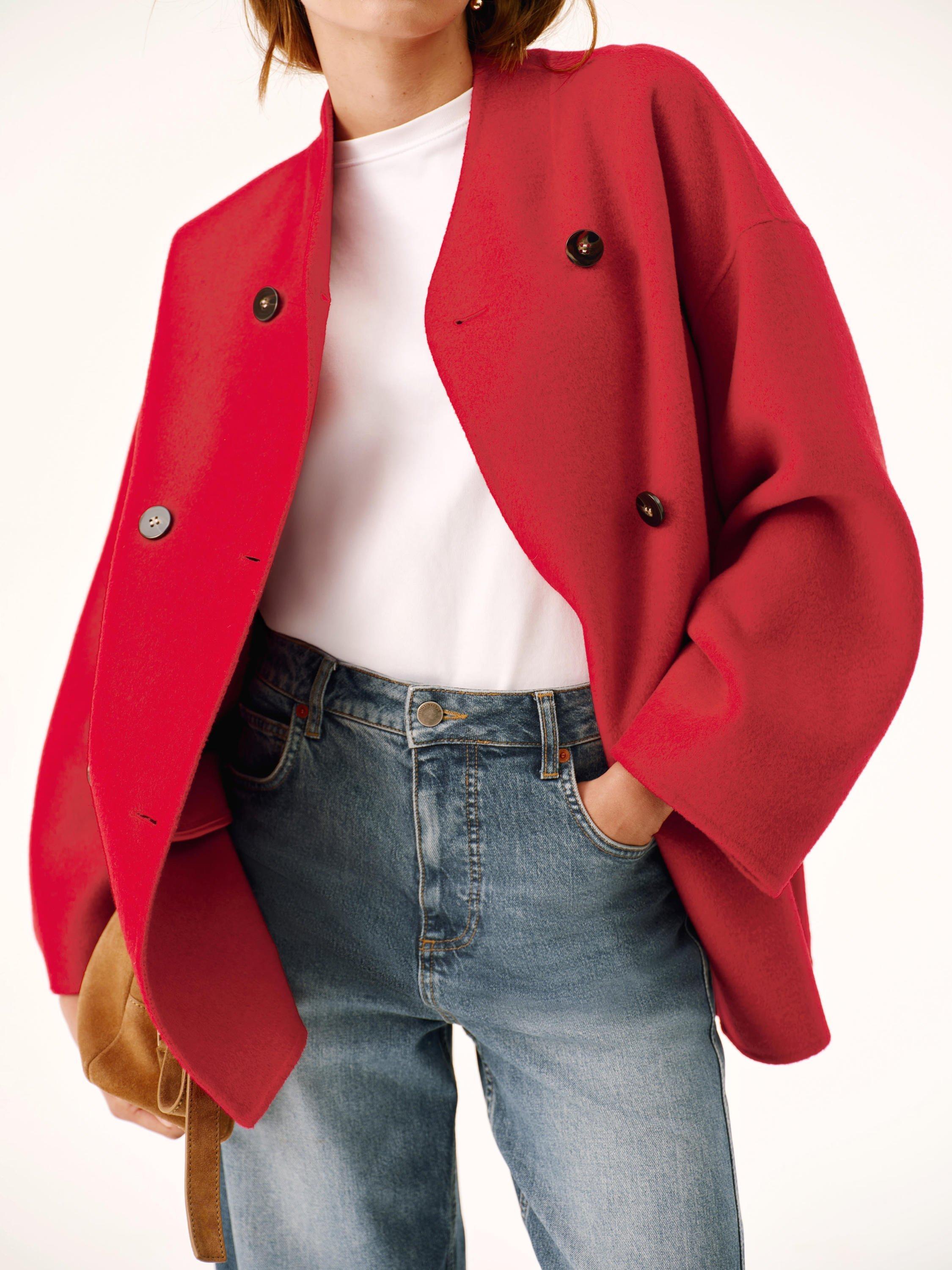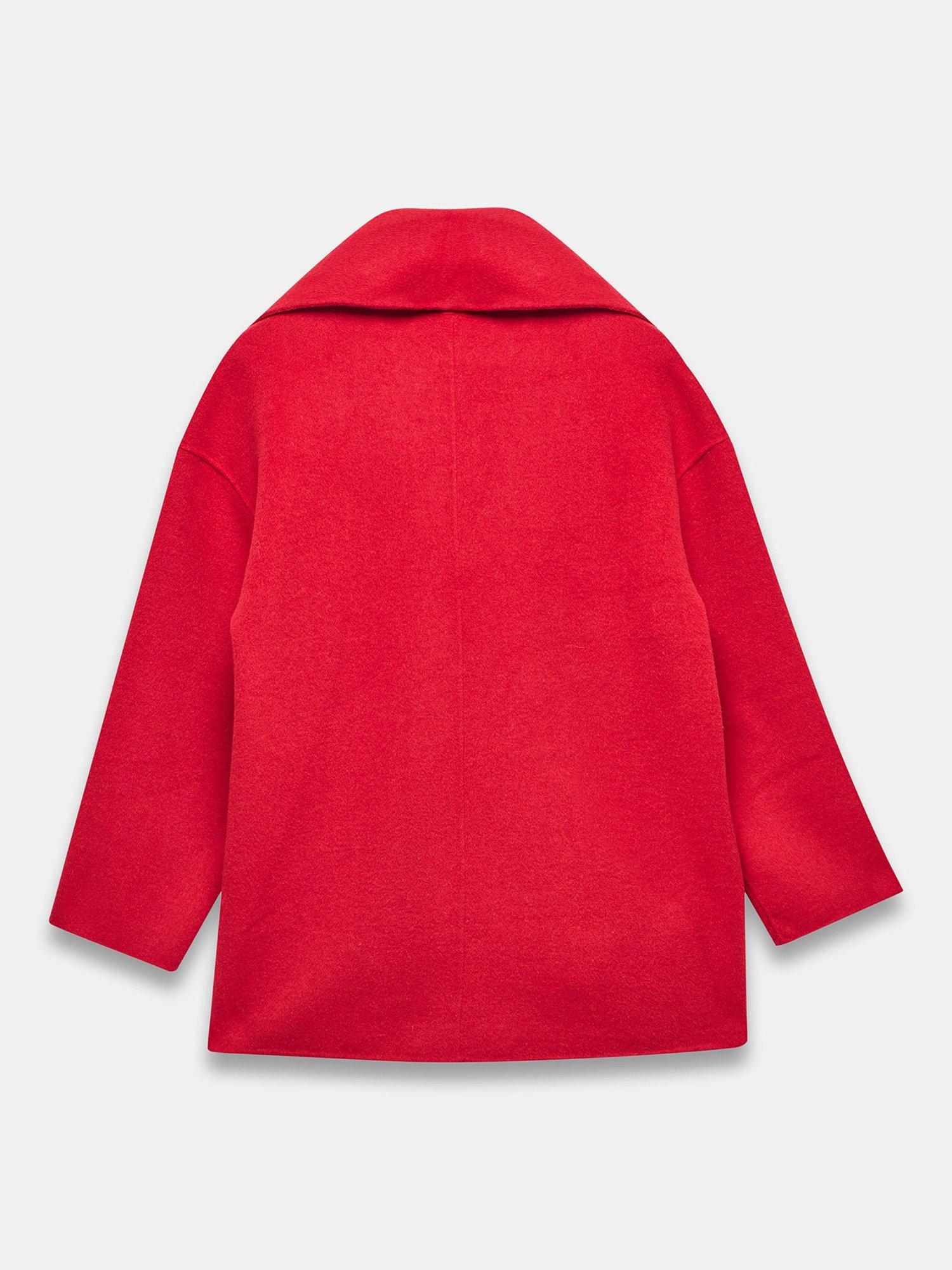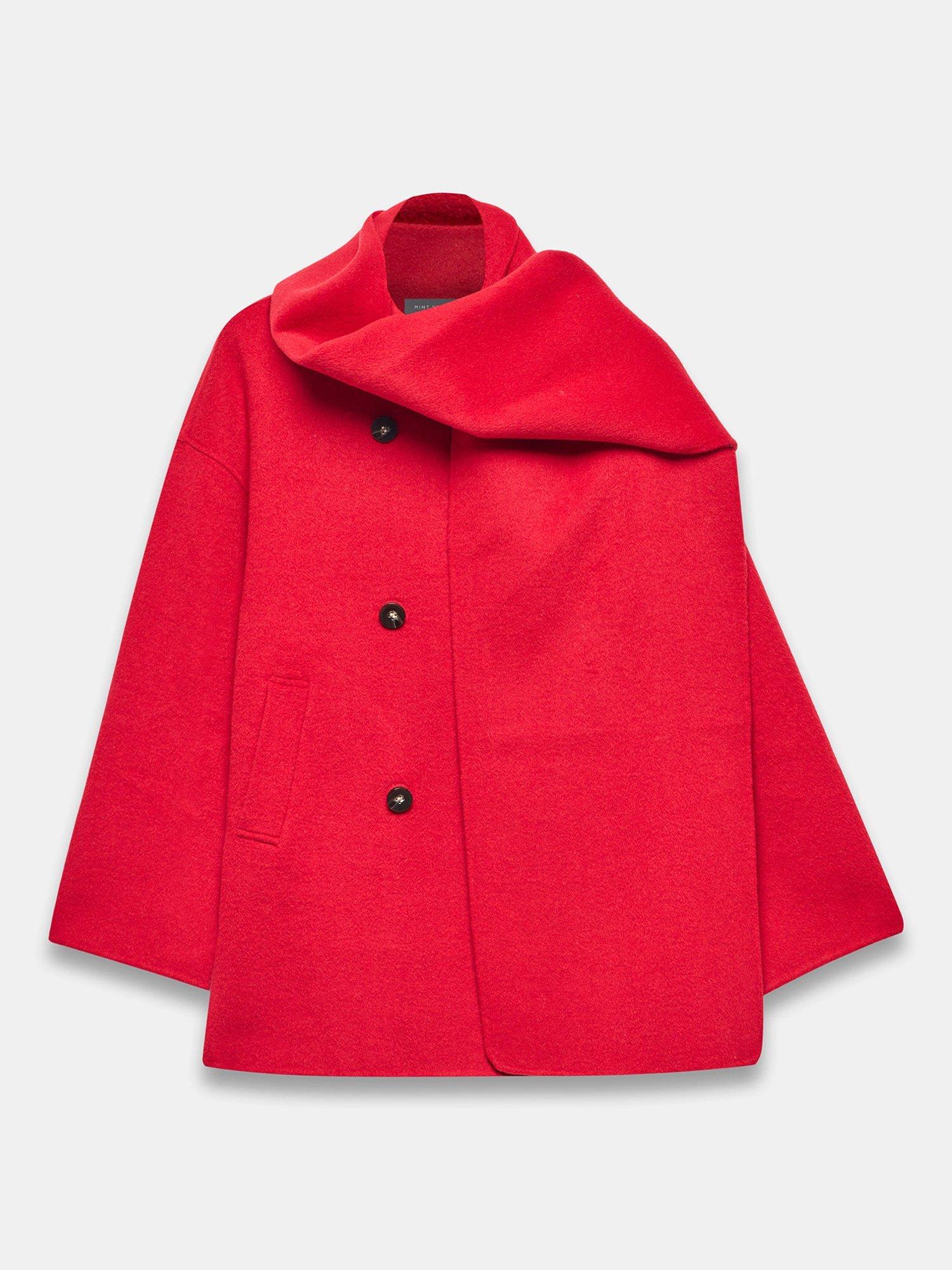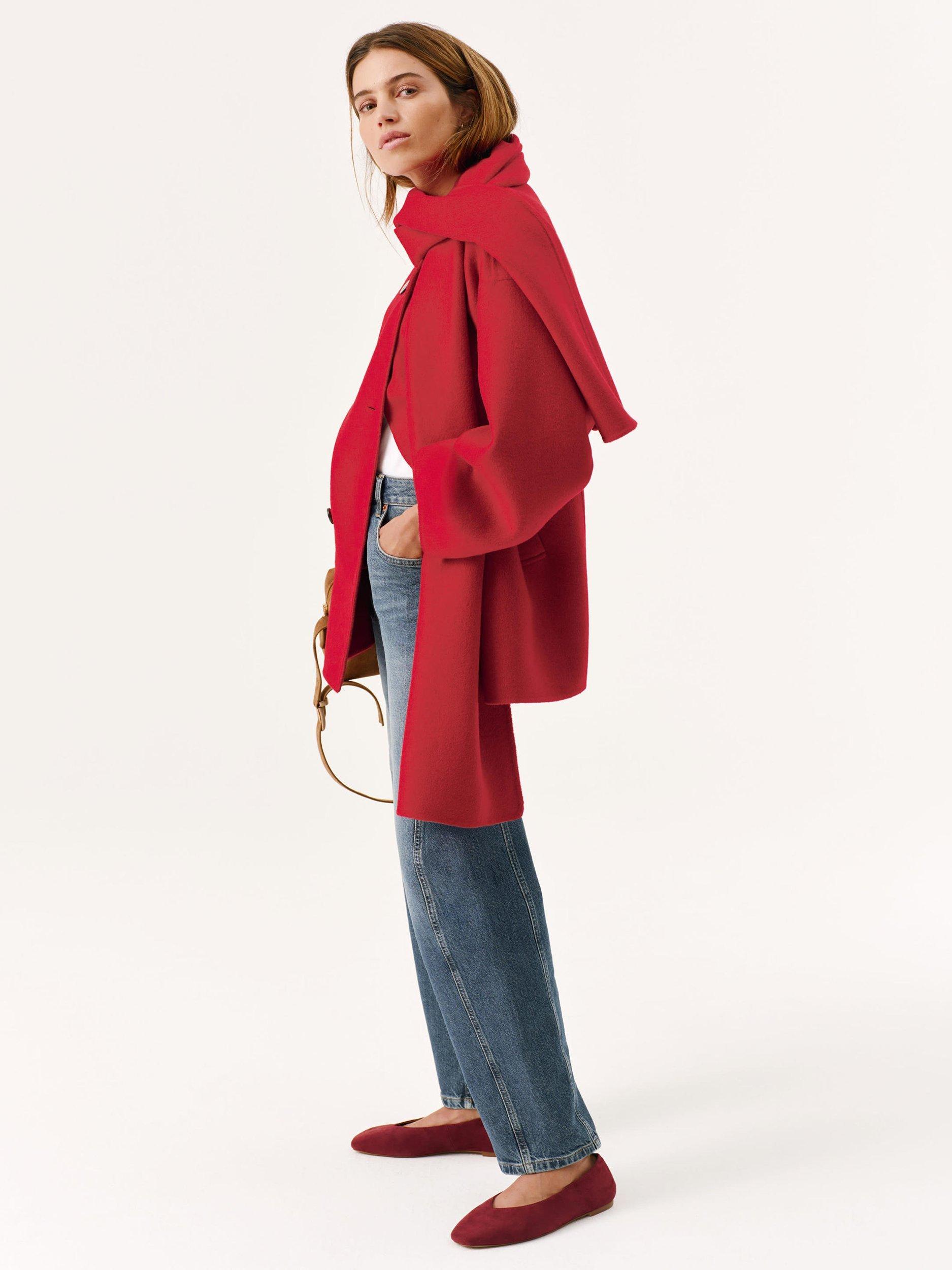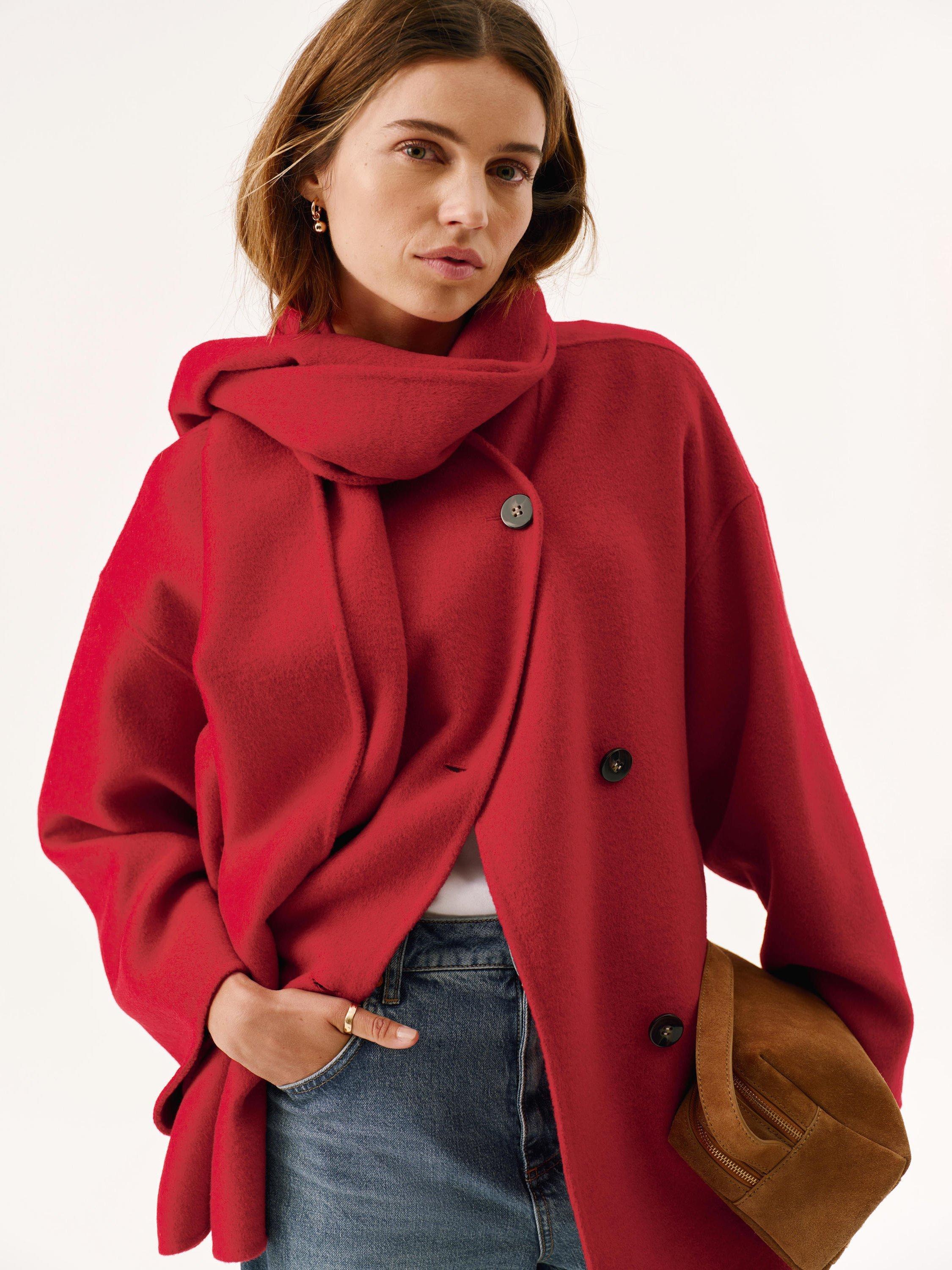 A wool blend coat with a V-neckline, built-in scarf, long sleeves, welt pocket and button fastening through the front.