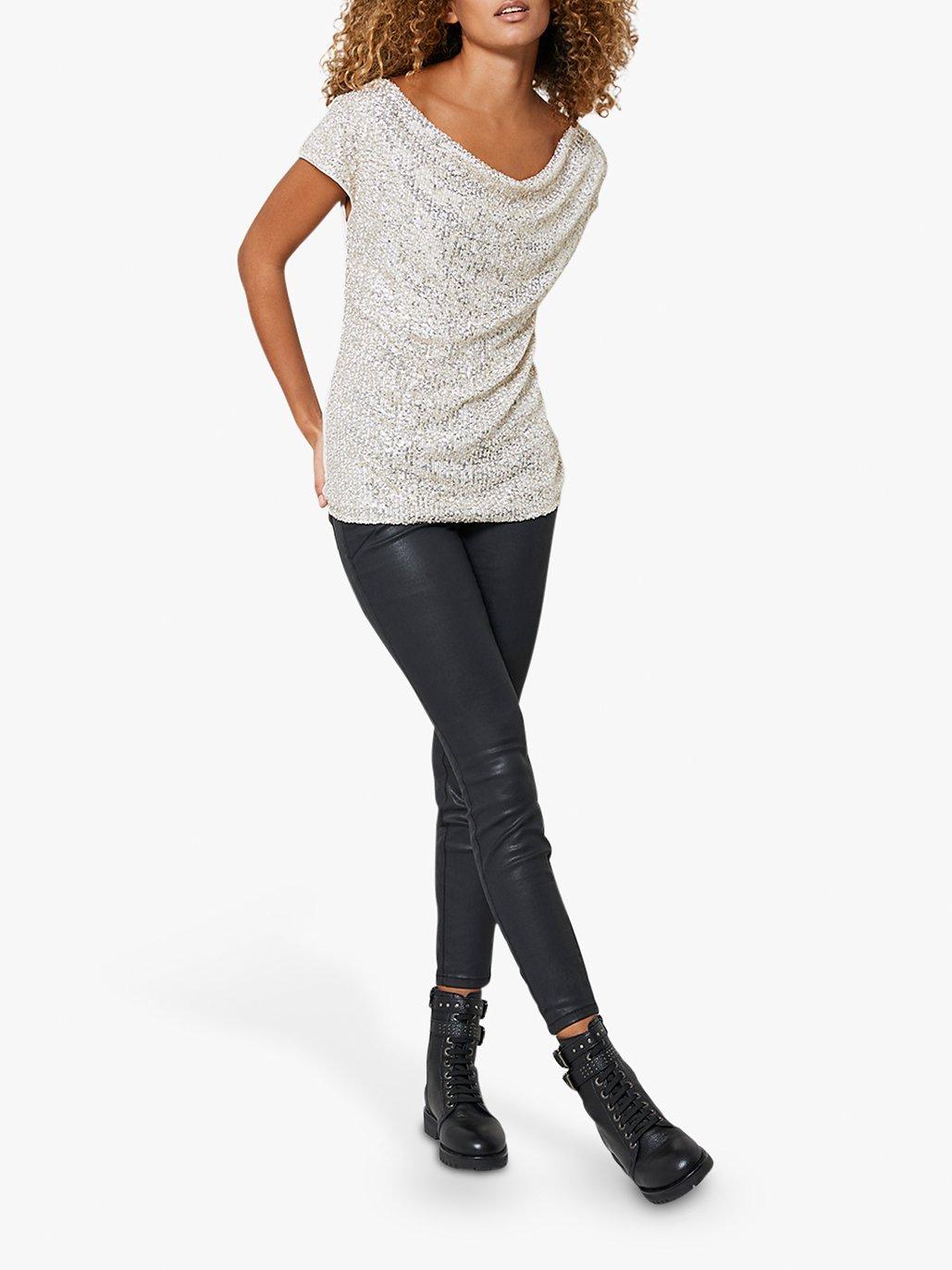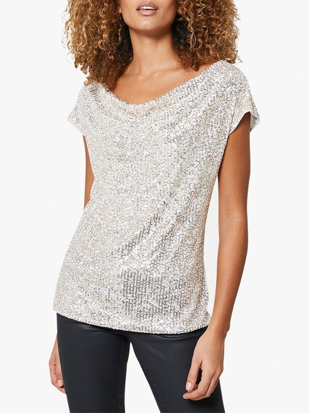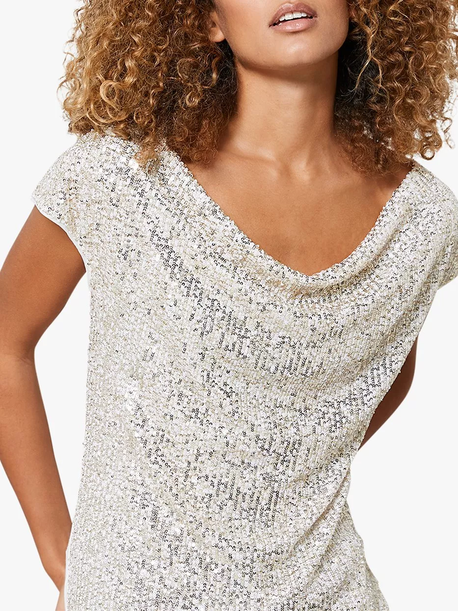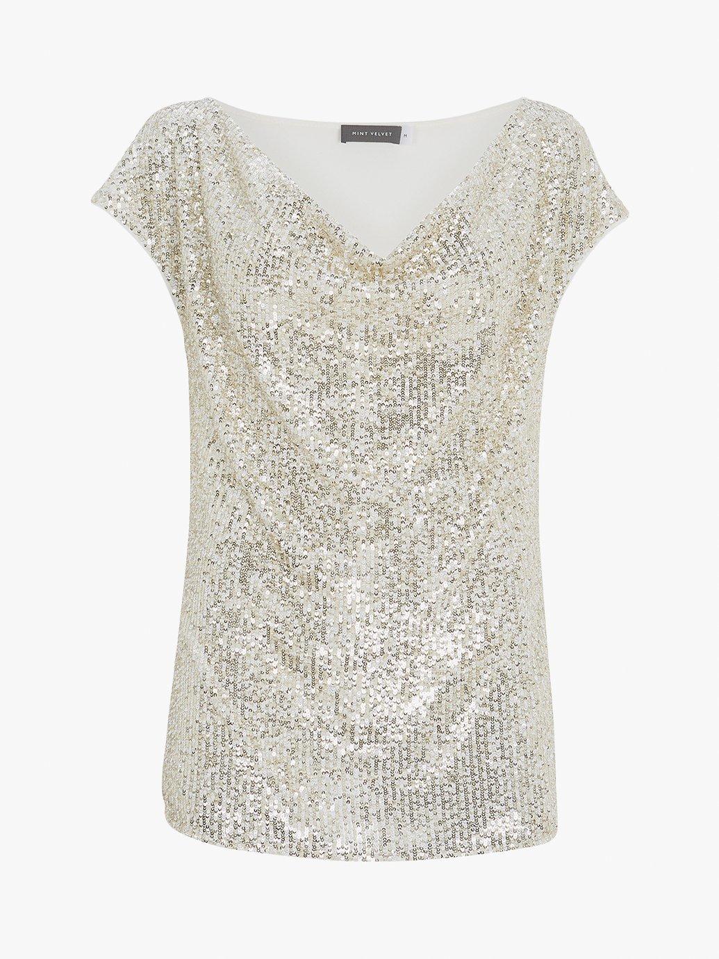 Embellished all over the front with pewter-like sequins, this short-sleeved top from Mint Velvet offers dazzling appeal. It's framed by a flattering cowl neckline and has a contrasting jersey back panel for comfort.