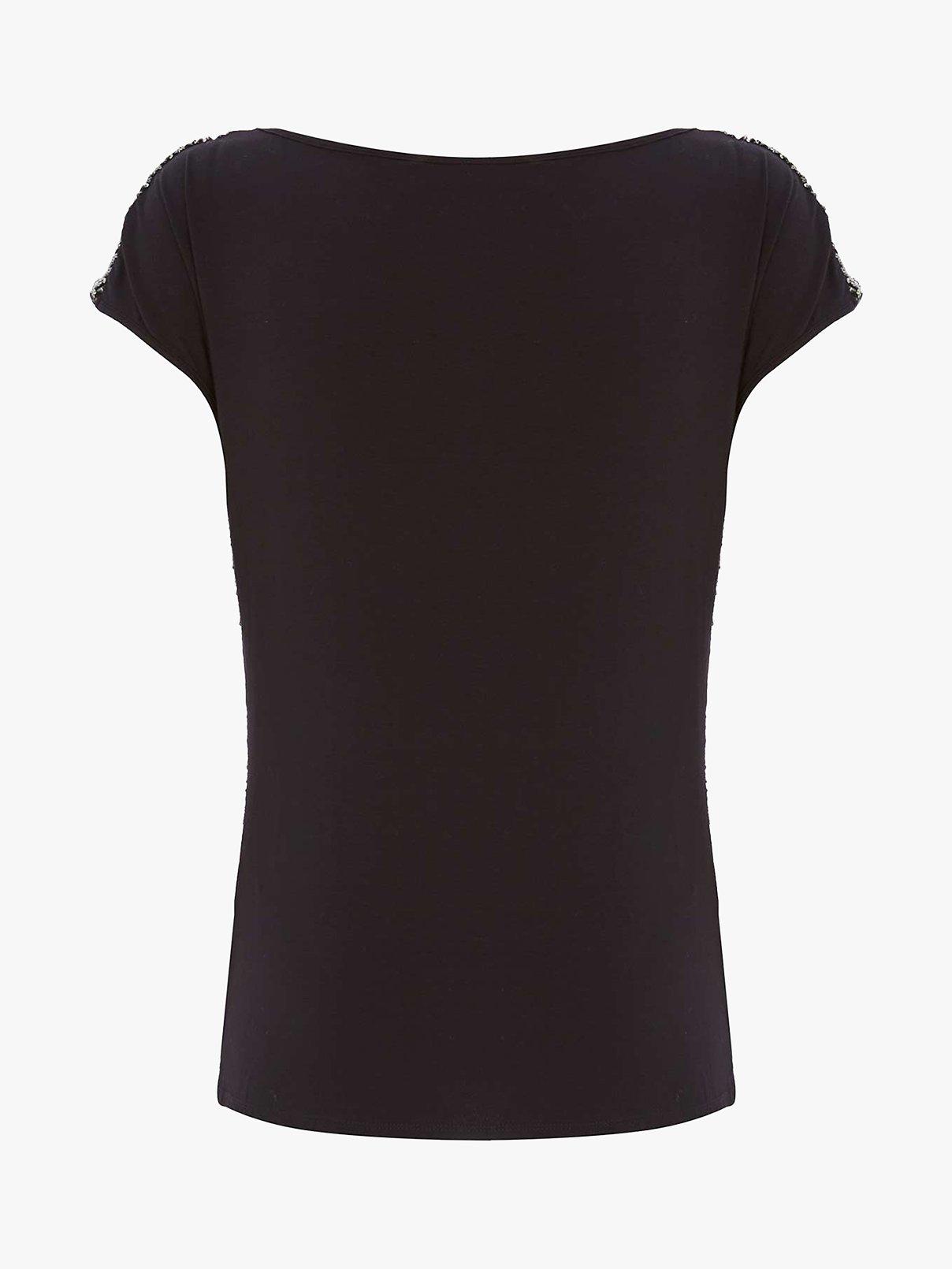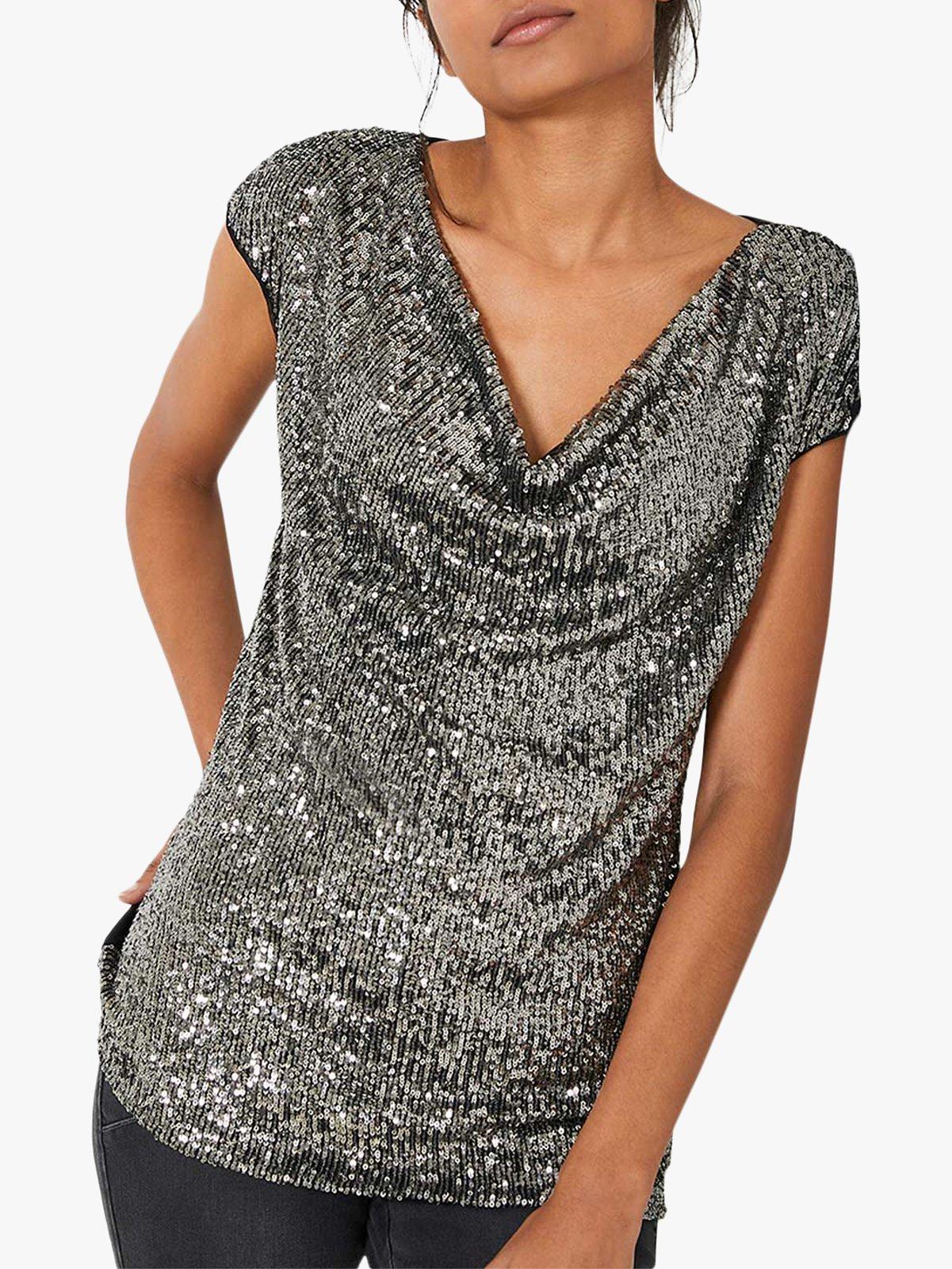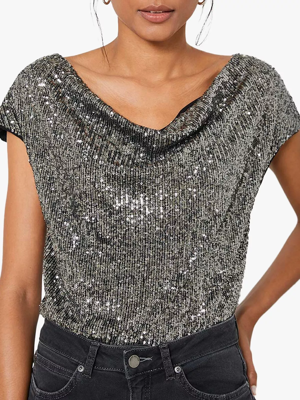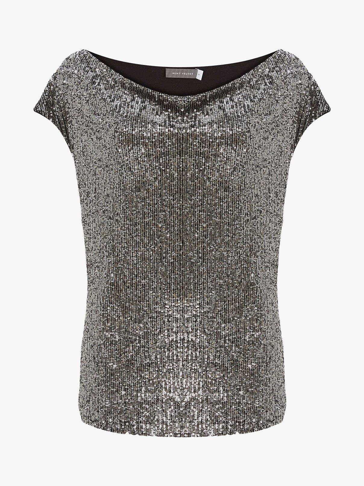 Embellished all over the front with pewter-like sequins, this short-sleeved top from Mint Velvet offers dazzling appeal. It's framed by a flattering cowl neckline and has a contrasting jersey back panel for comfort.