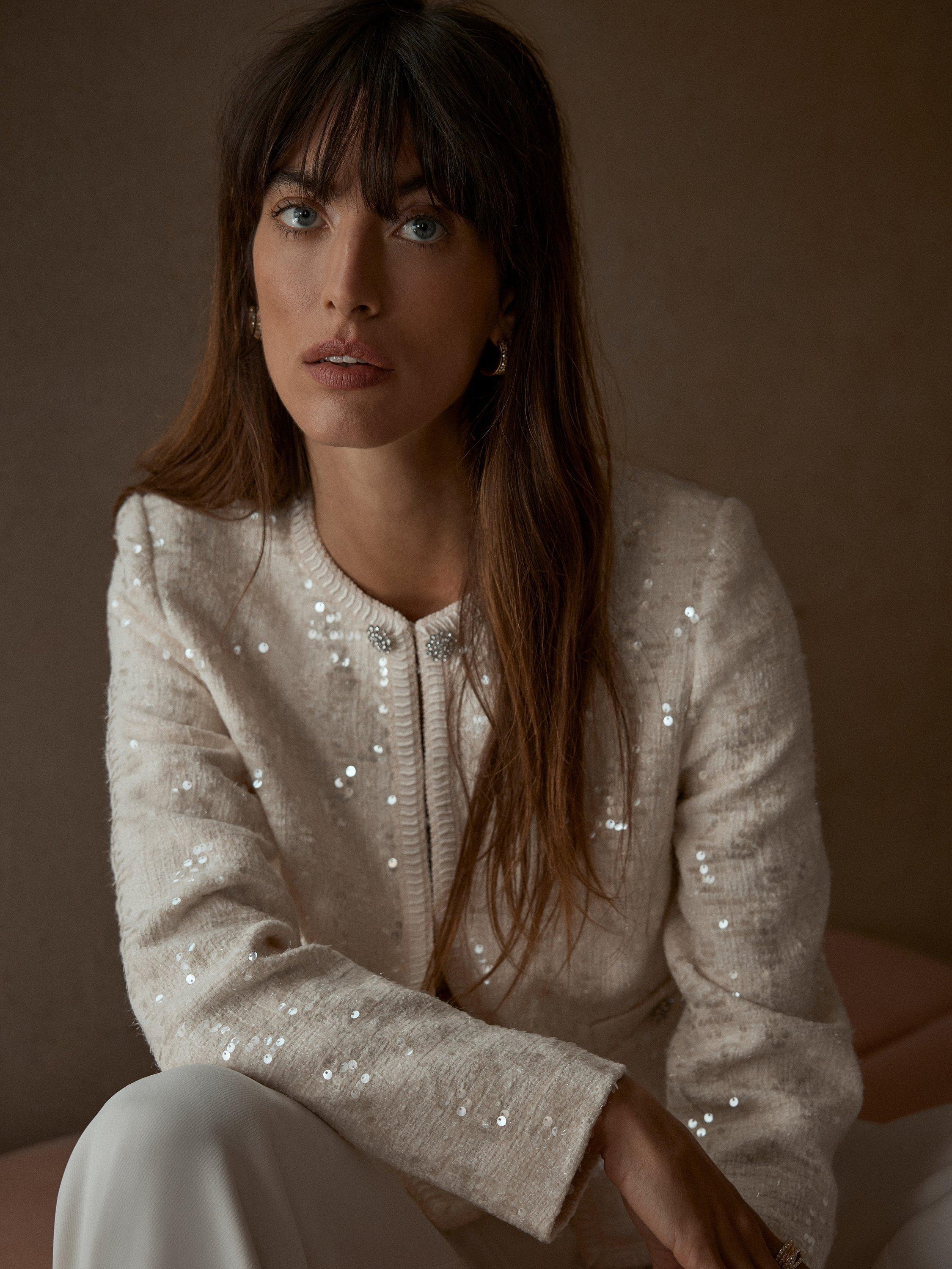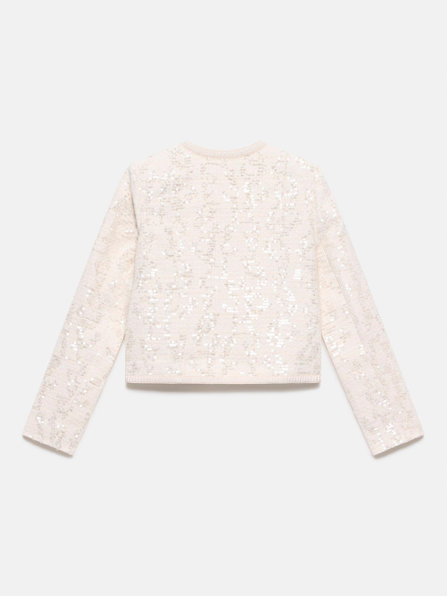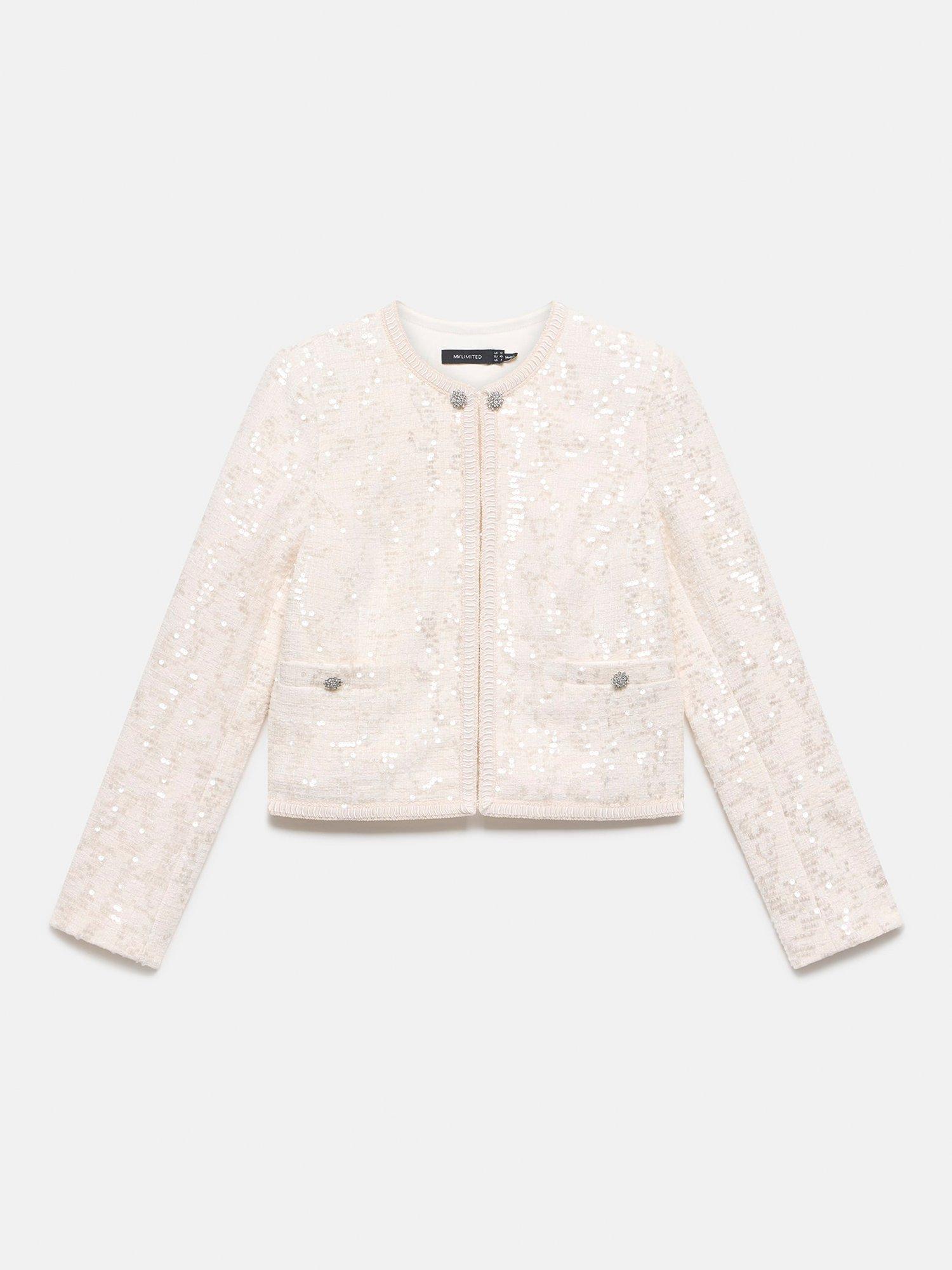 A chic sequin jacket with a crew neckline, long sleeves, crystal detail buttons, welt pockets with a hook and eye fastening through the front.