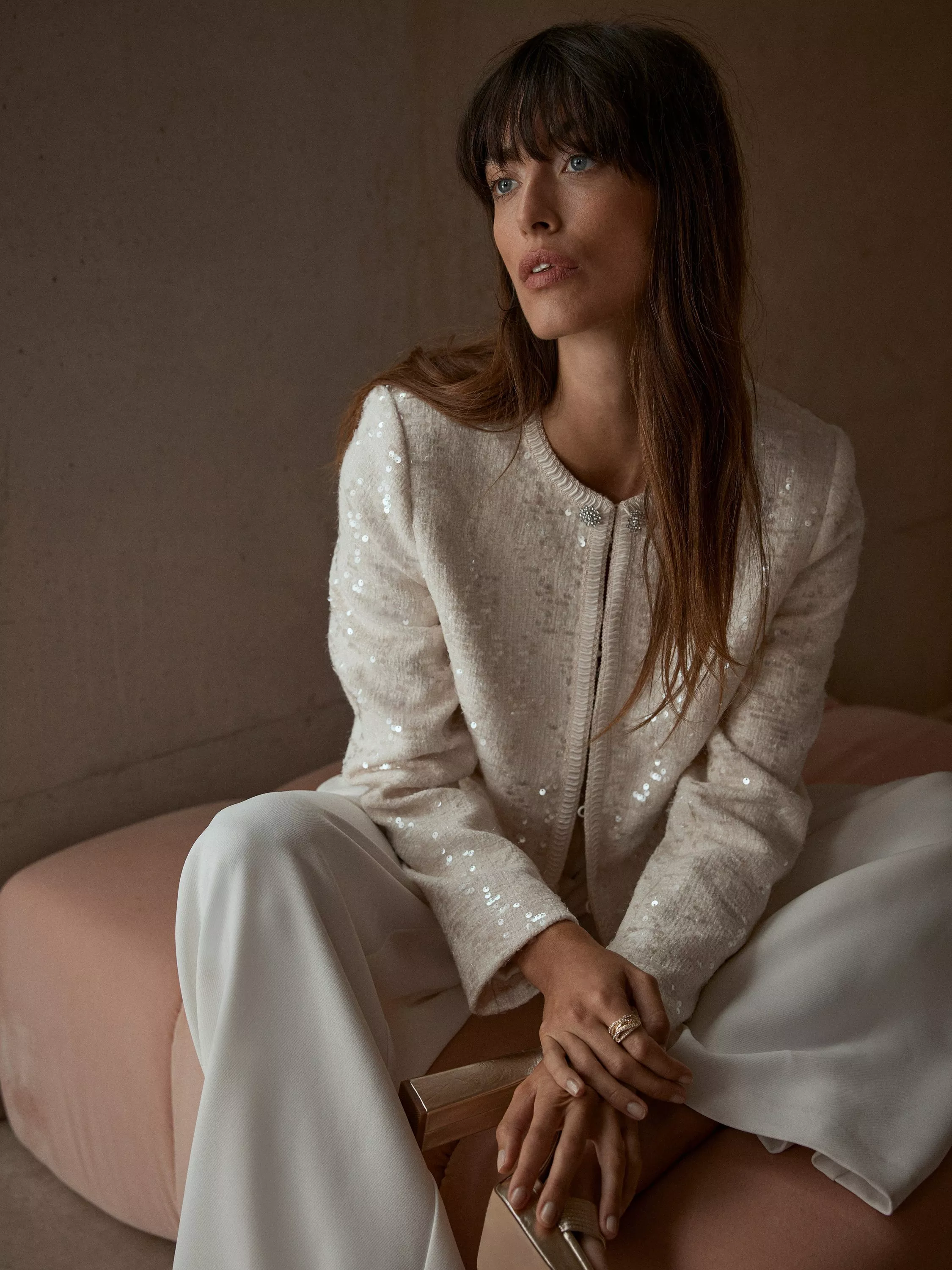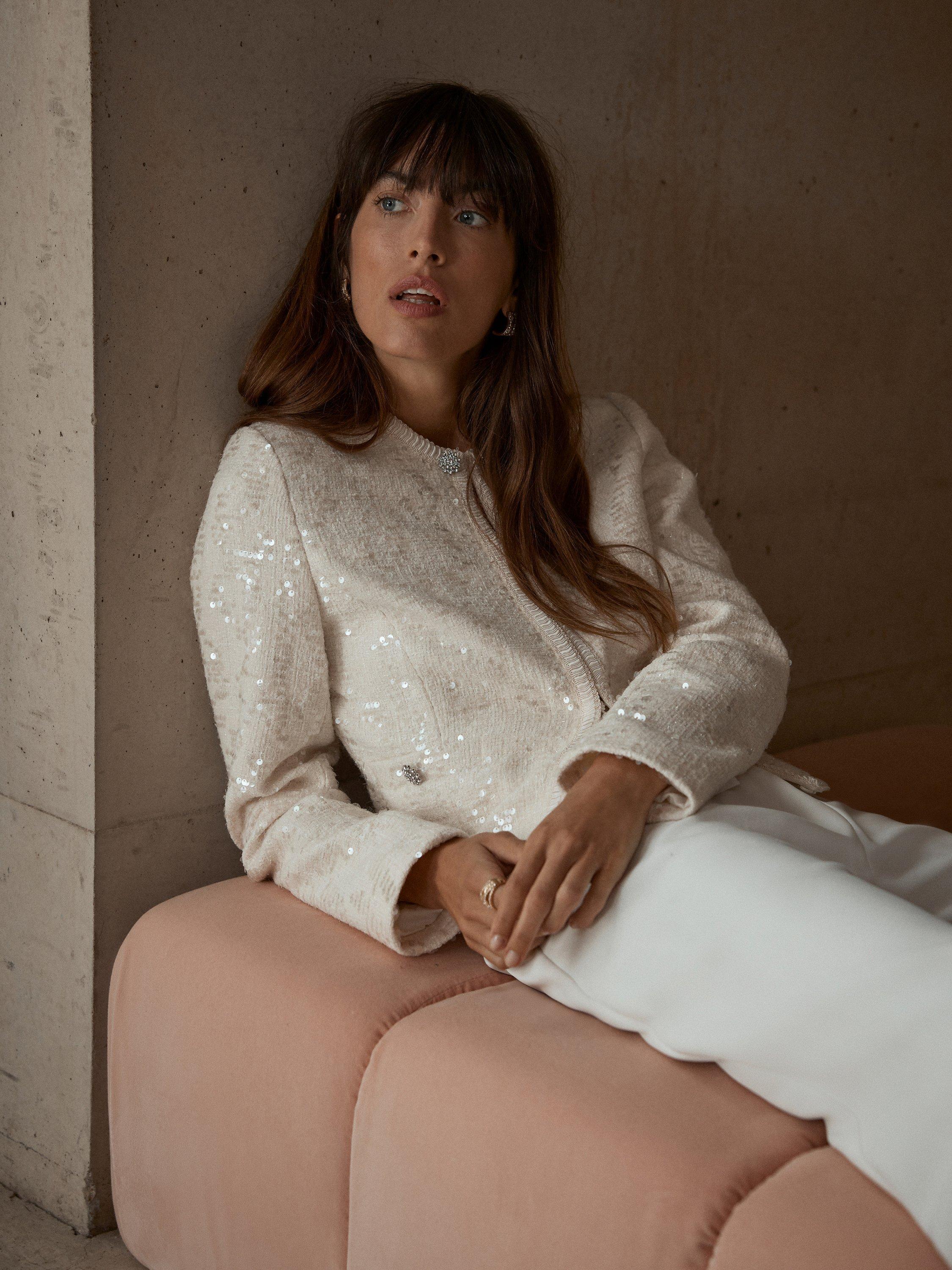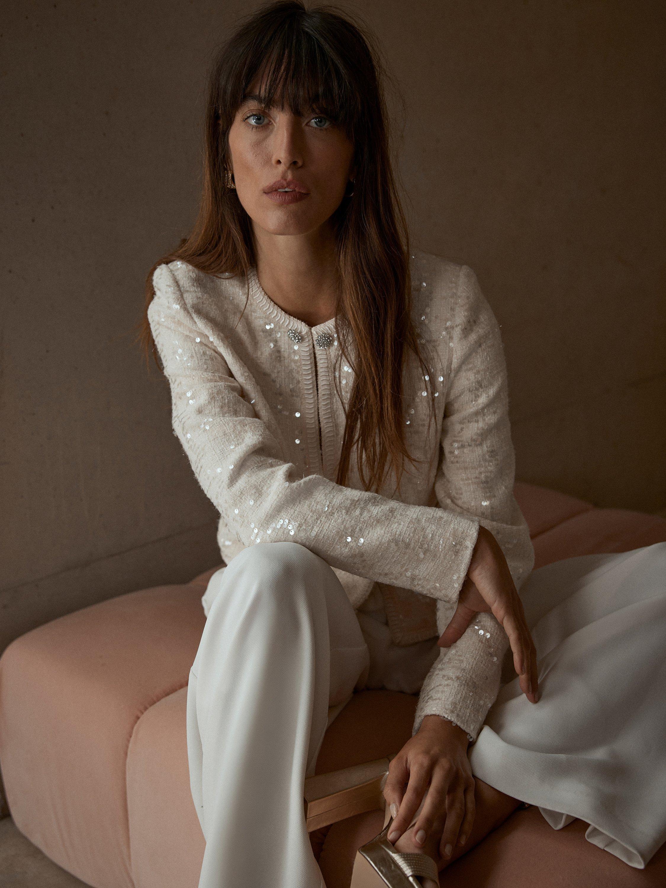 A chic sequin jacket with a crew neckline, long sleeves, crystal detail buttons, welt pockets with a hook and eye fastening through the front.