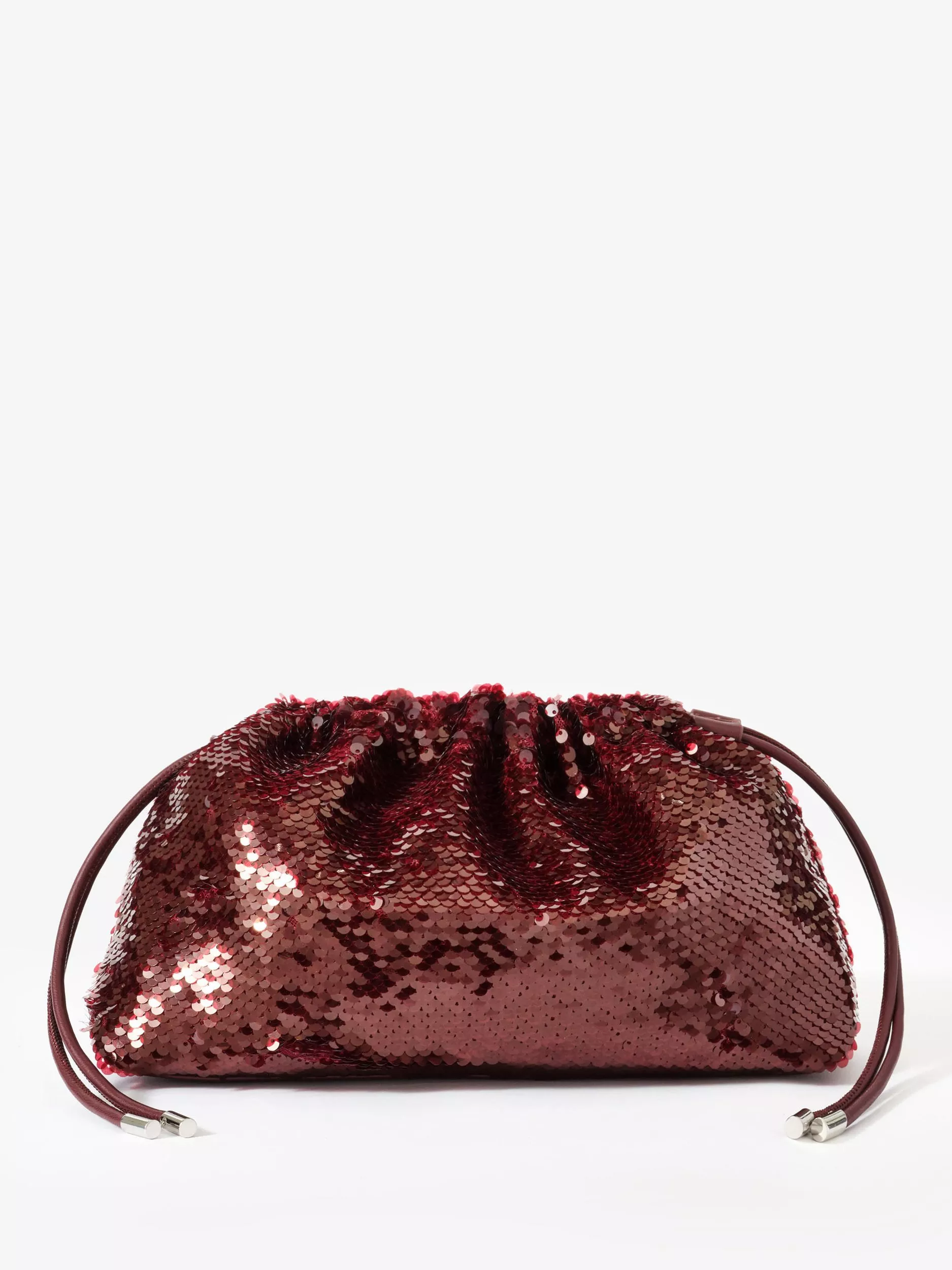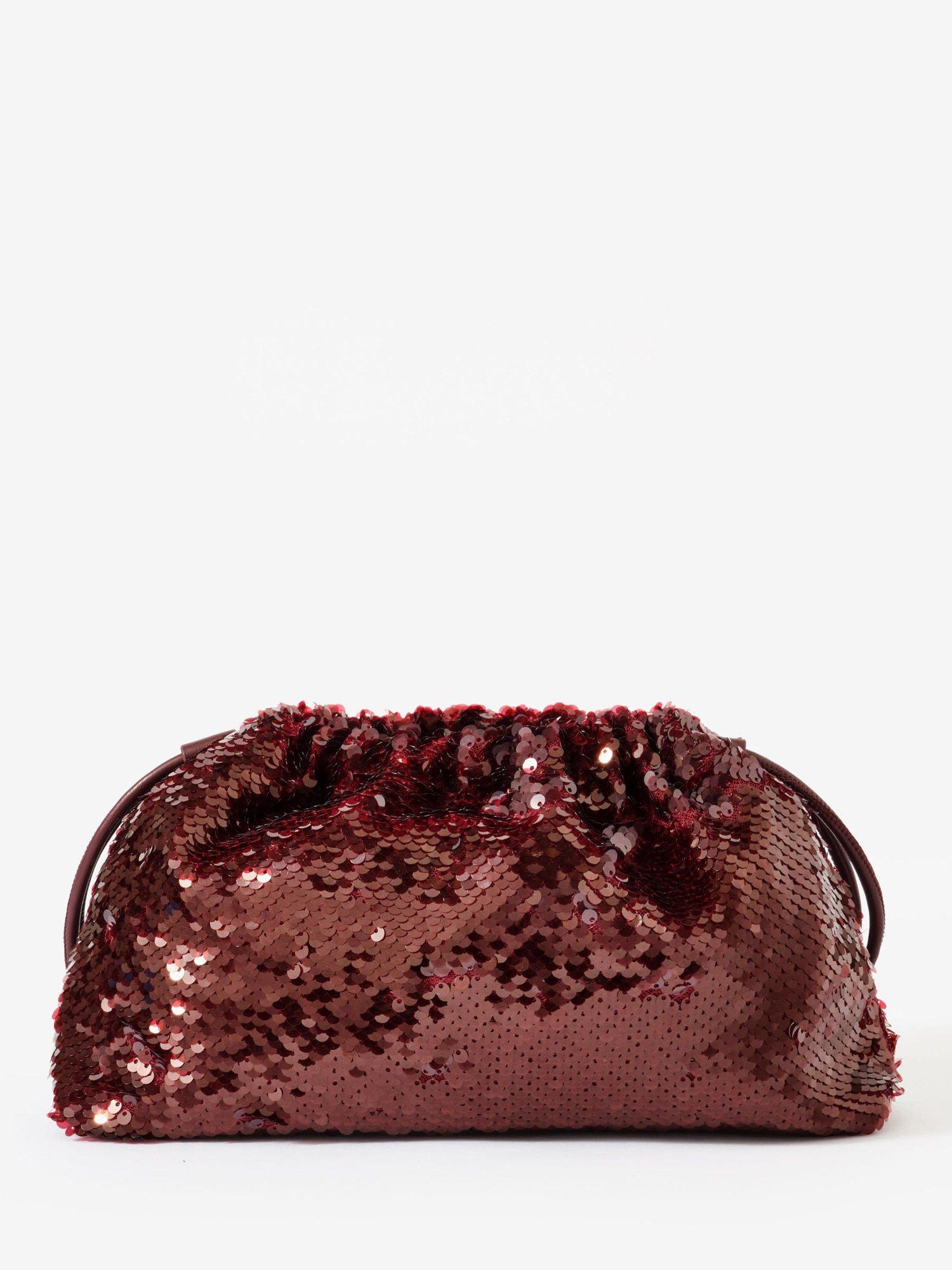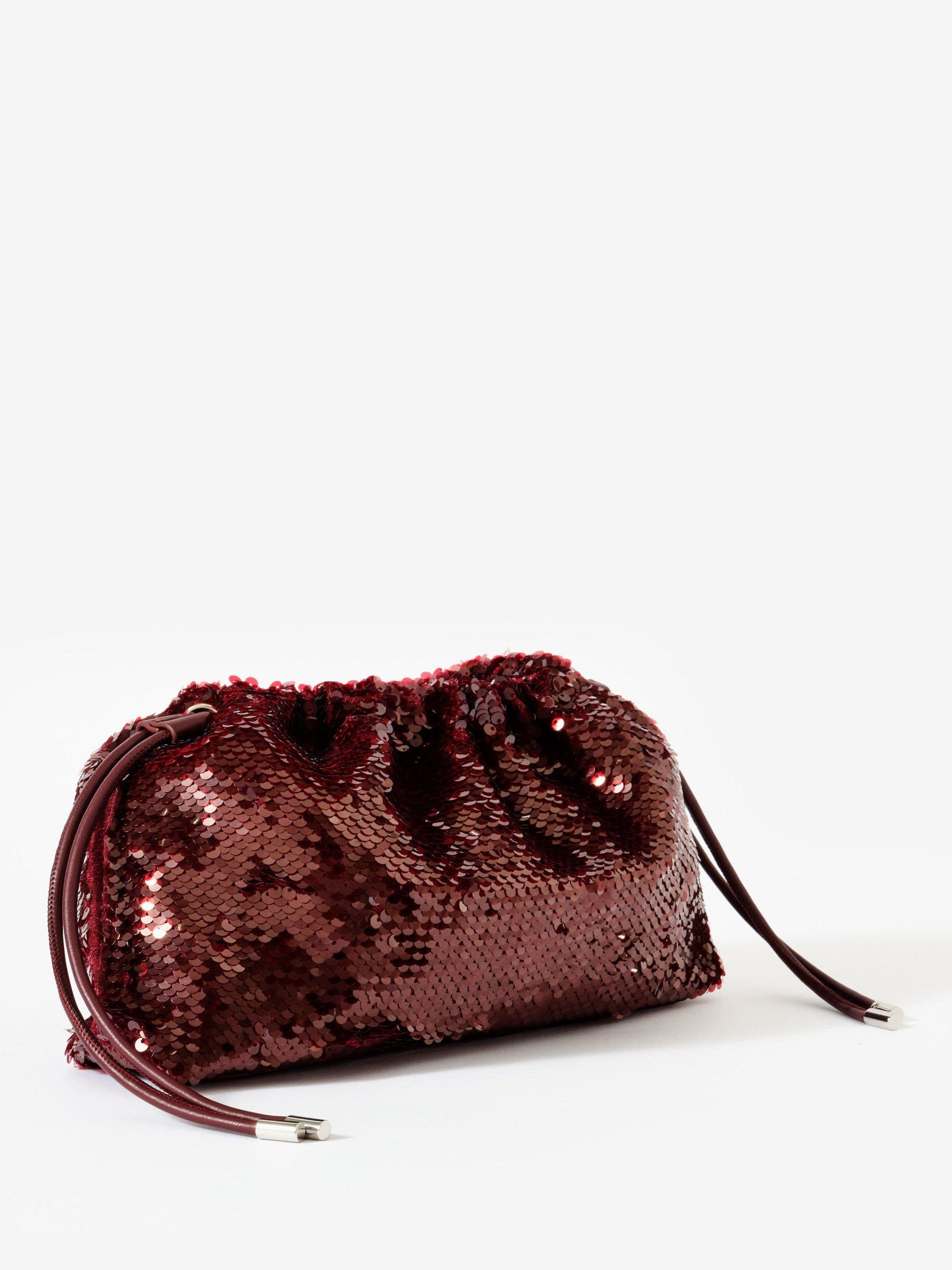 Burgundy sequin embellished clutch bag featuring a gold-tone detachable chain shoulder strap and drawstring closure.