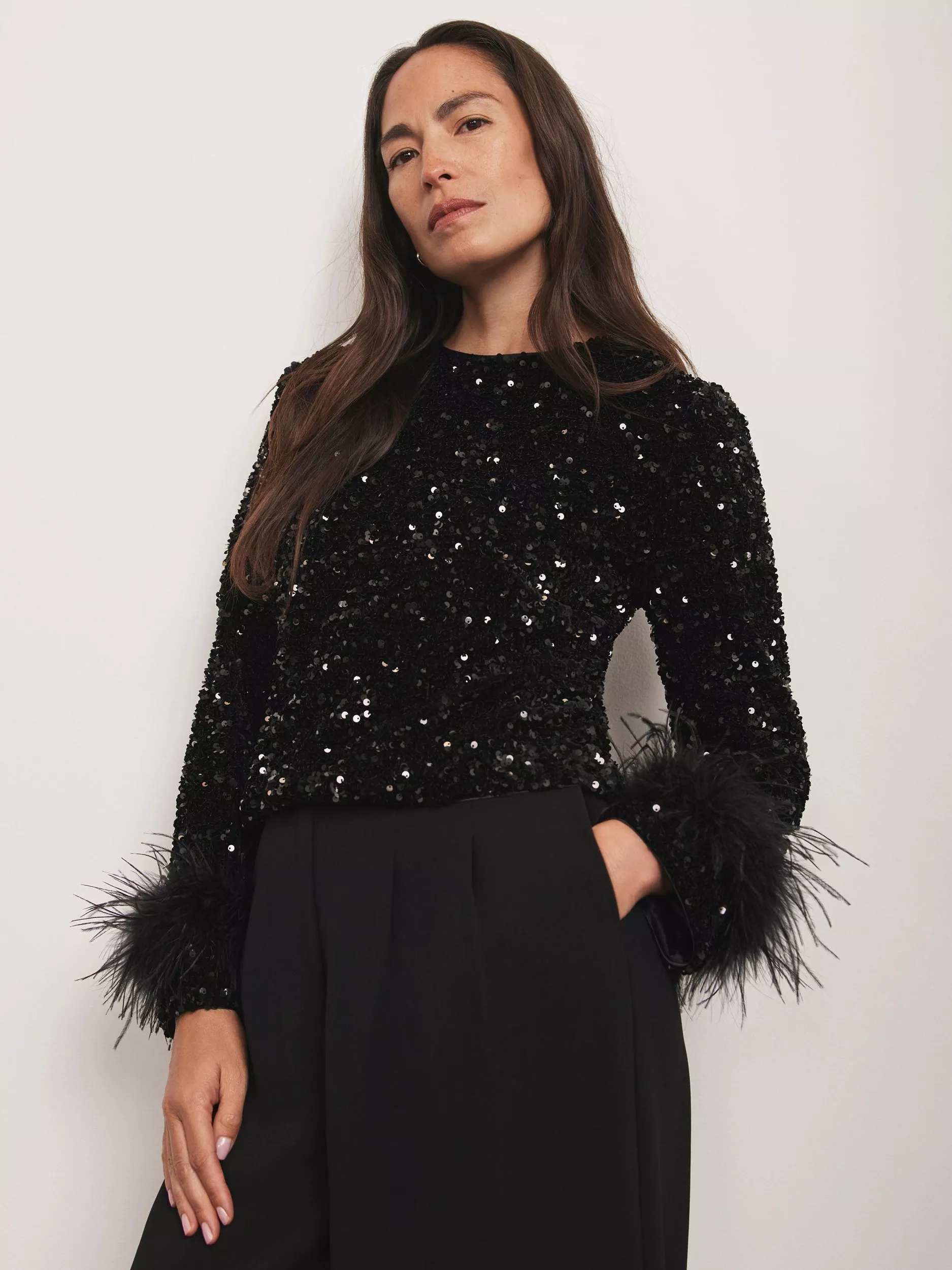 This sequin blouse adds sparkle to your evening, with statement feather-trimmed cuffs. Its round neck design is comfortable and ease to move around in, perfect for parties.