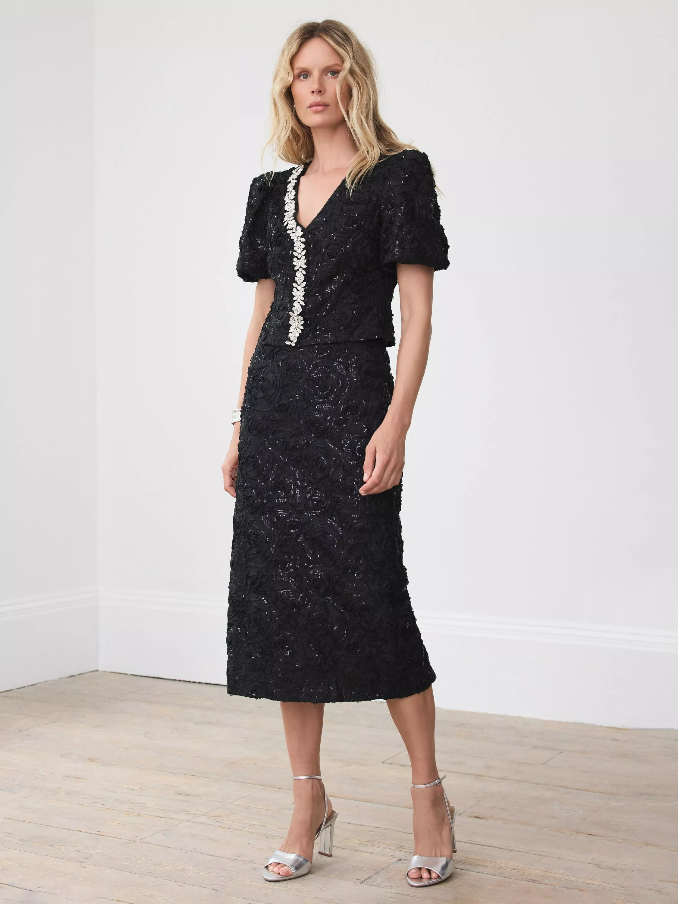 The go-to midi you'll reach for again and again - by Mint Velvet. Cut close in a pencil line with twinkling sequins throughout, this textured skirt features a satin trim waistband, a rear split and a zip fastening through the back.