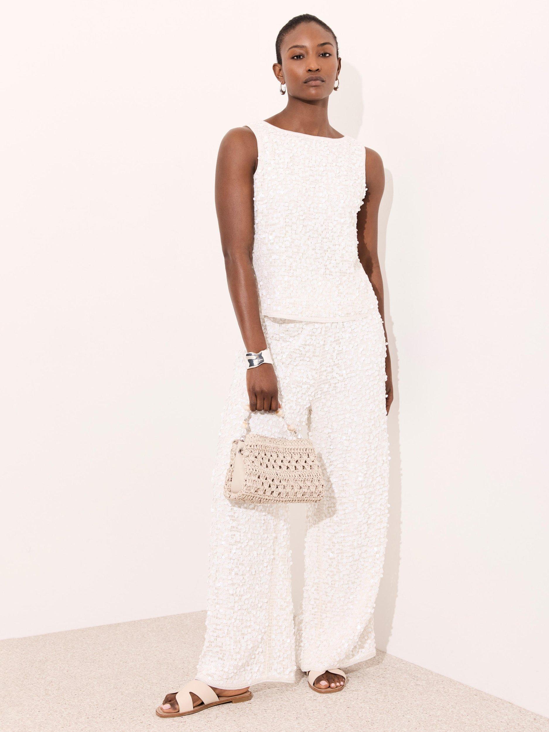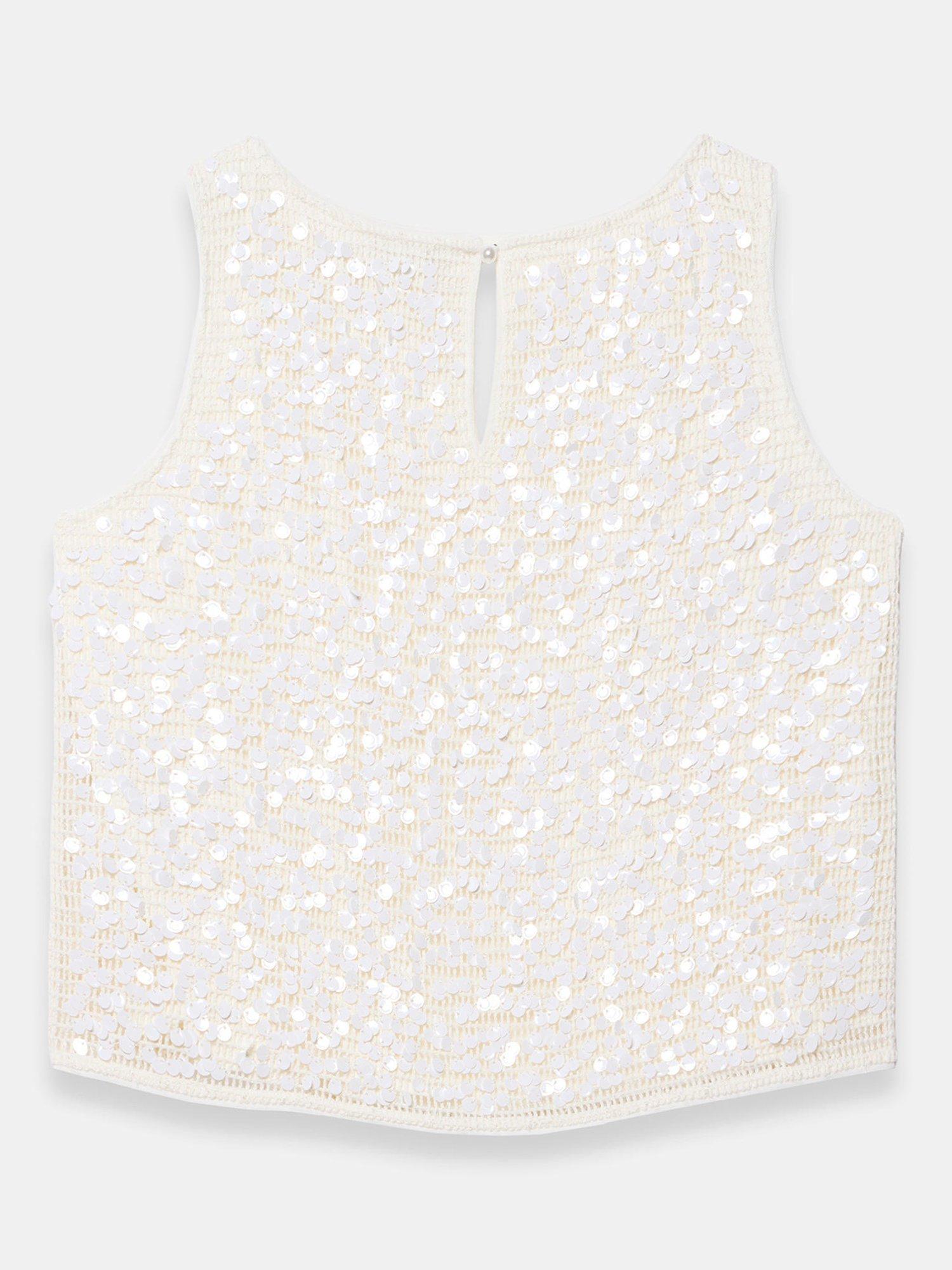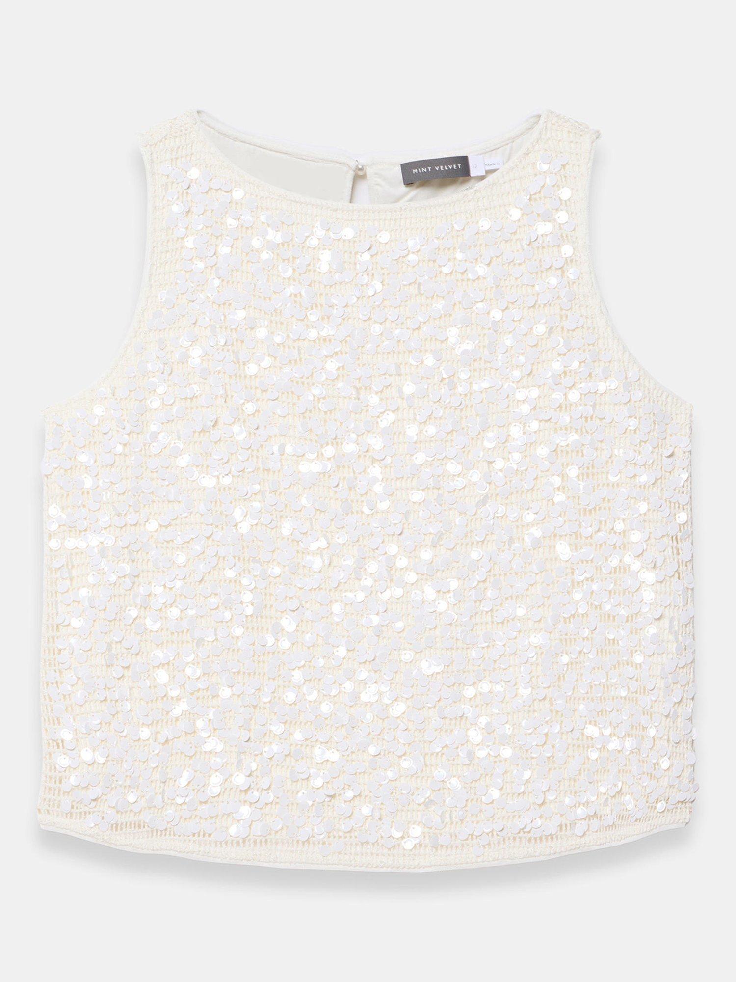 A sleeveless top featuring a crew neckline, sequin embellishment and button fastening through the back.