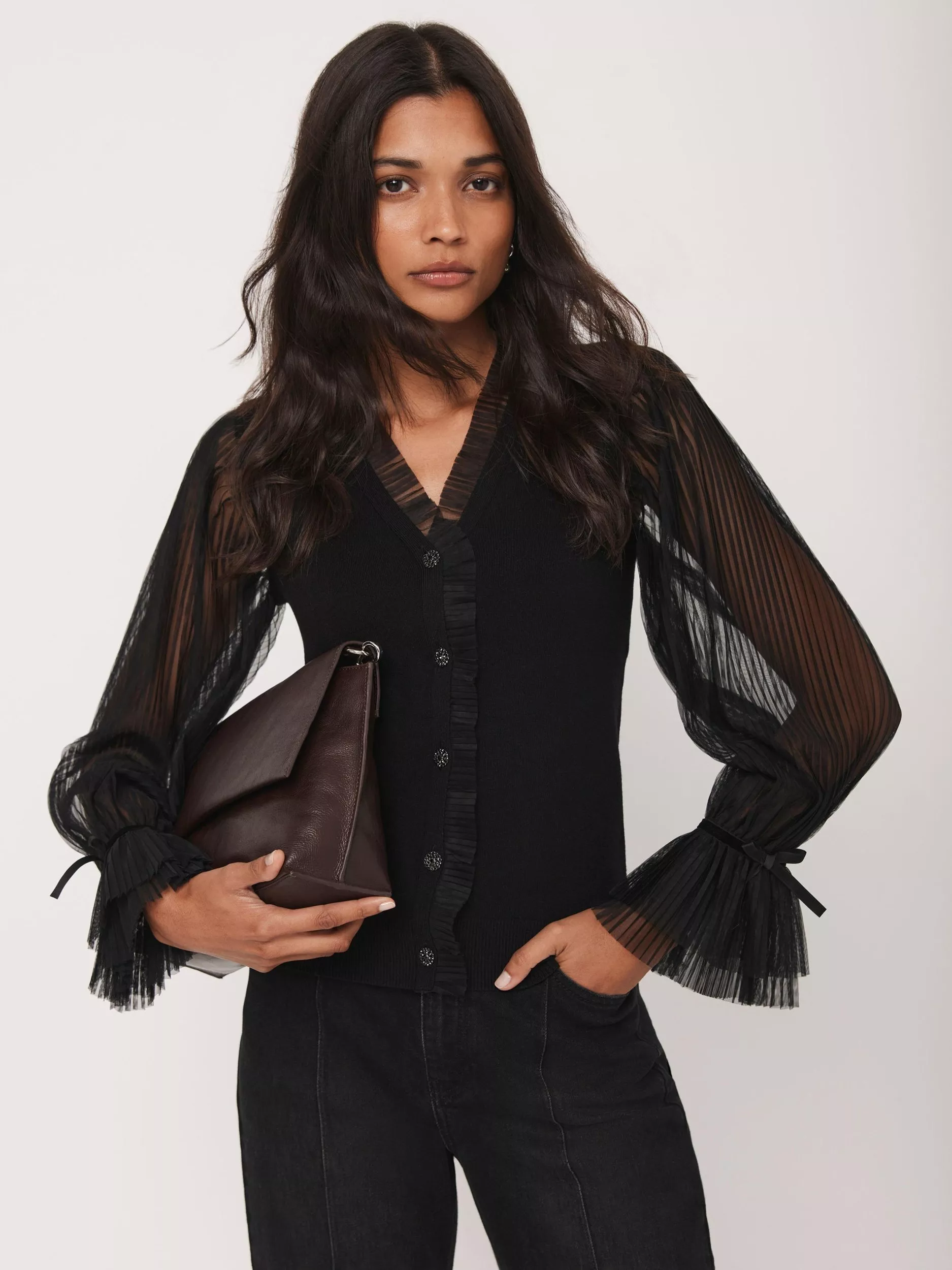 A relaxed-fit cardigan by Mint Velvet. Easy to layer, it features a ruffled tulle V-neckline, sheer long sleeves, fluted cuffs, tie cuff detail with crystal button fastenings through the front.