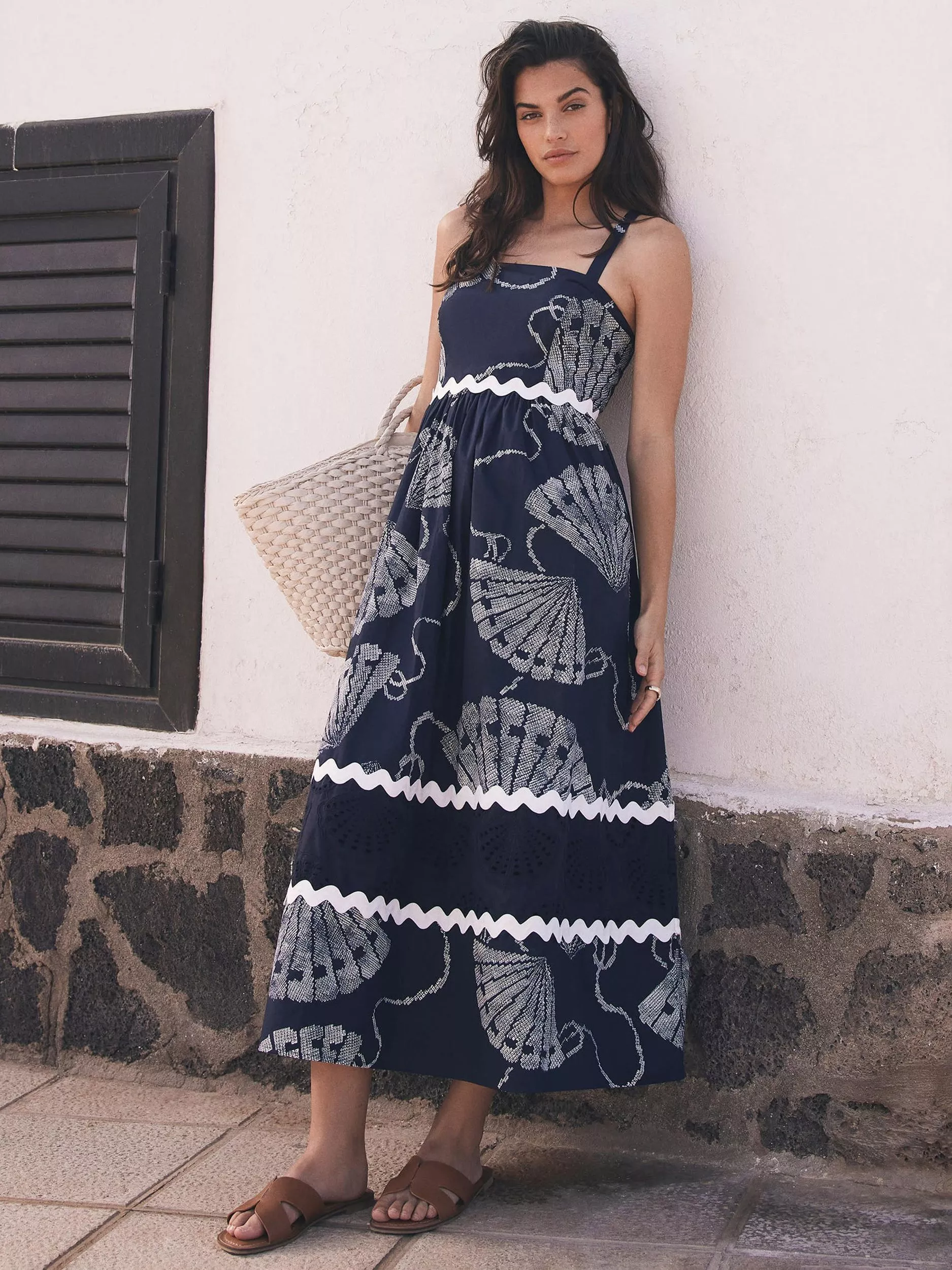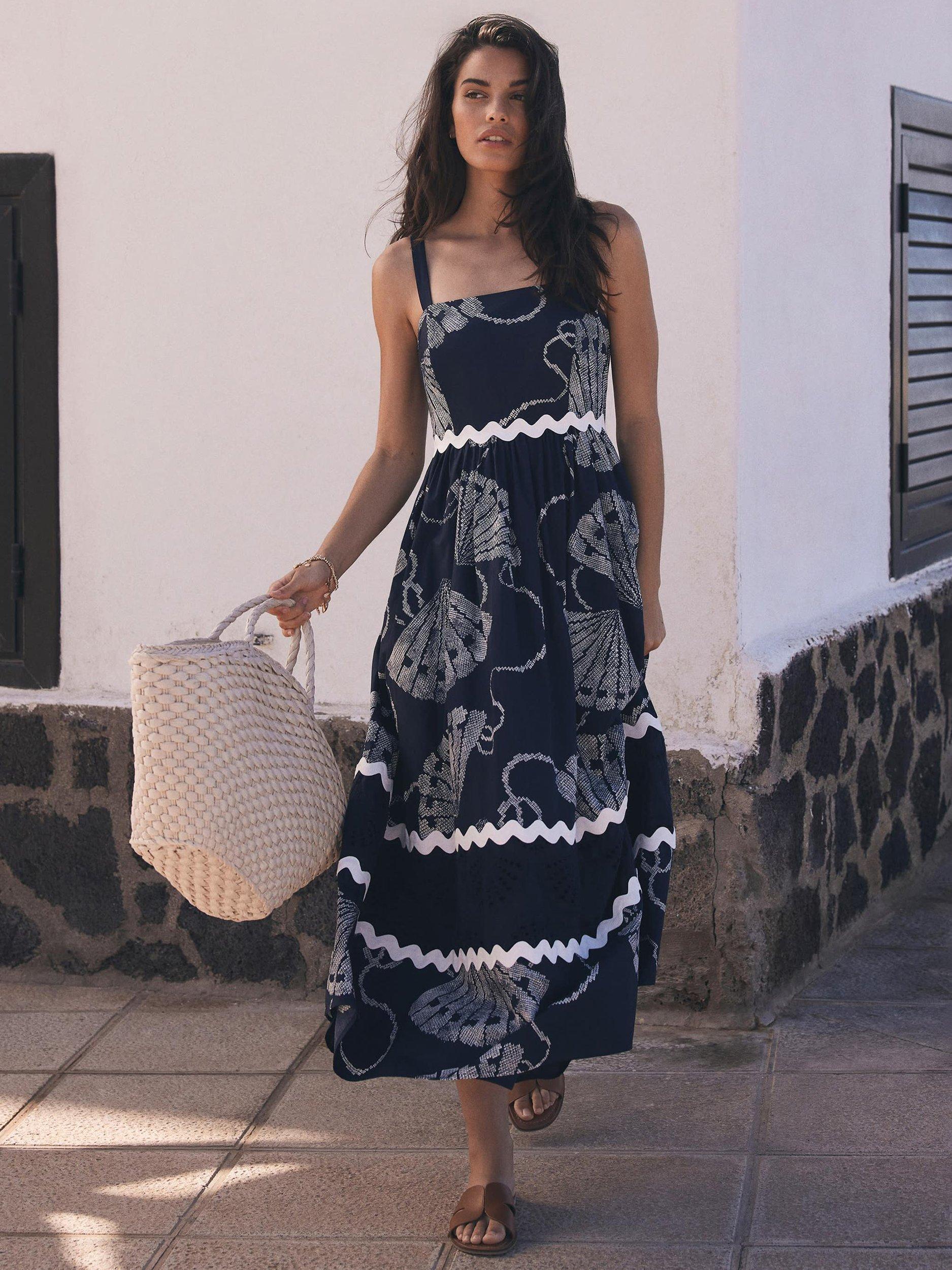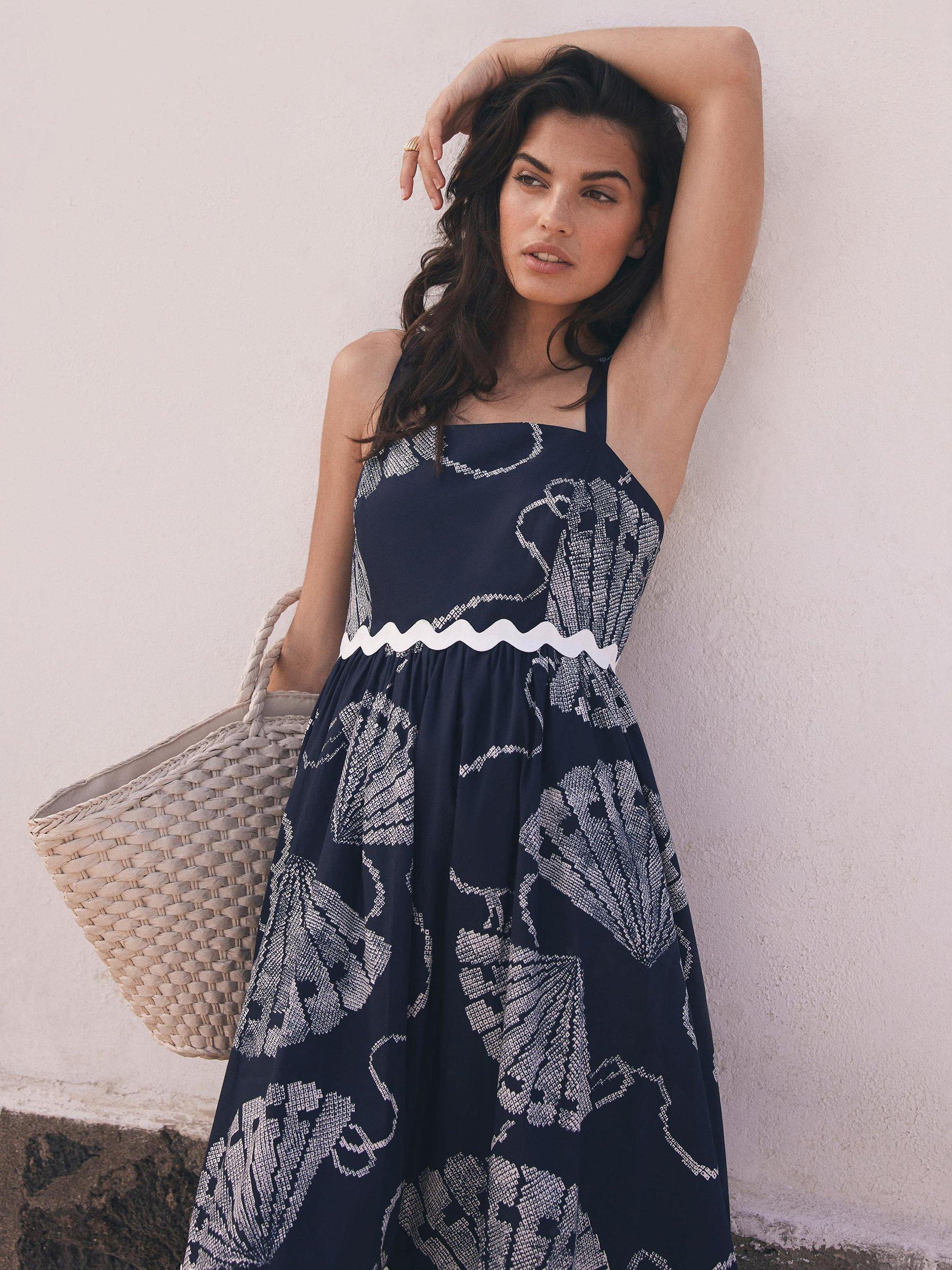 A pure cotton shell print dress in a maxi silhouette featuring a square neckline, thin straps, contrast wave trim, cut out shell detail with a zip fastening through the back.