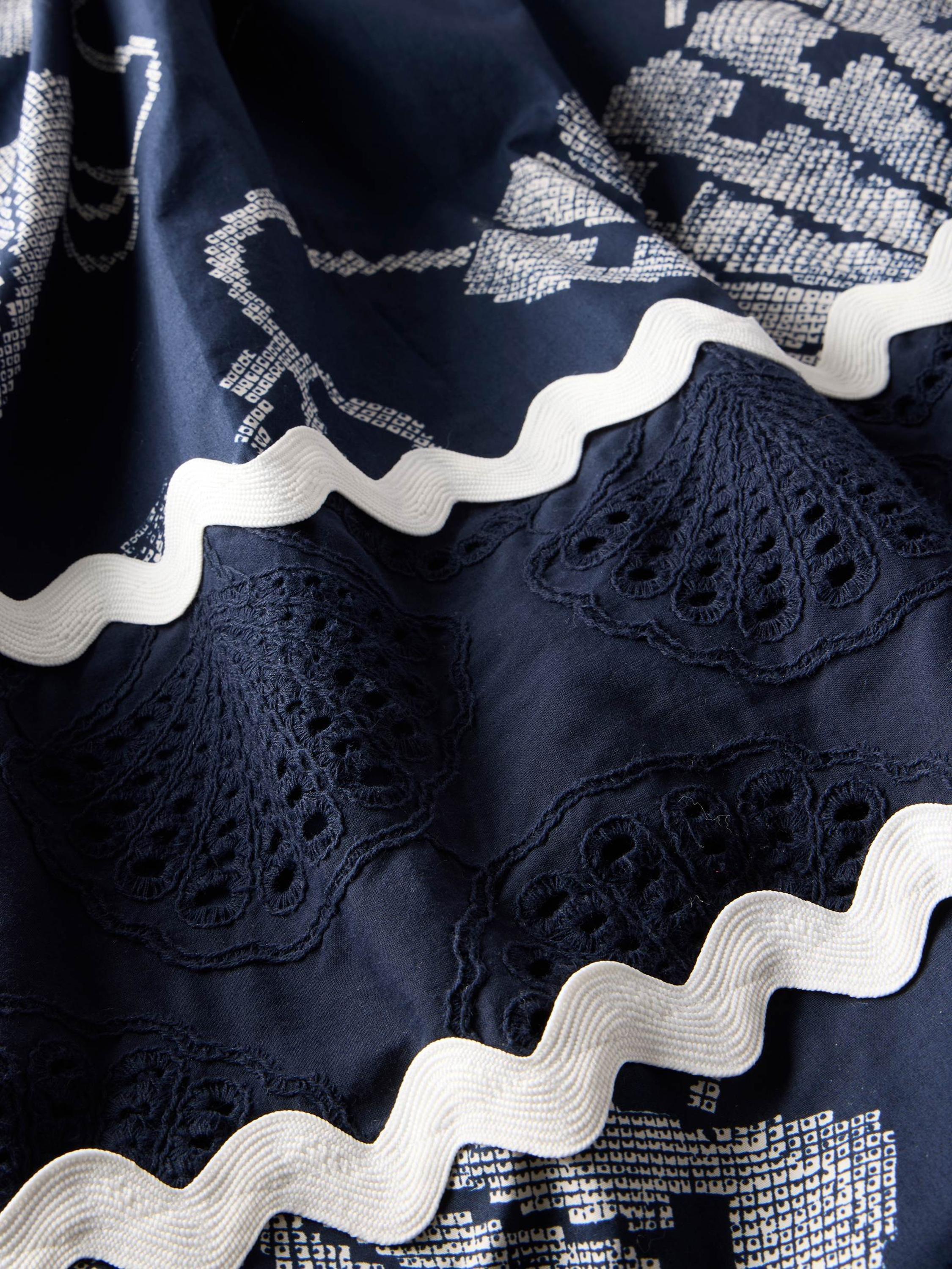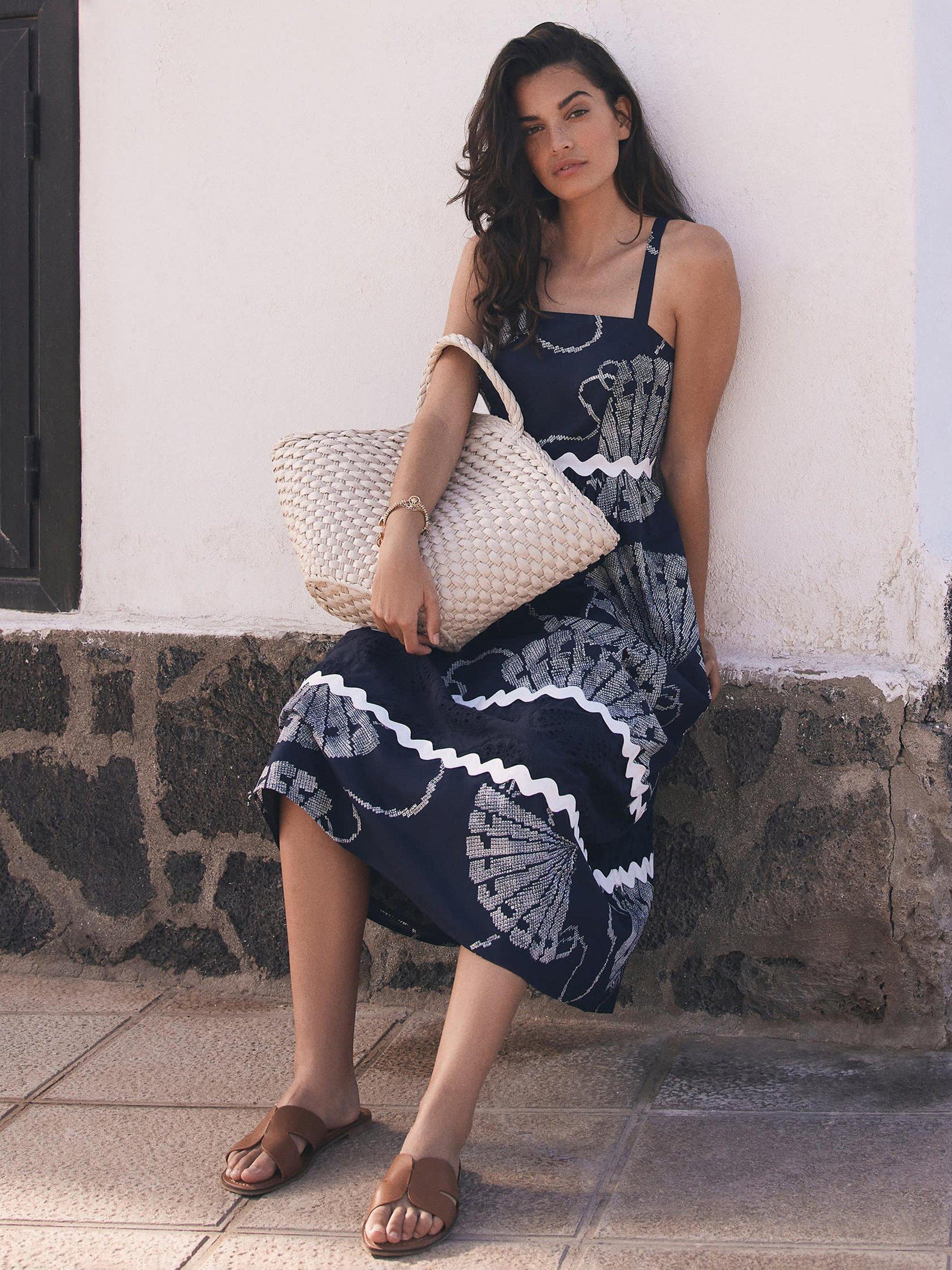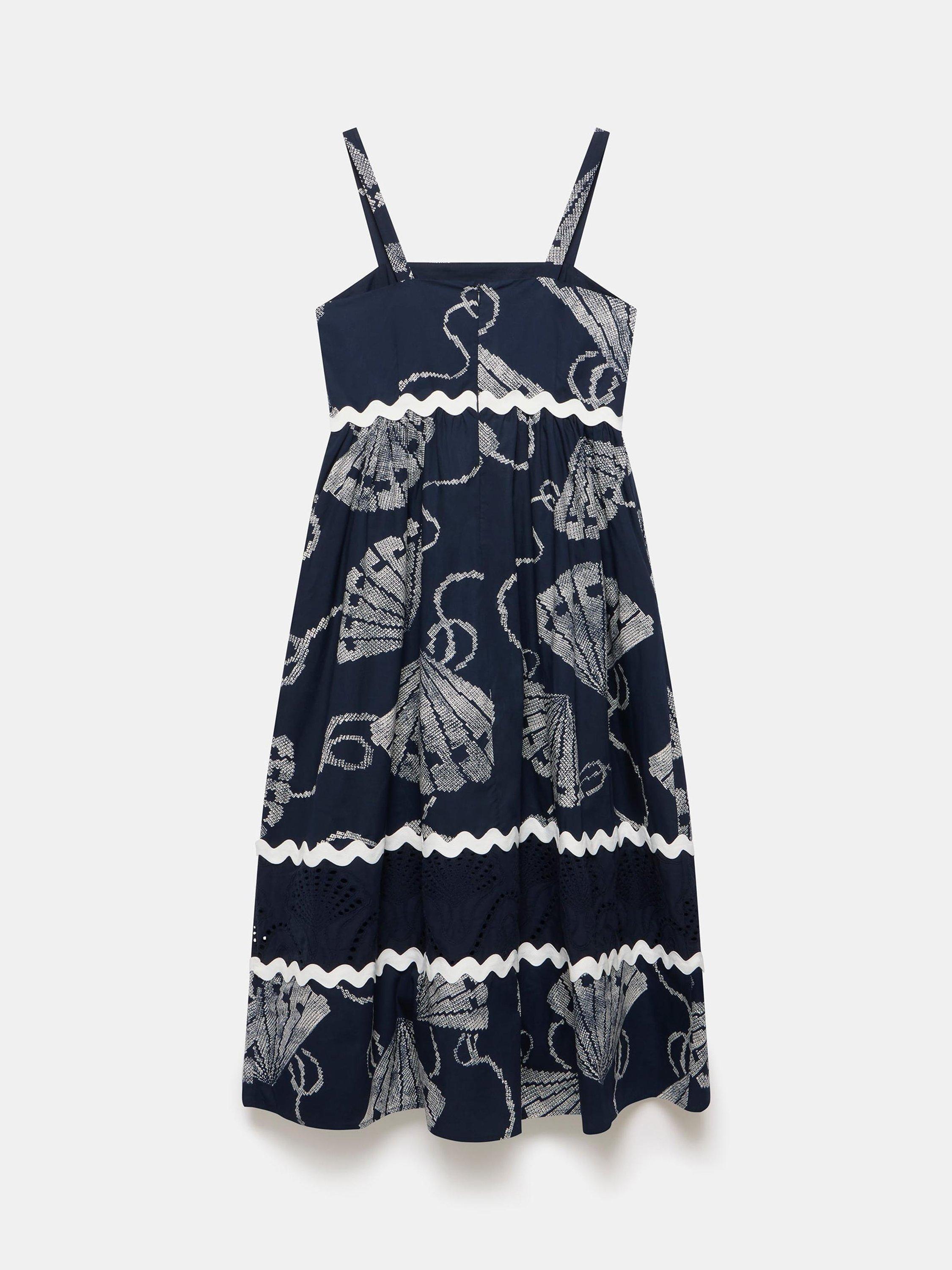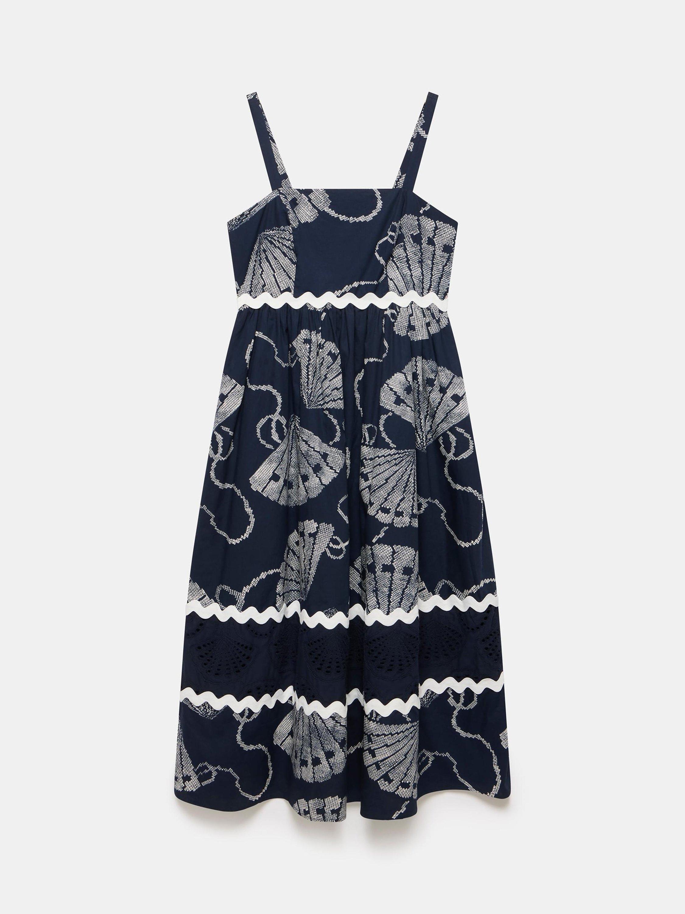 A pure cotton shell print dress in a maxi silhouette featuring a square neckline, thin straps, contrast wave trim, cut out shell detail with a zip fastening through the back.