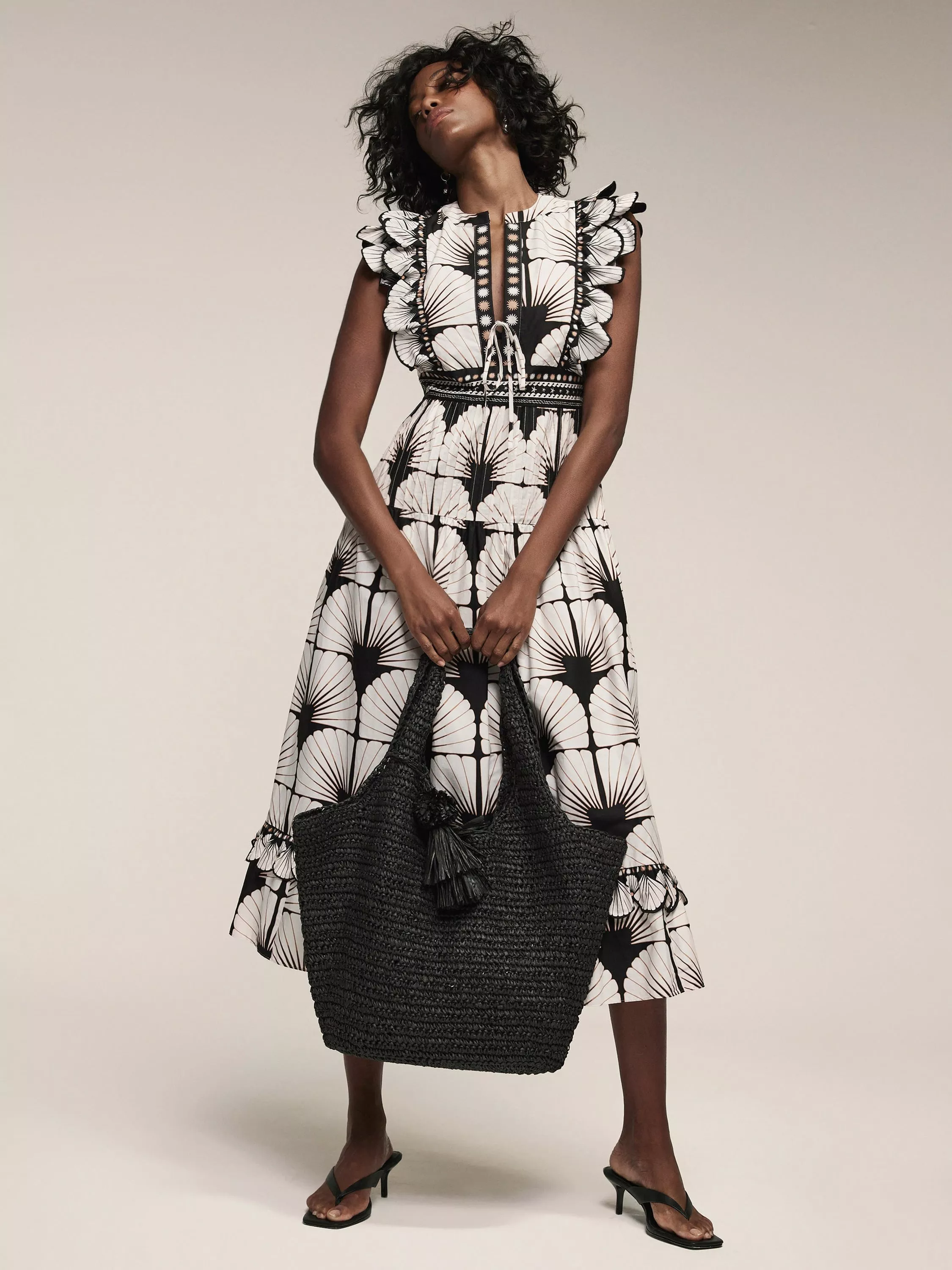 A pure cotton midi dress with a shell print, short ruffled sleeves, a tied V neckline and cinched waist.