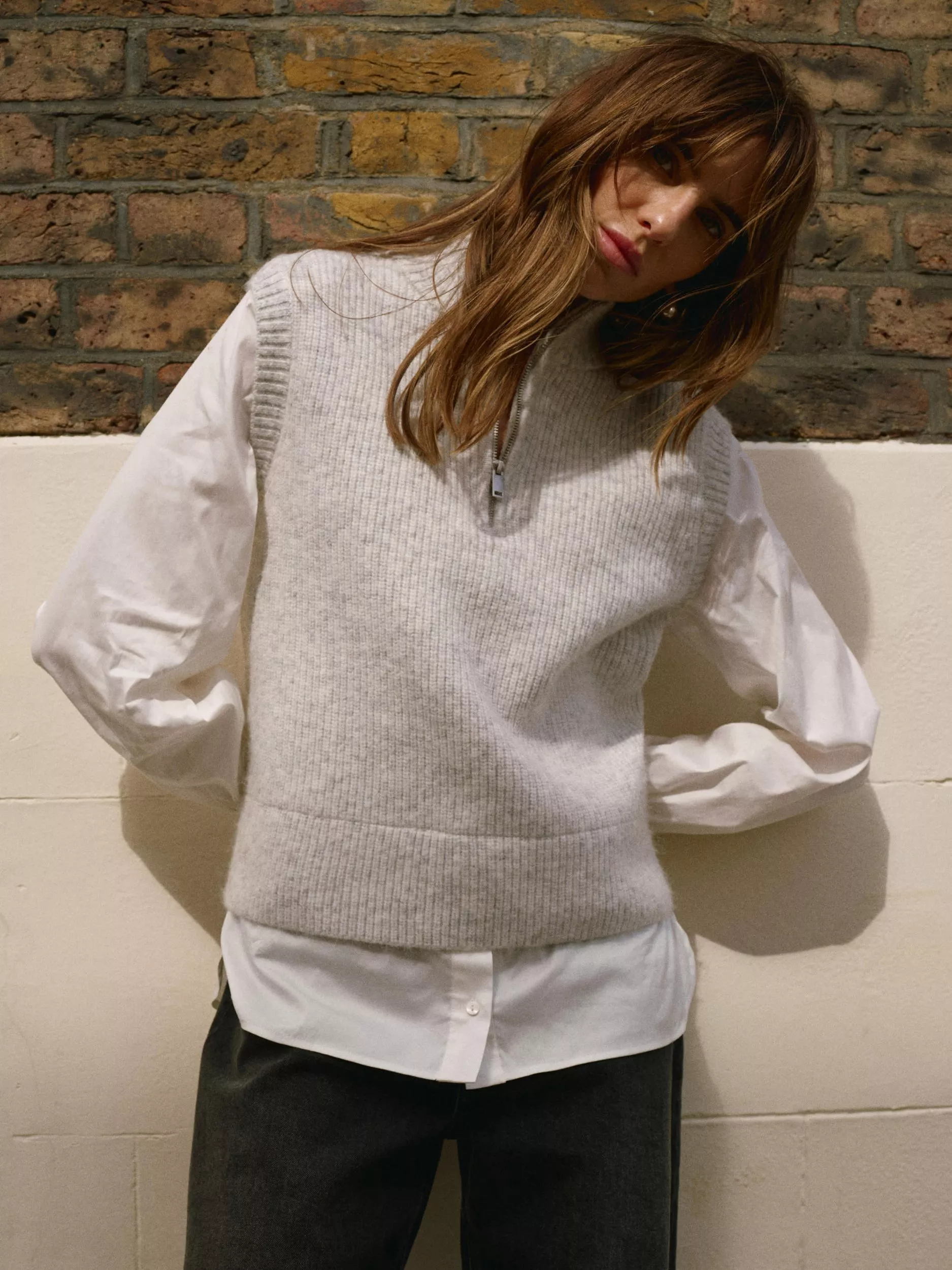 A knit sleeveless jumper featuring a high neckline, built-in shirt layering, long sleeves, buttoned cuffs with a zip fastening through the front.