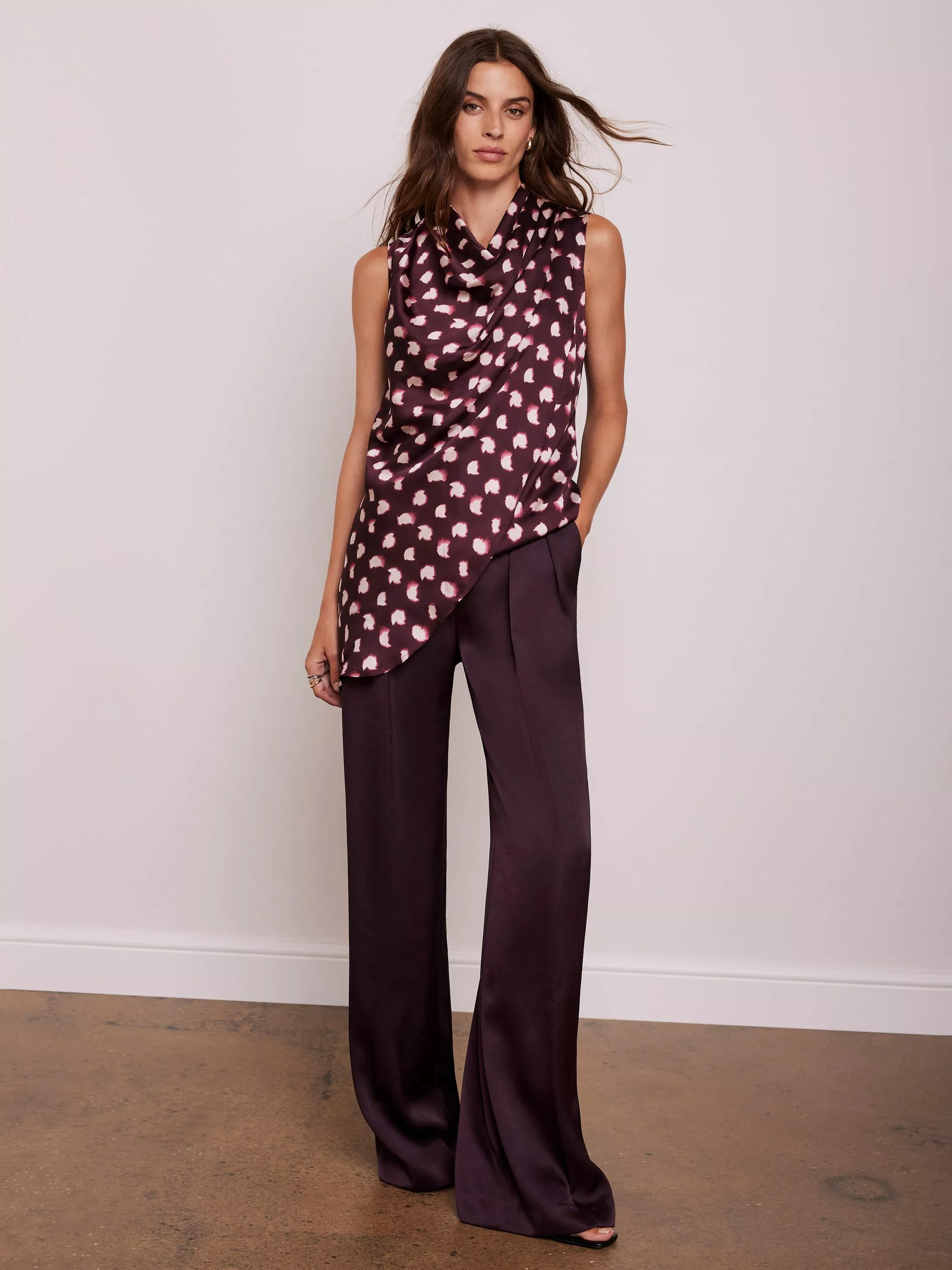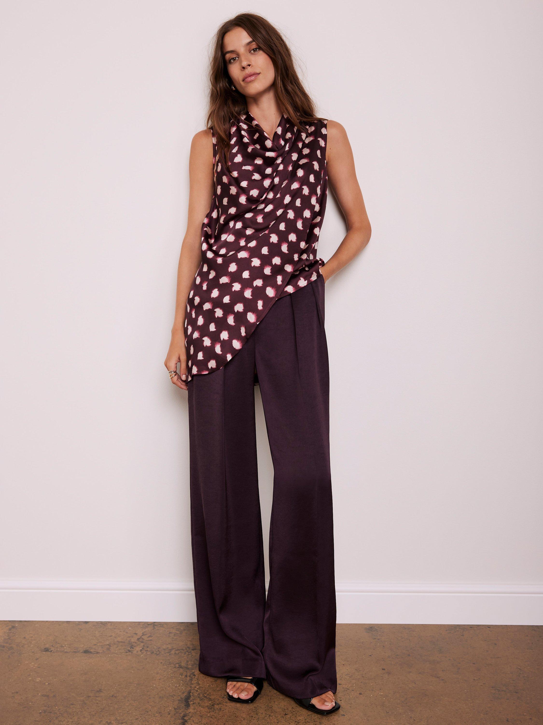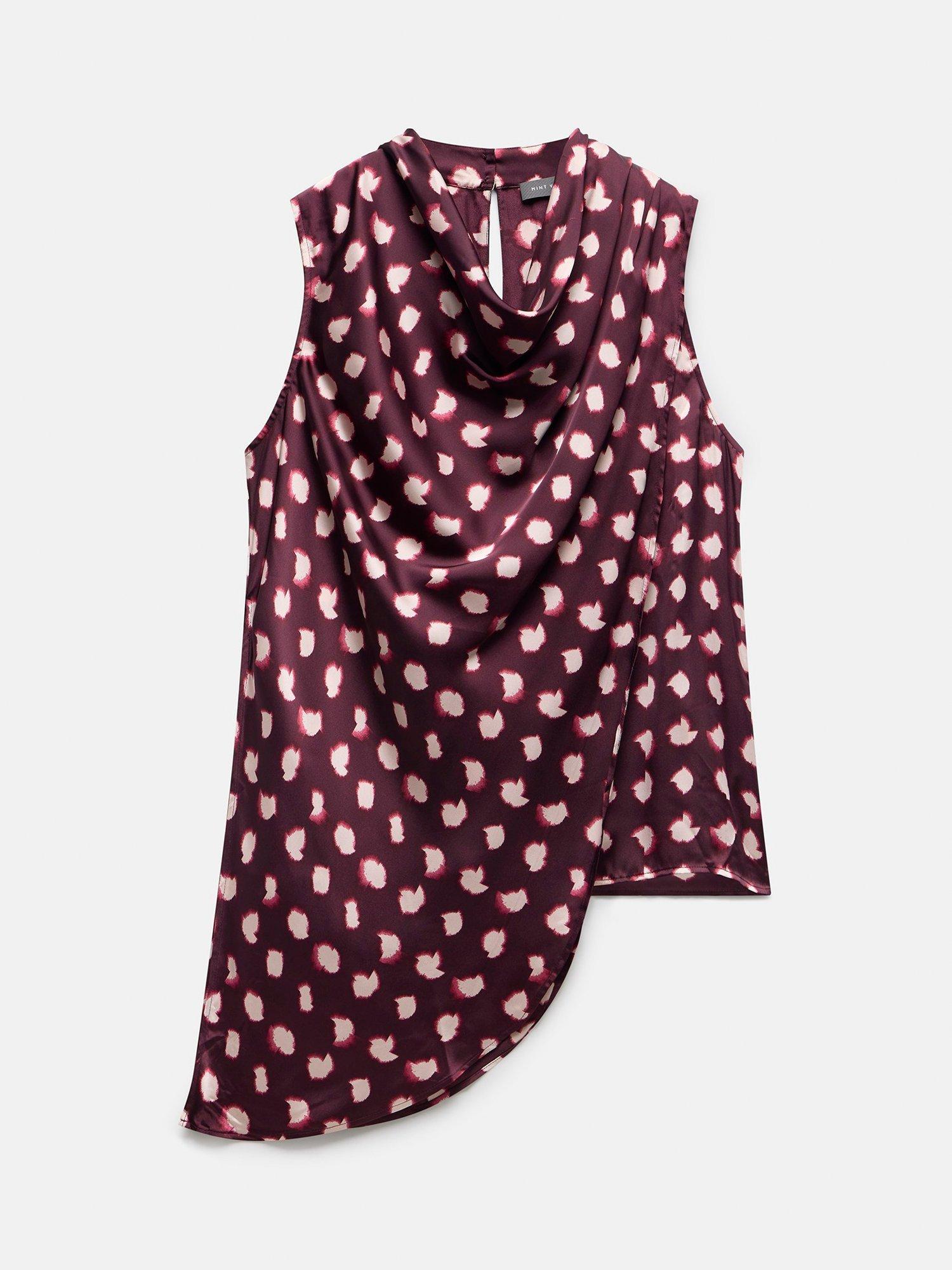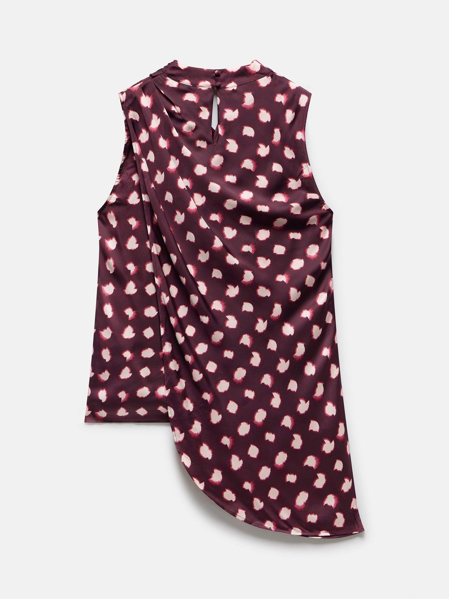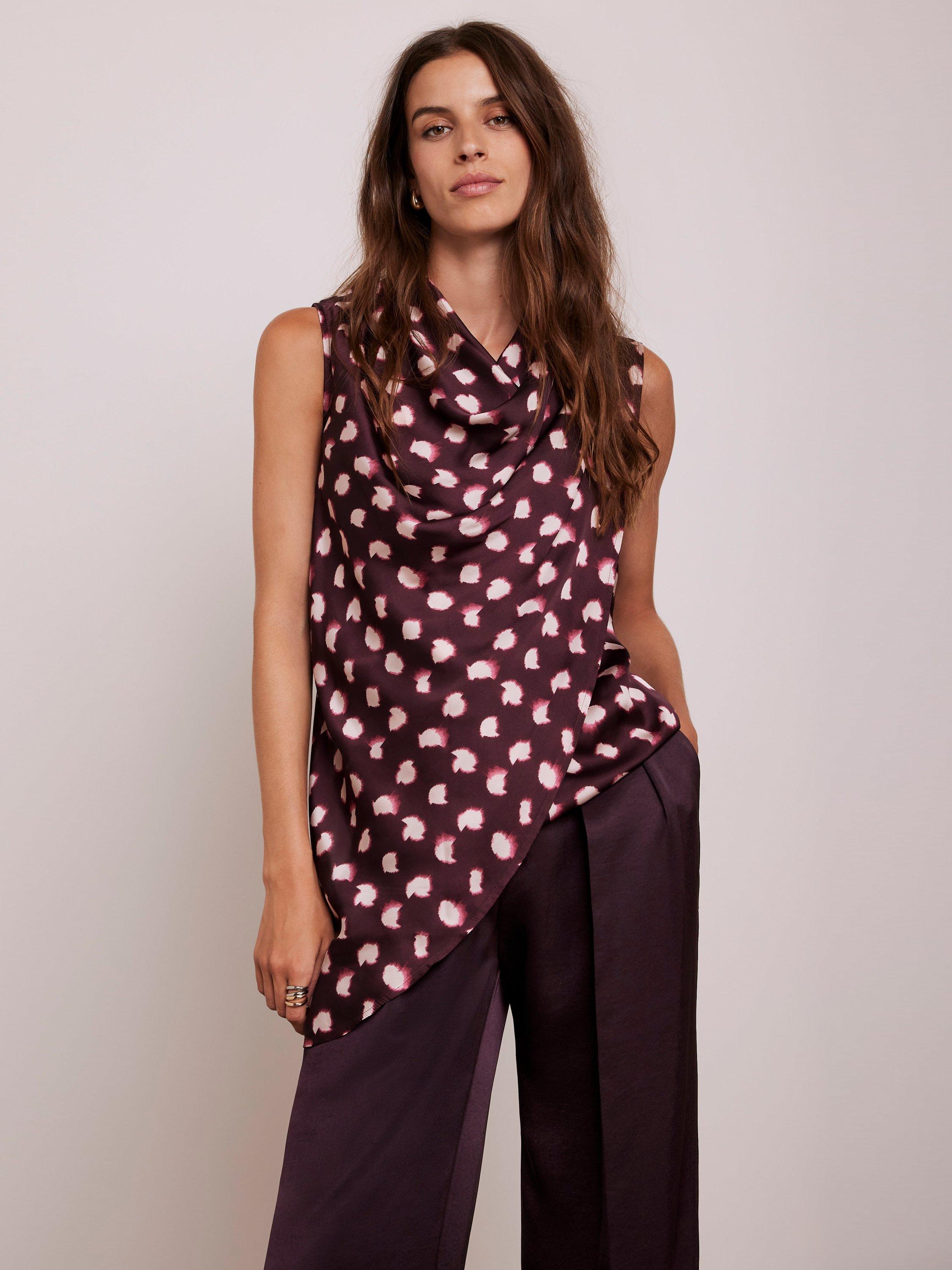 A spot print sleeveless top featuring a cowl neckline, draped front, asymmetric longline hemline with a button fastening through the back.