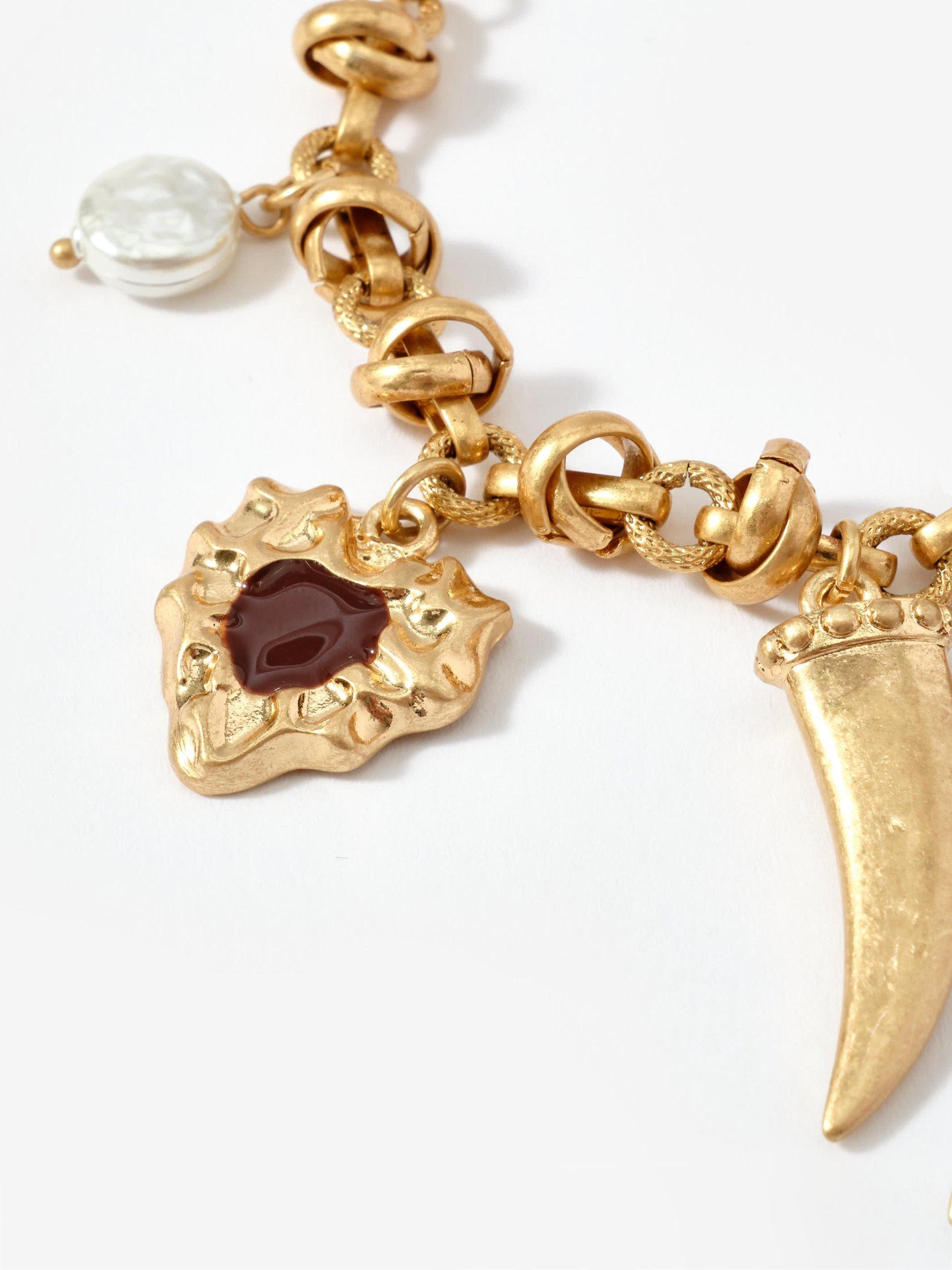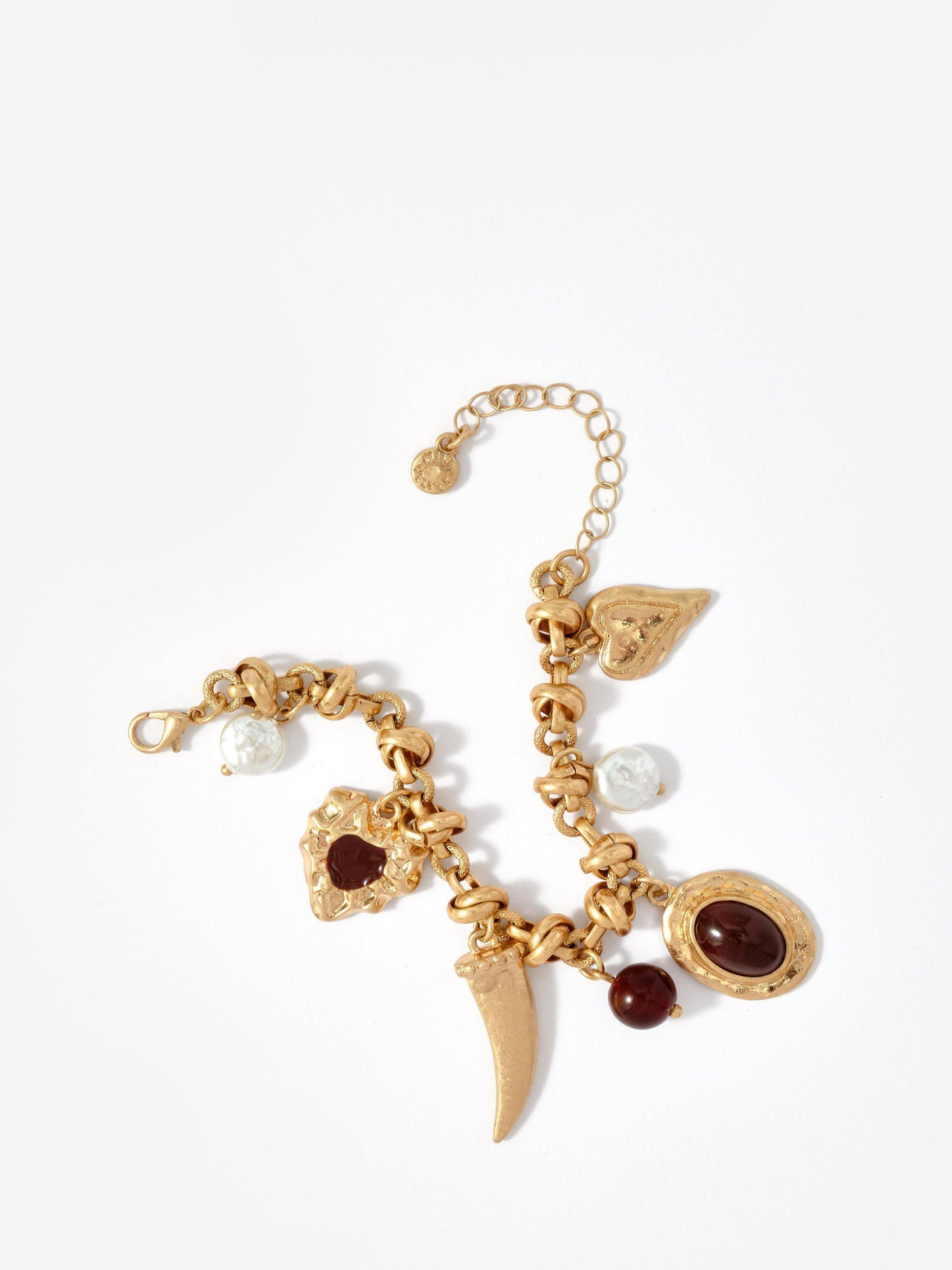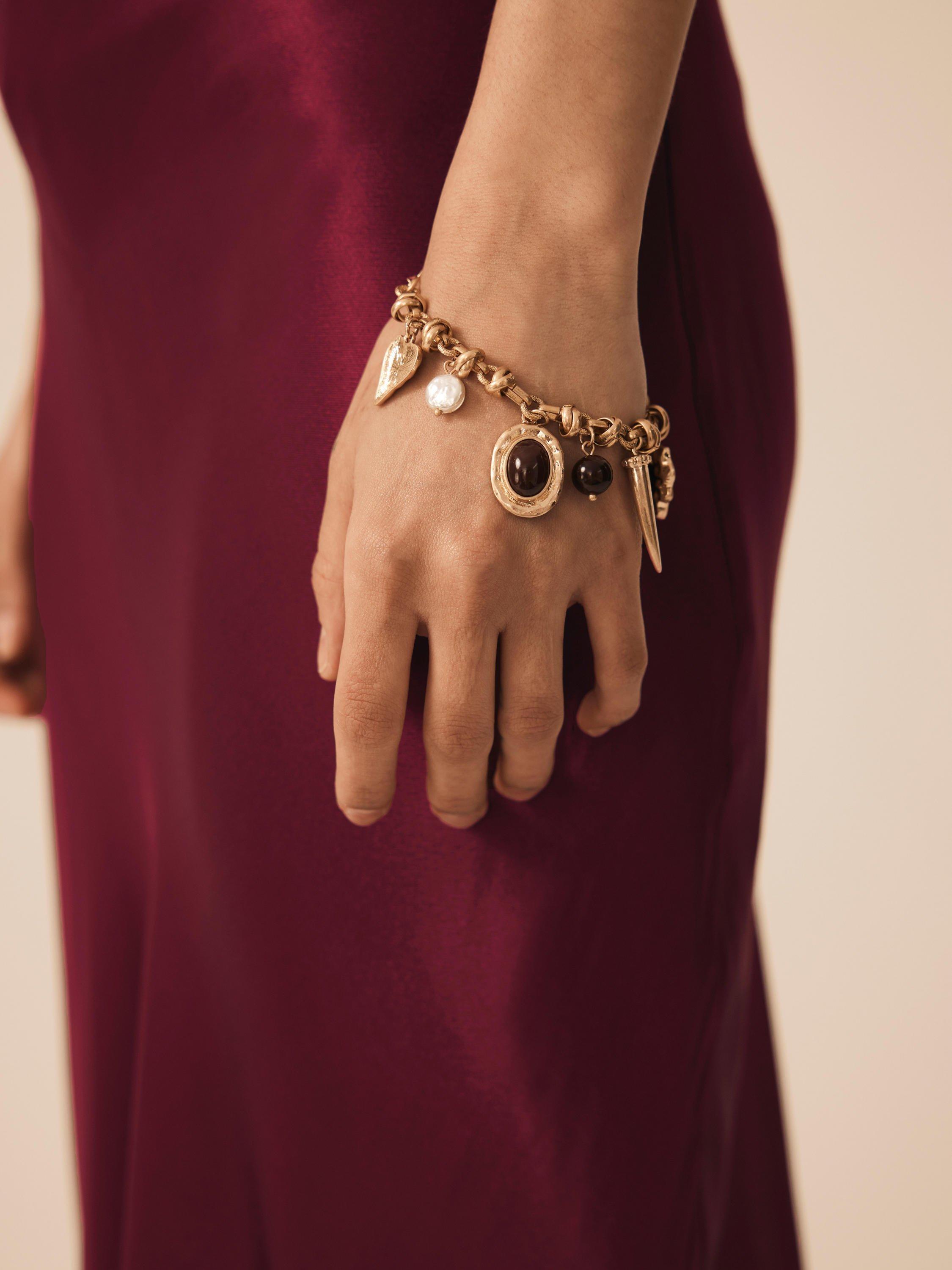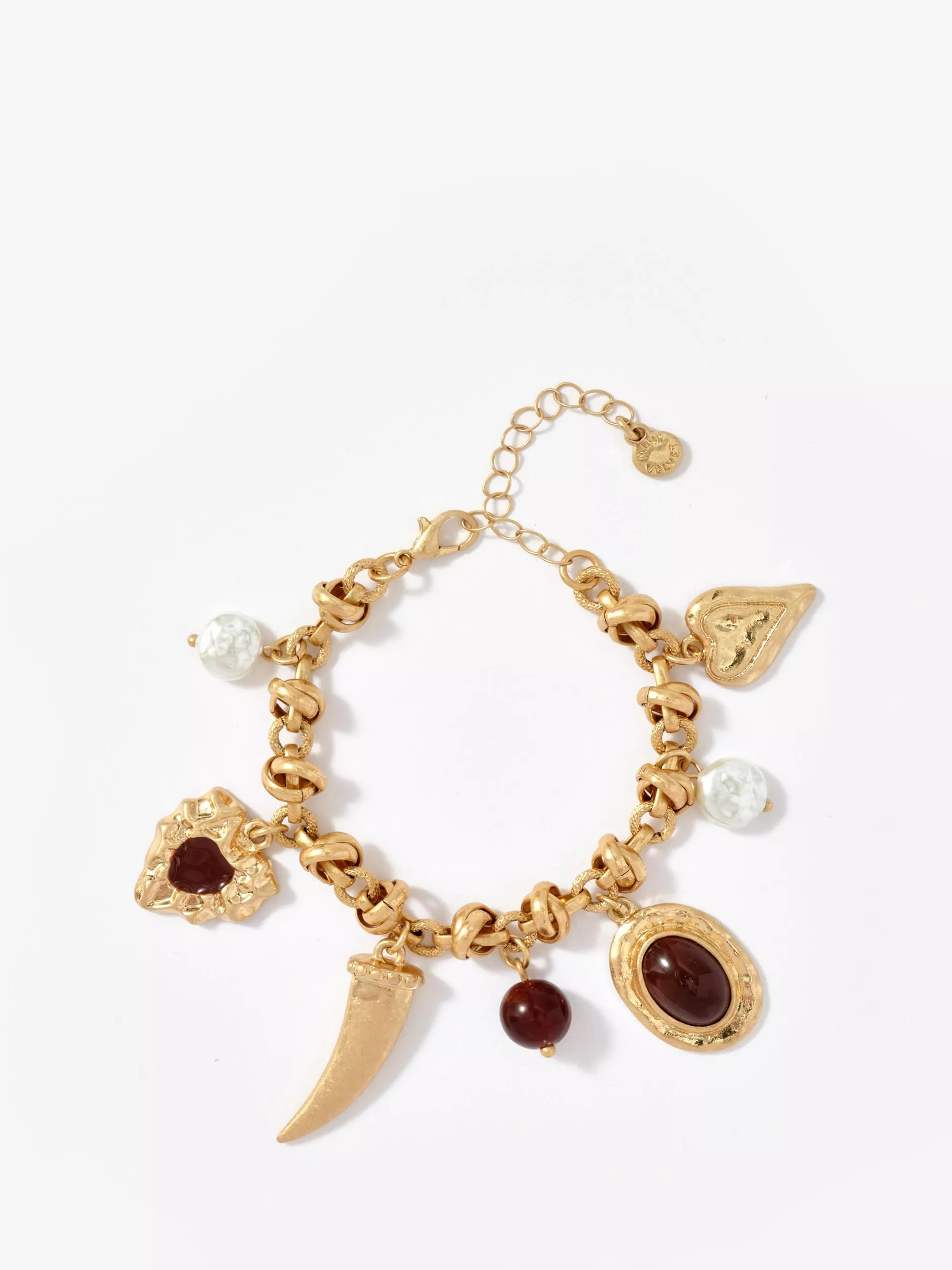 A gold-tone charm bracelet from Mint Velvet, featuring statement hanging charms and an adjustable lobster clasp fastening.