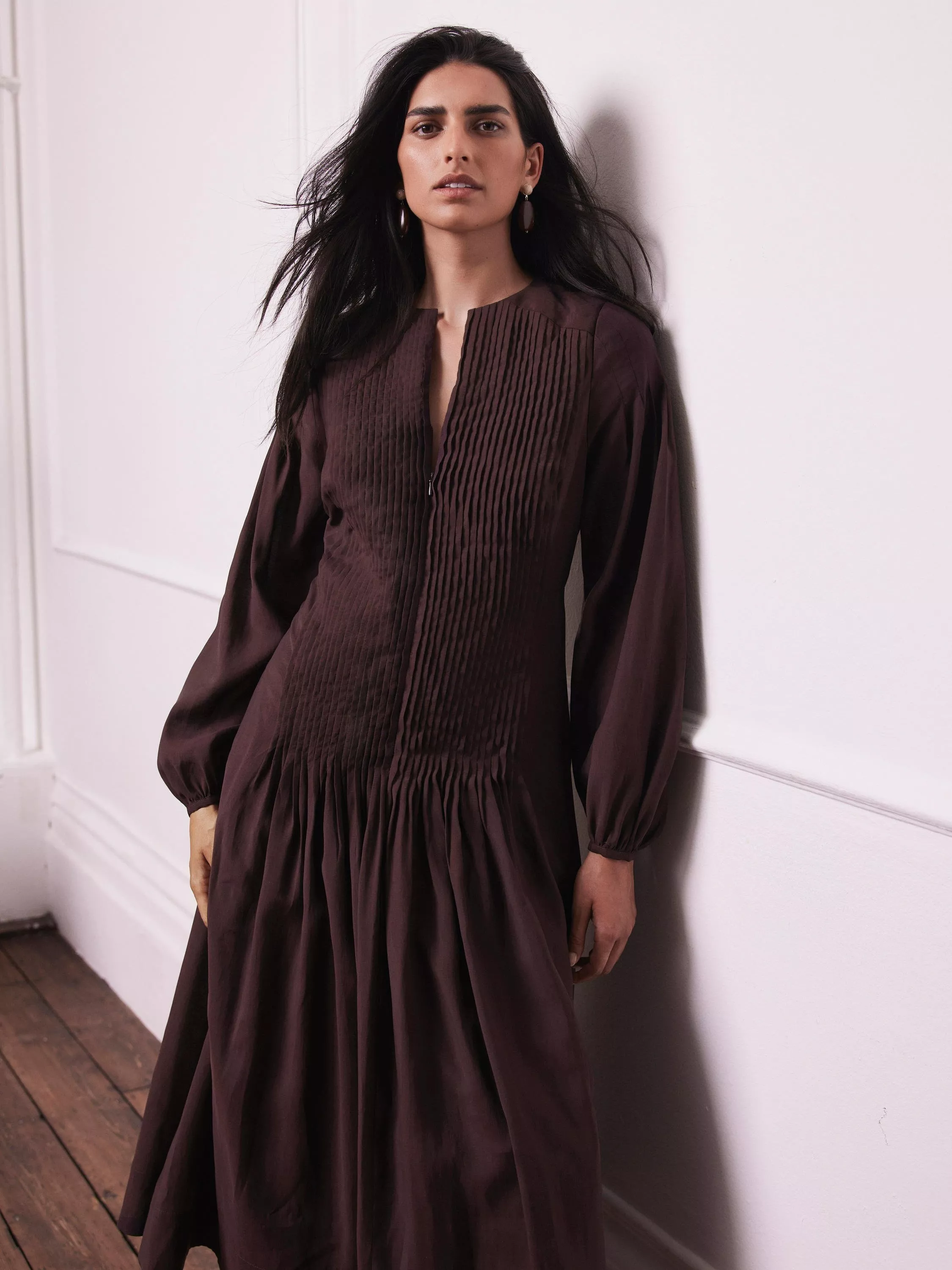 A dress in a maxi silhouette with a crew neckline, long sleeves, elasticated buttoned cuffs, pin tuck detailing, stitched panelling featuring a zip fastening through the front.