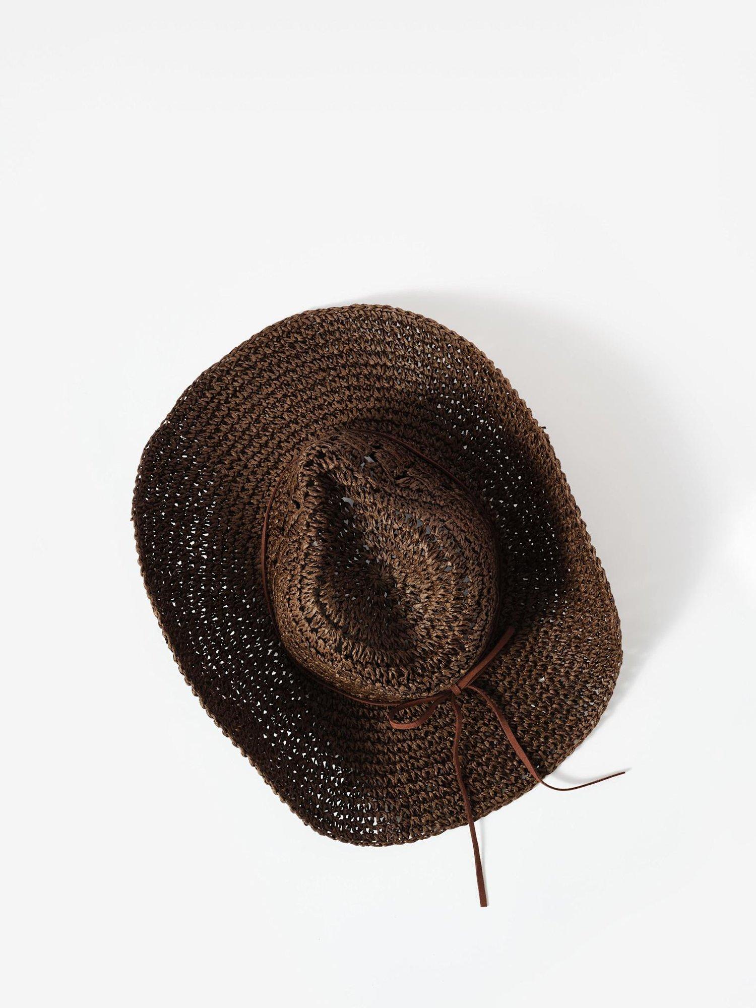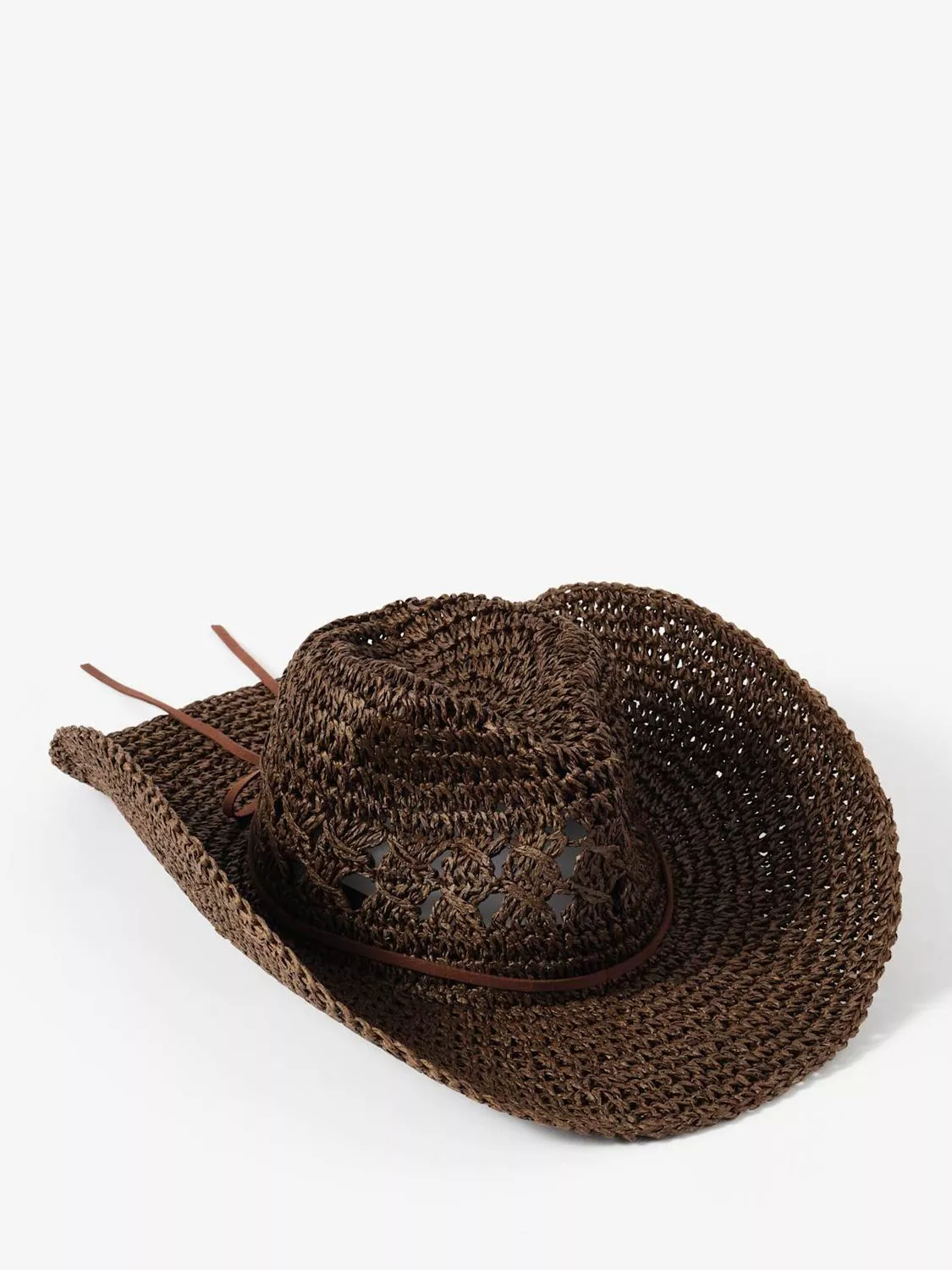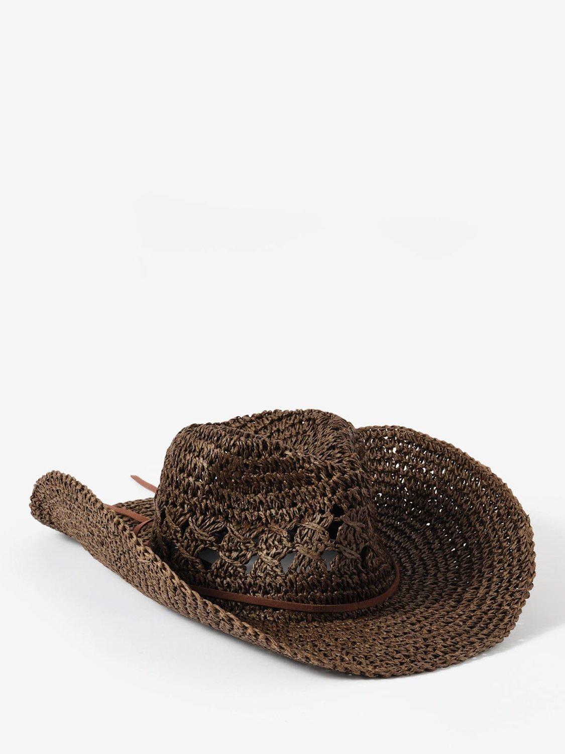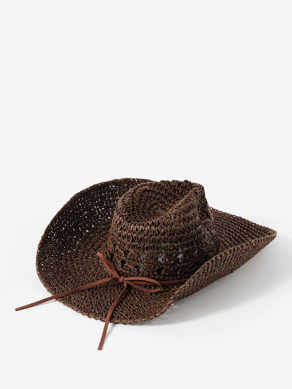 Brown paper straw cowboy hat featuring a brown cord bow detail.