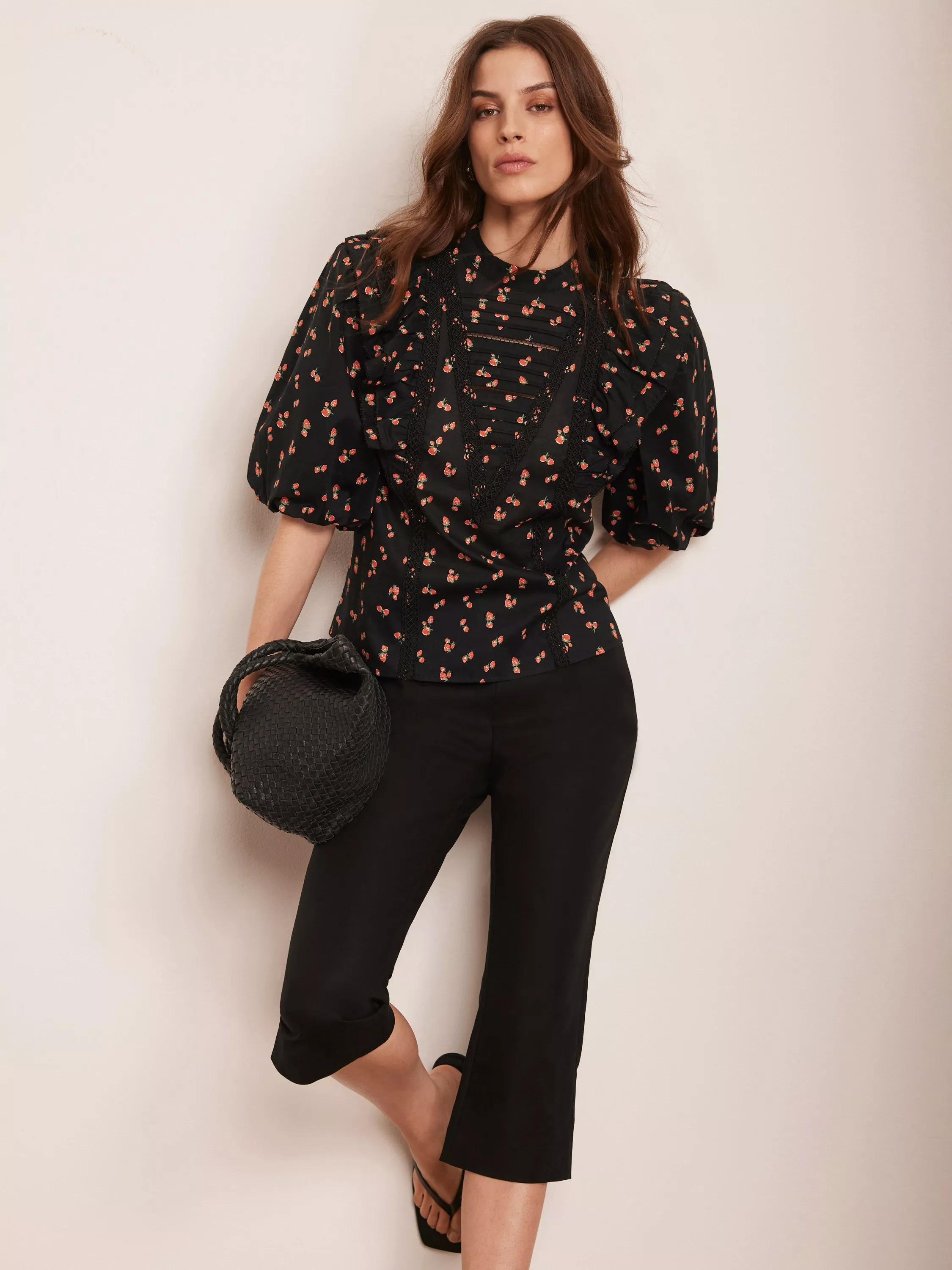 A pure cotton top with strawberry print, high neckline, pin-tuck detailing, ruffle shoulders, open stitch trim, short puff sleeves and a button fastening through the back.