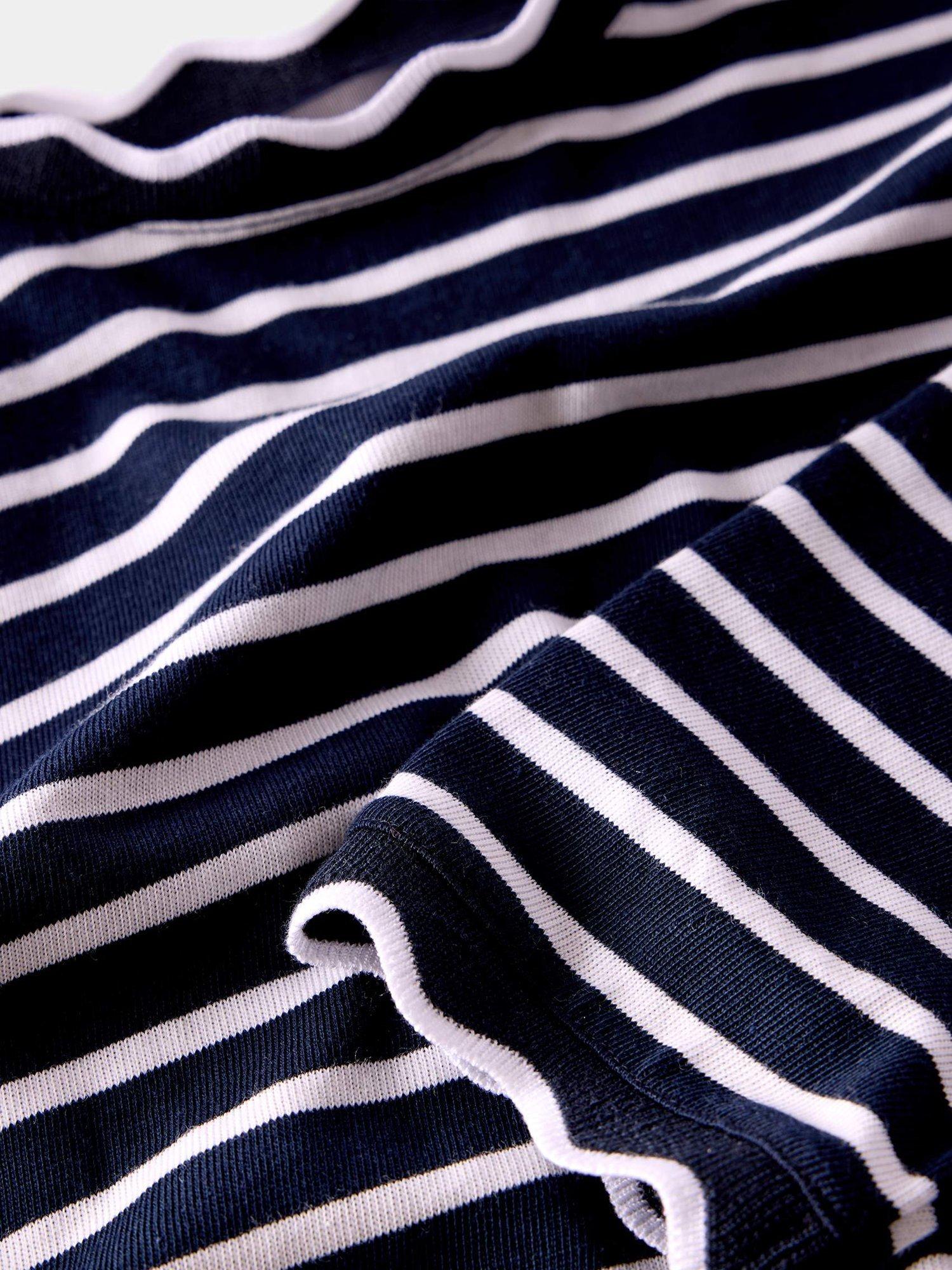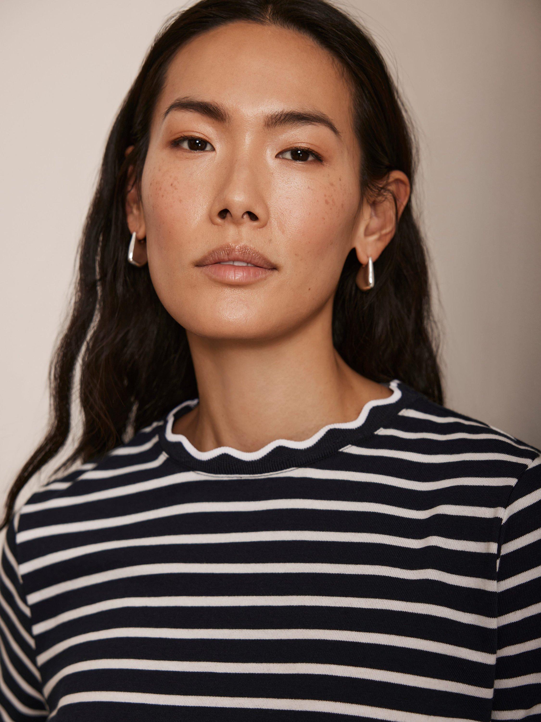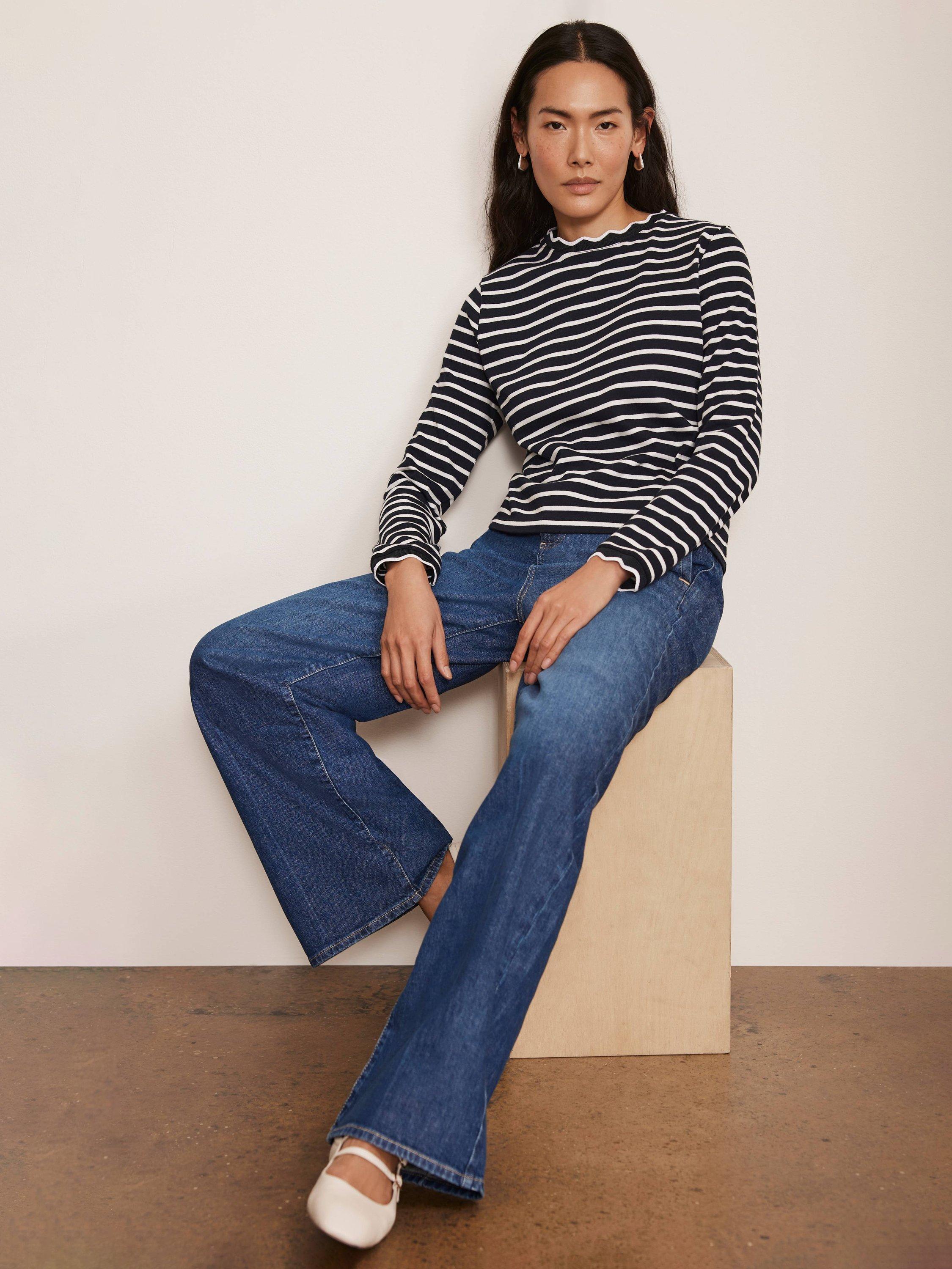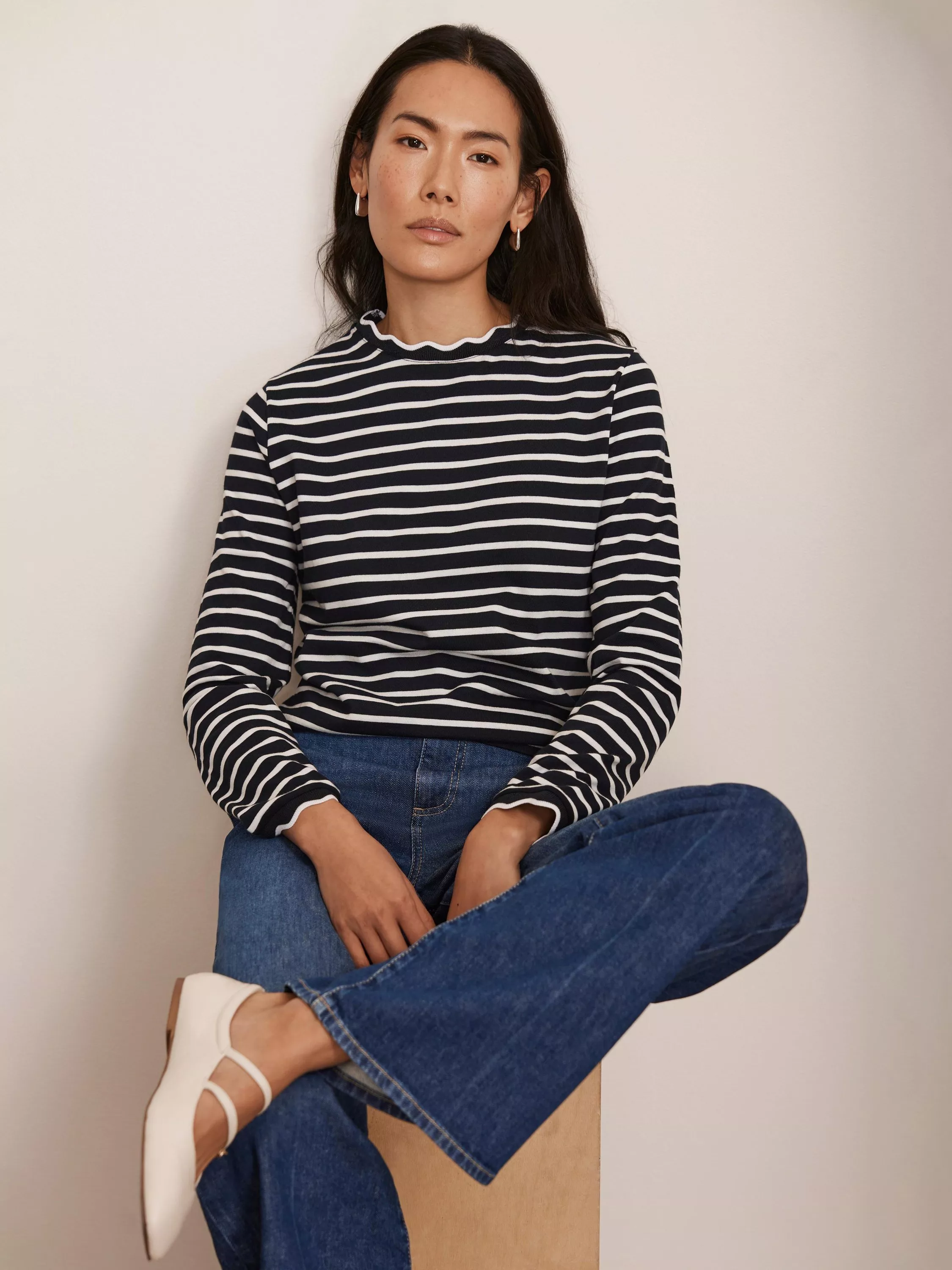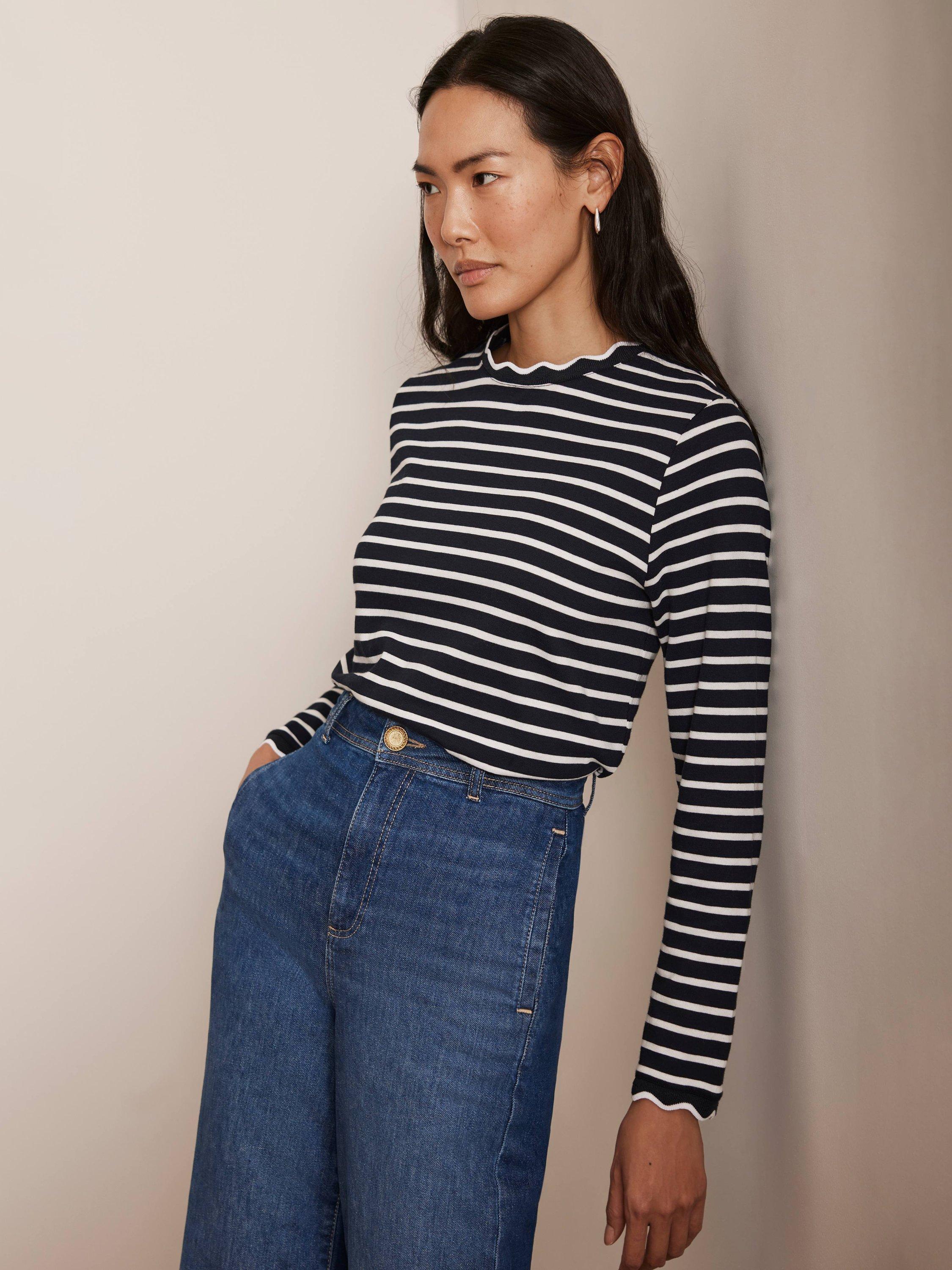A striped top with a crew neckline, long sleeves and ruffle trim.