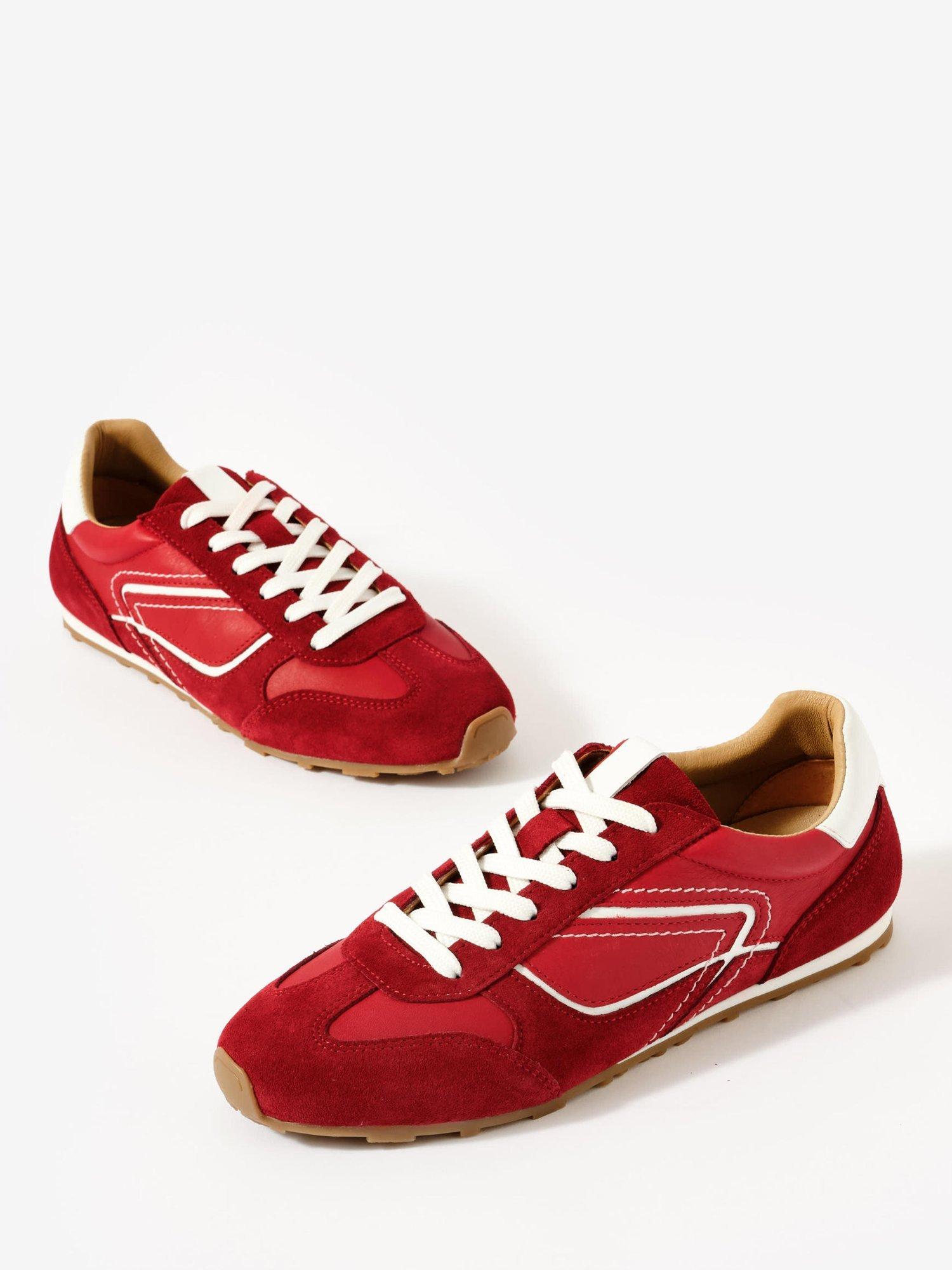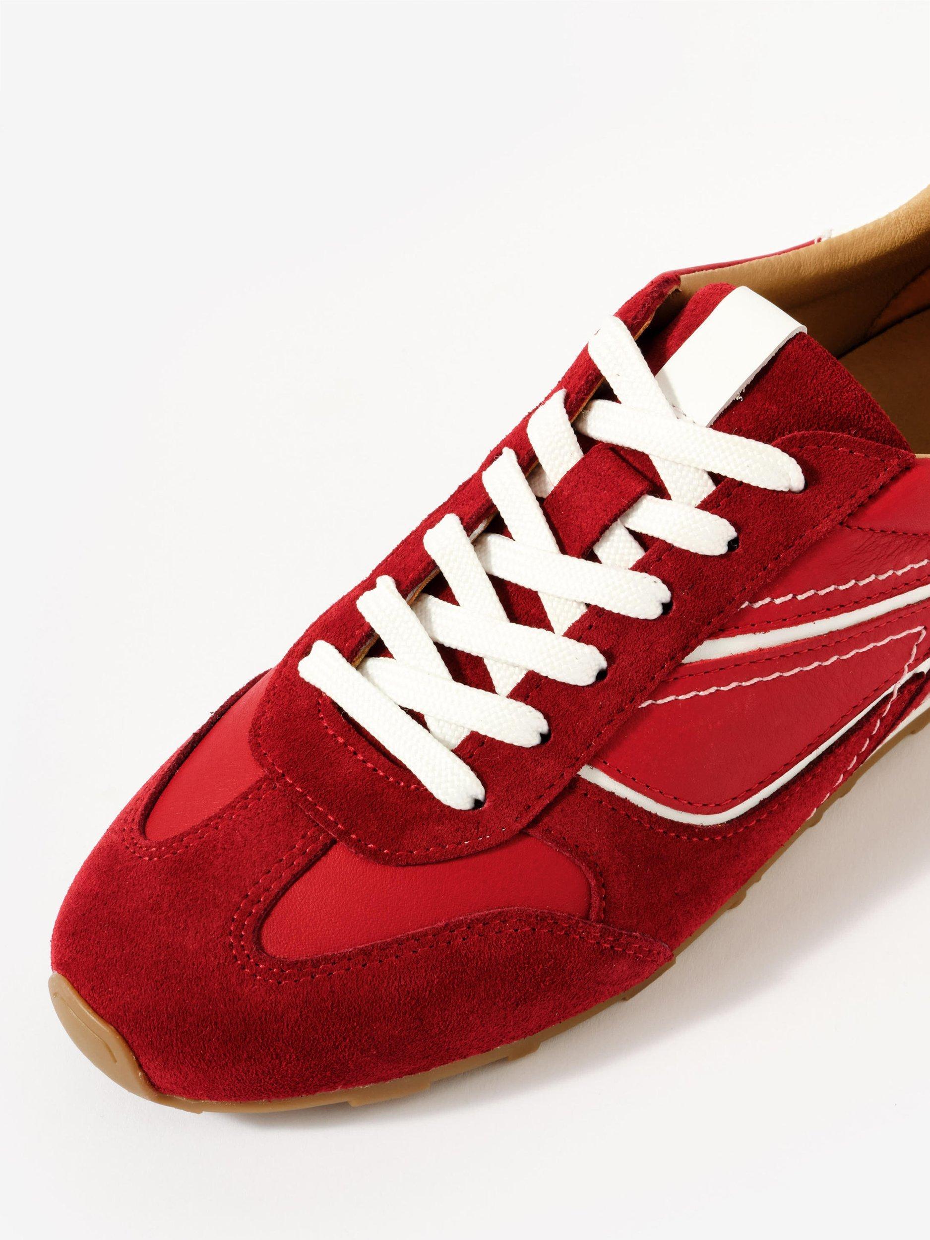 A pair of butter-soft suede trainers by Mint Velvet, set on a flat heel and shaped with a round closed toe.