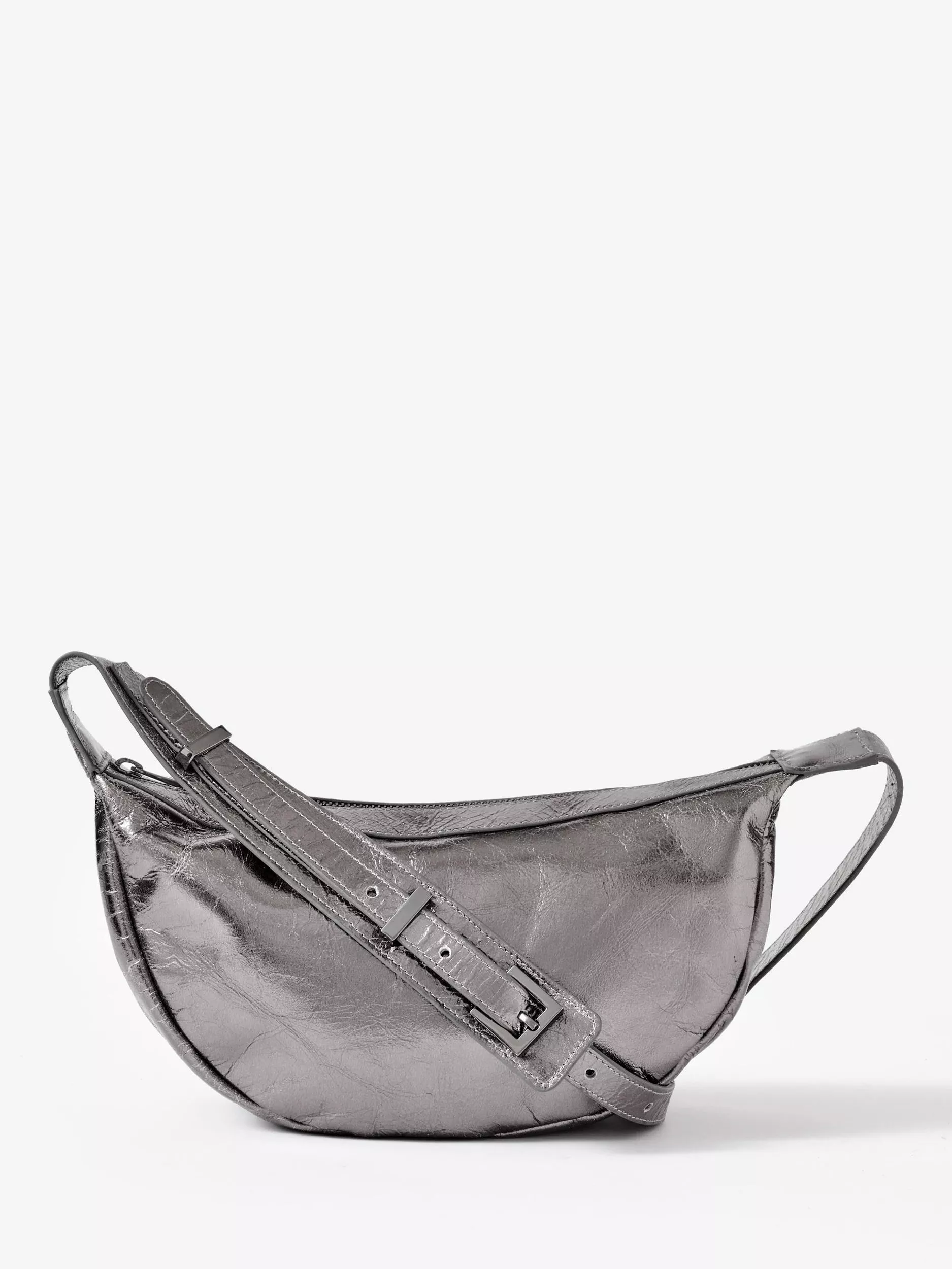 A suede scoop sling bag with a zip along the top and a buckled crossbody strap.