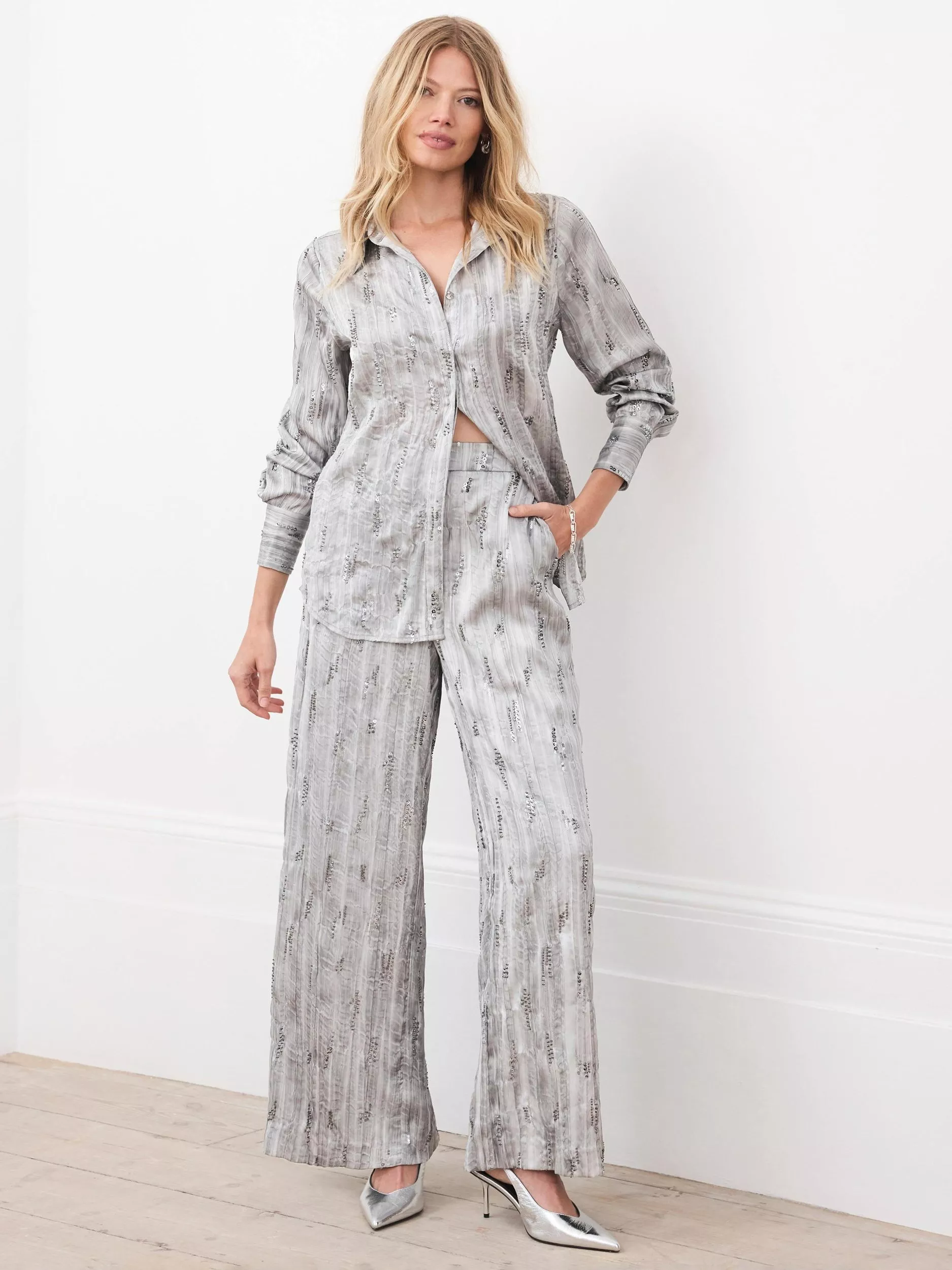 Where low-key volume meets sharp tailoring - a pair of wide-leg trousers from Mint Velvet. They are designed to sit high on the waist and are finished with embellishment for added sparkle.