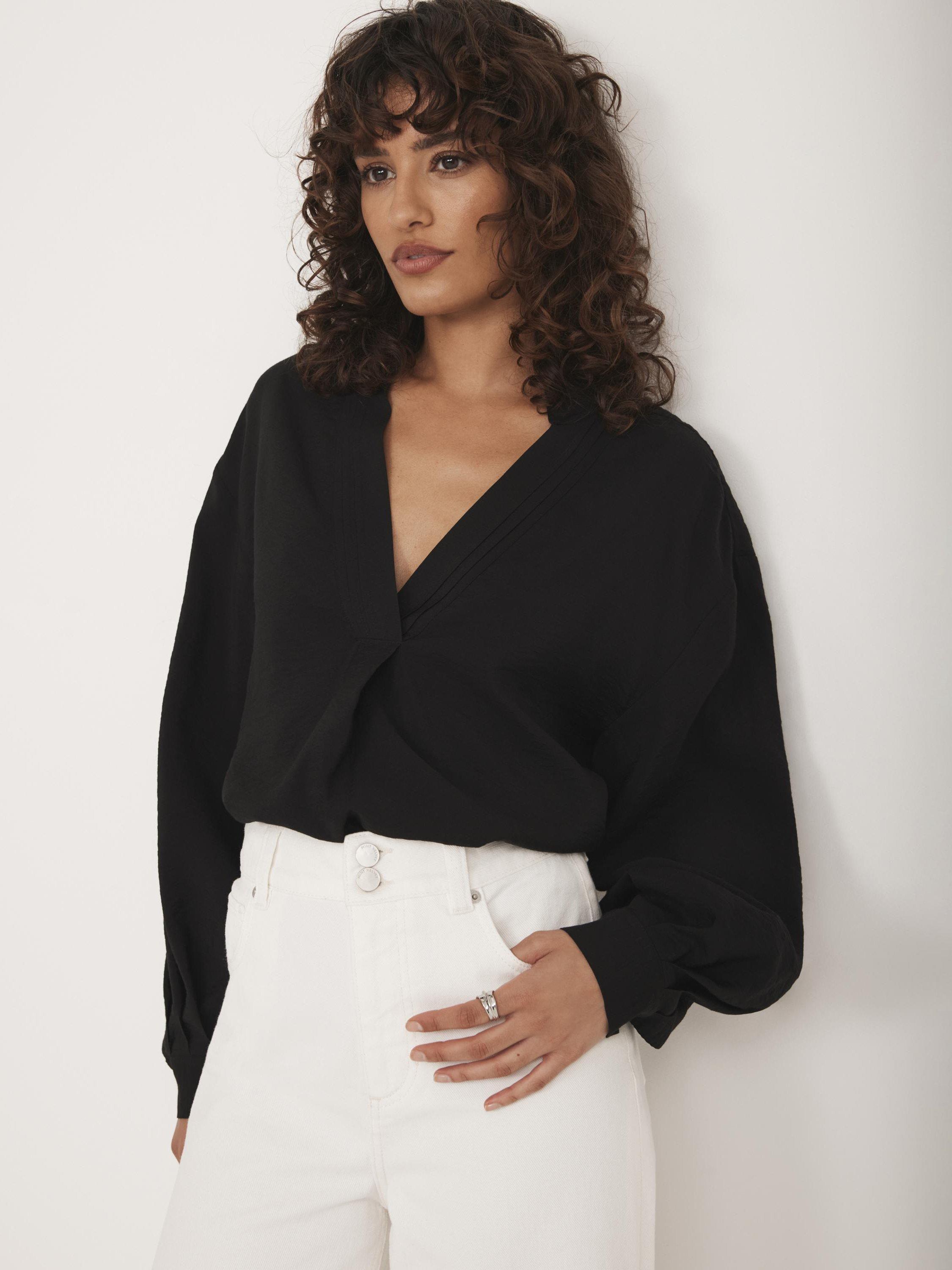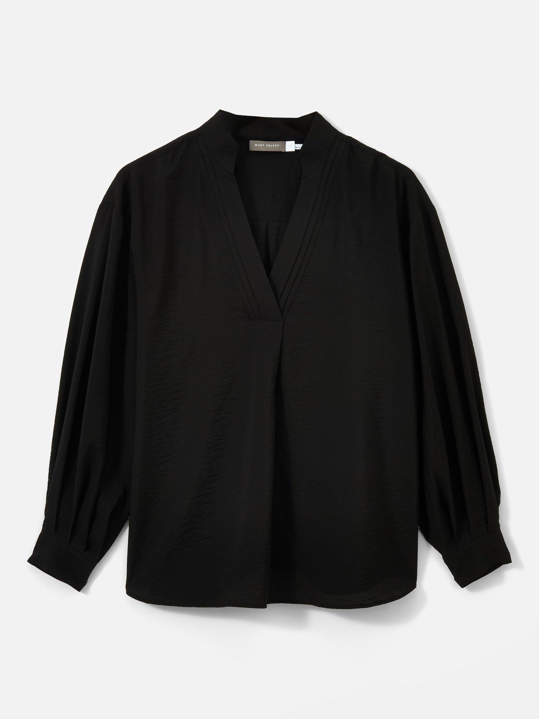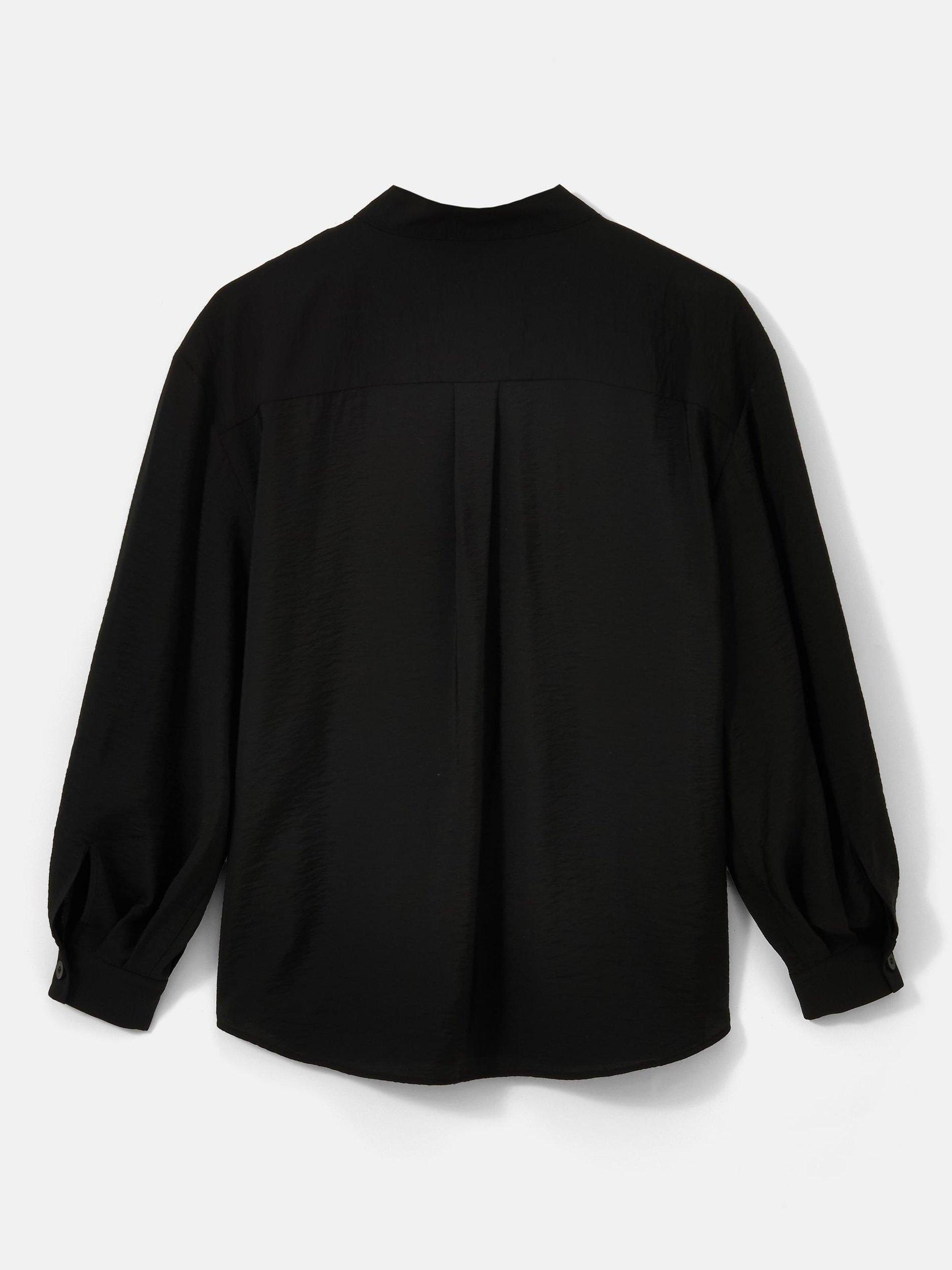 Black throw-on shirt with a V neckline, classic collar and long sleeves with buttoned cuffs.