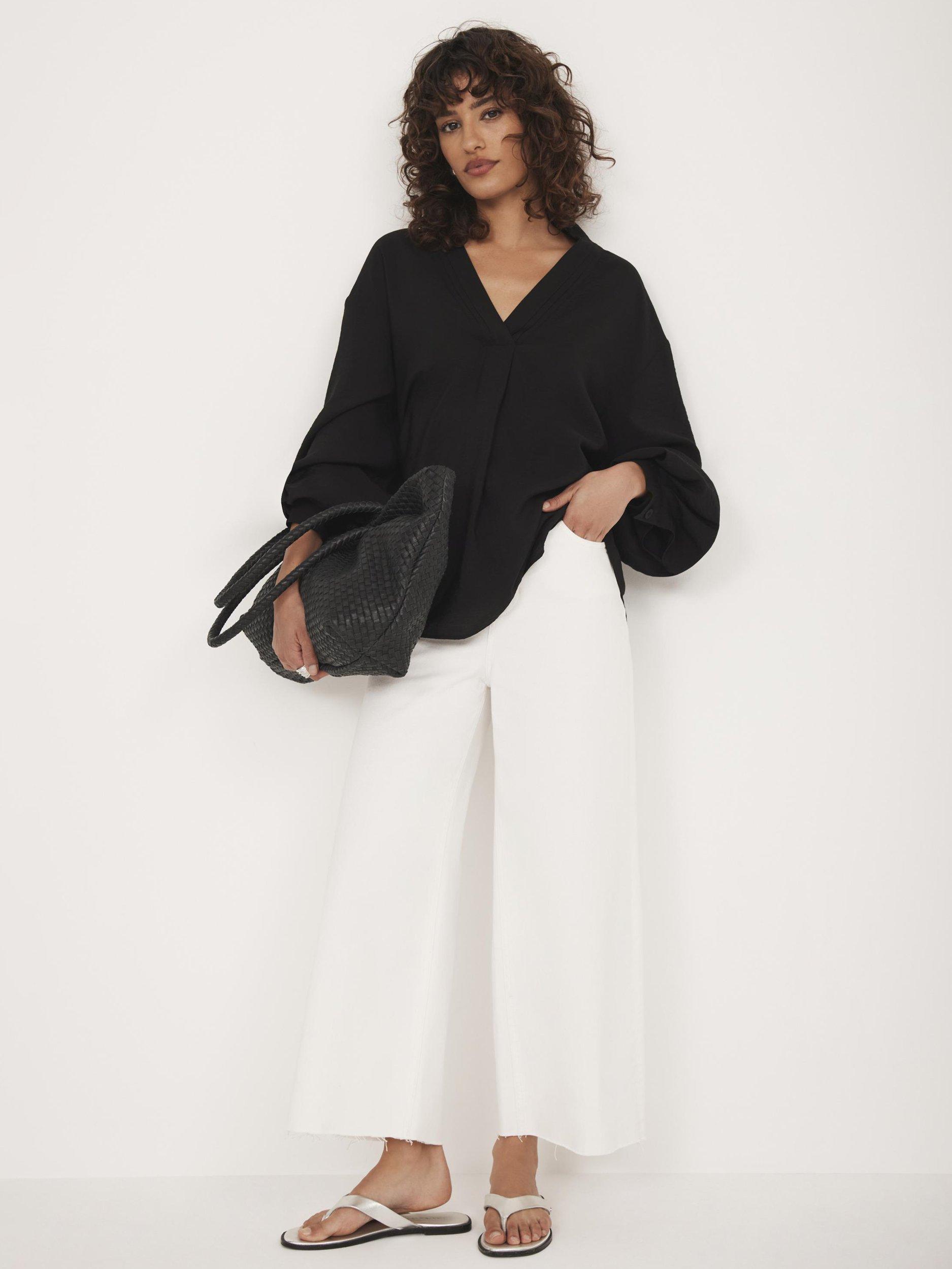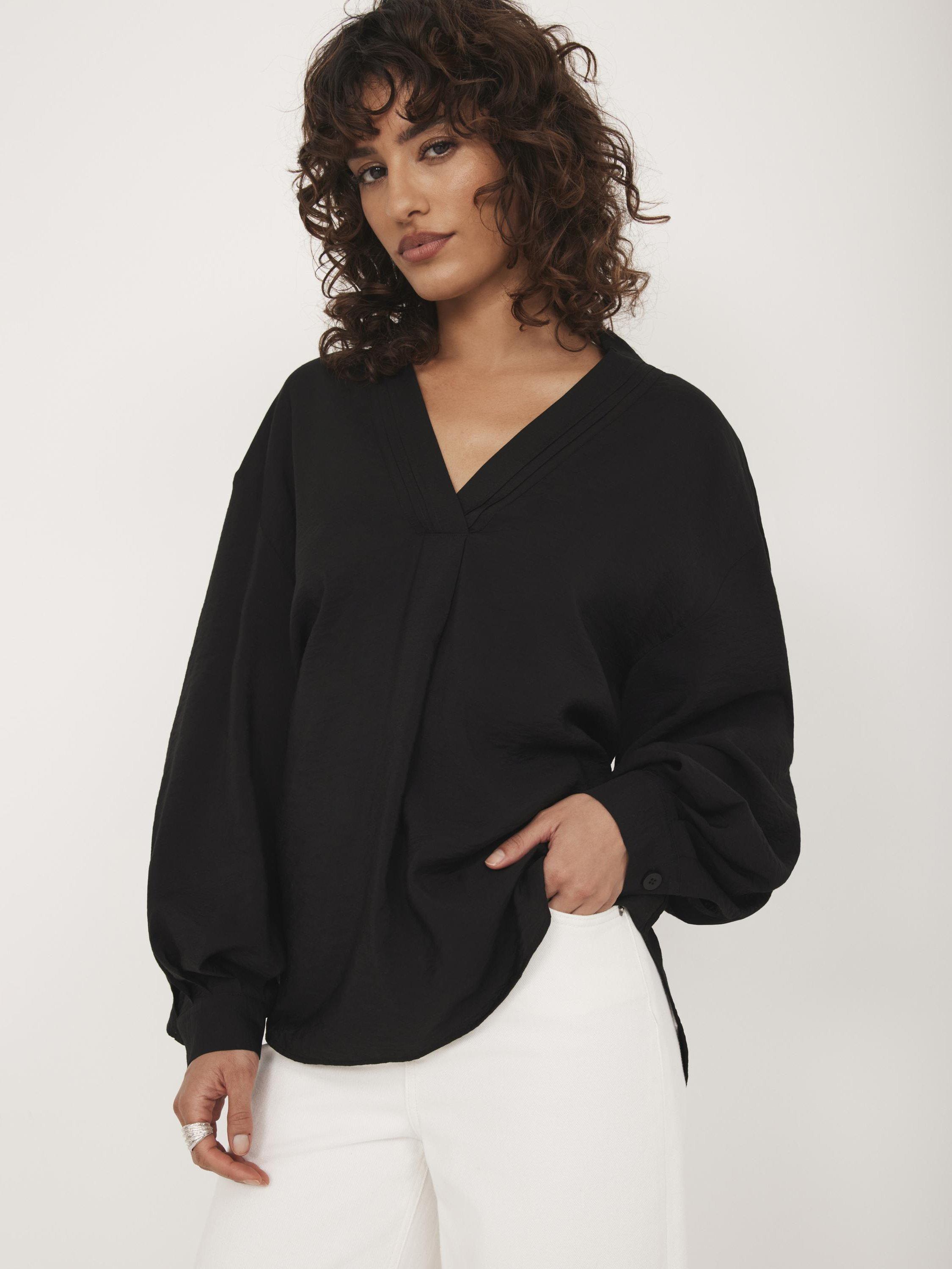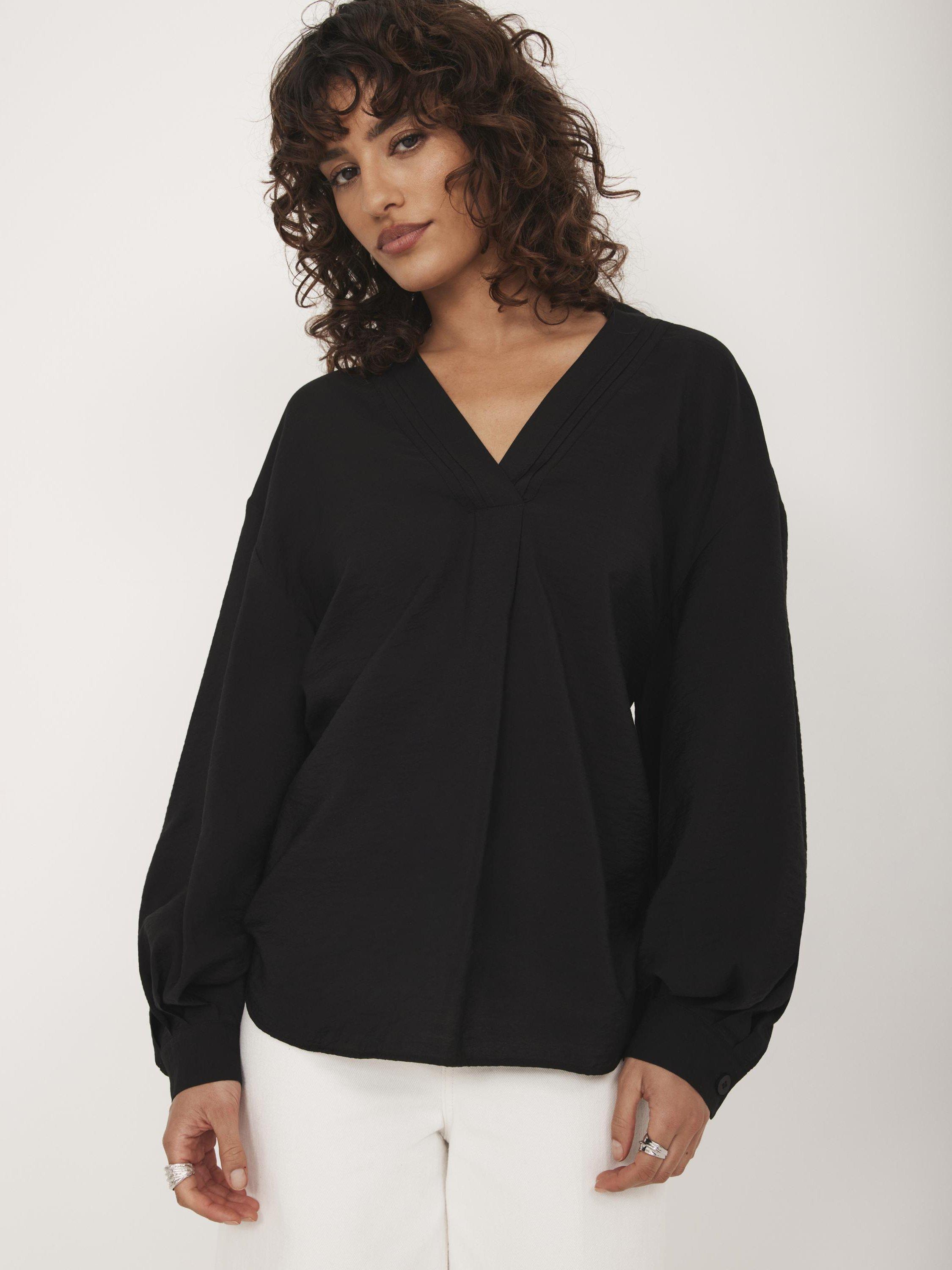 Black throw-on shirt with a V neckline, classic collar and long sleeves with buttoned cuffs.