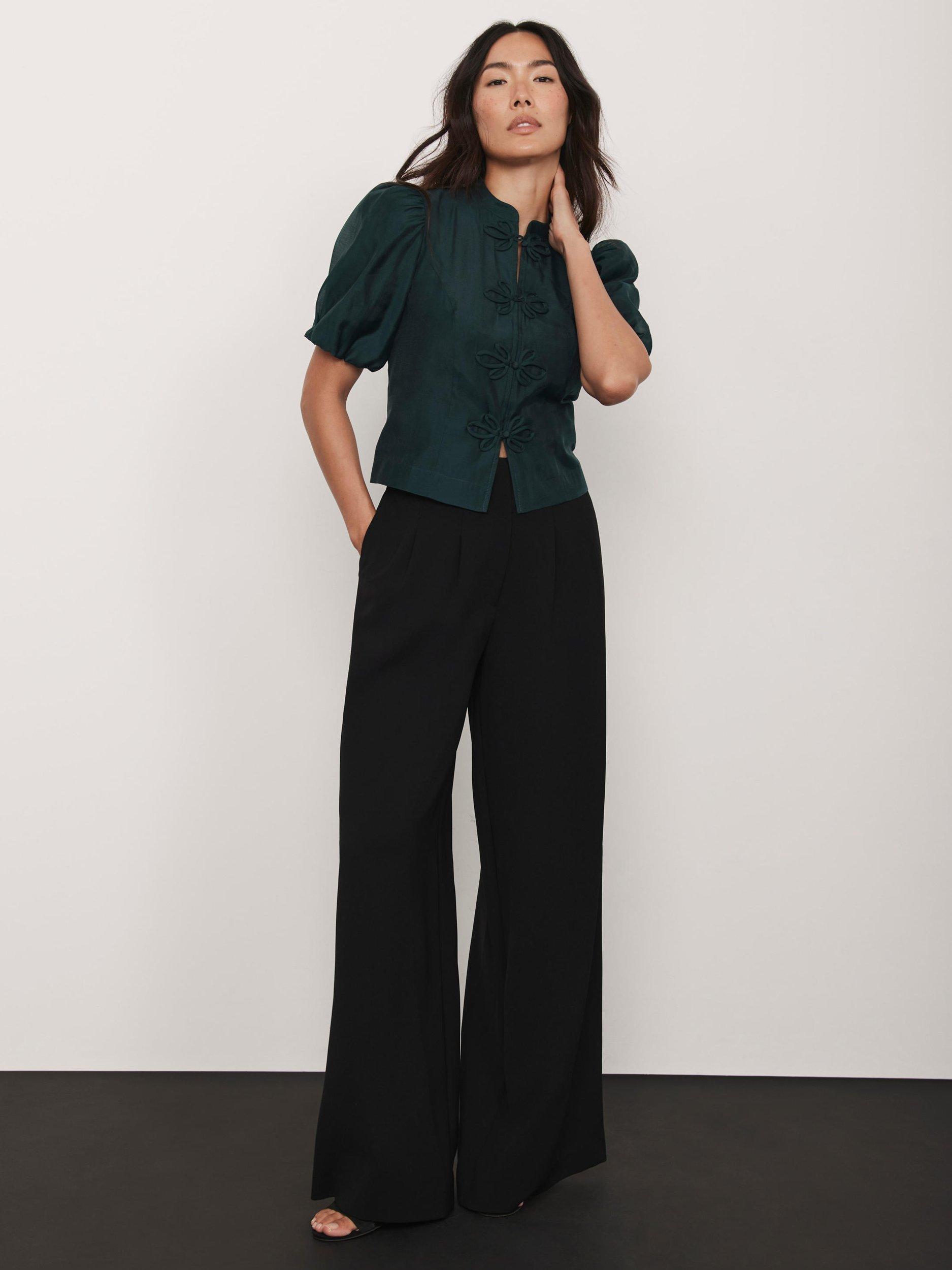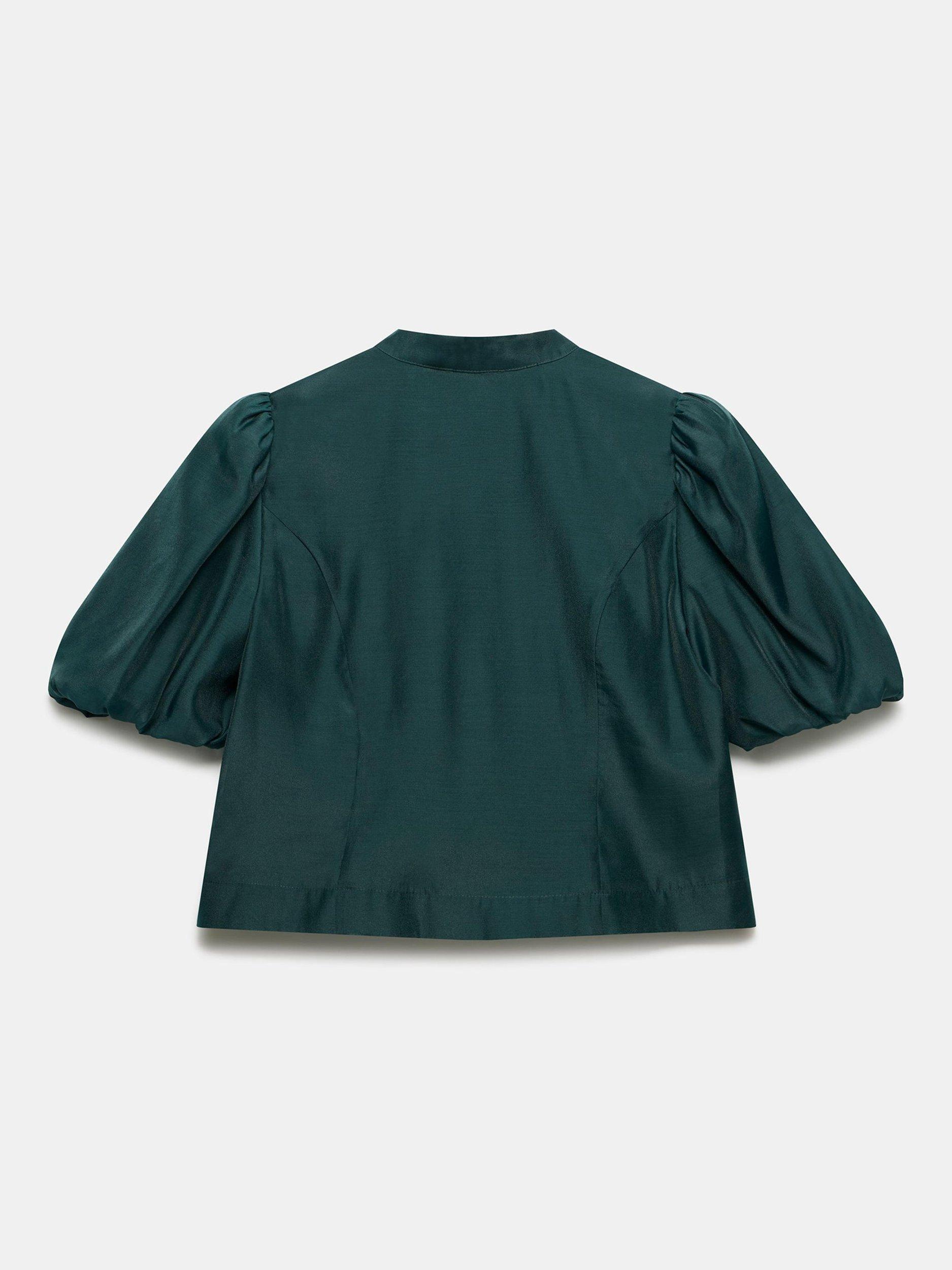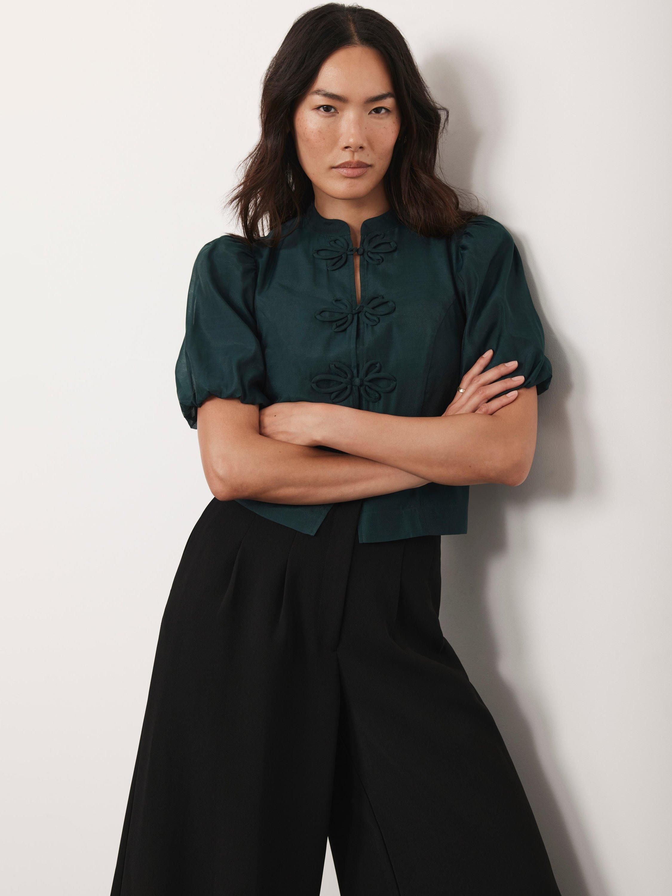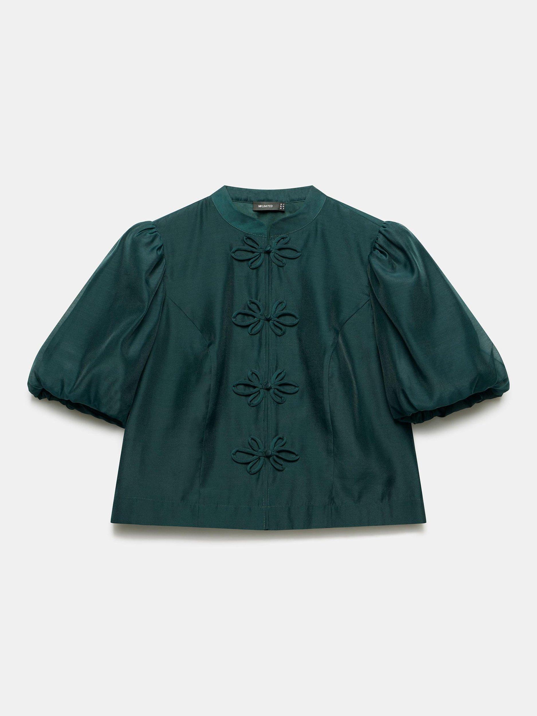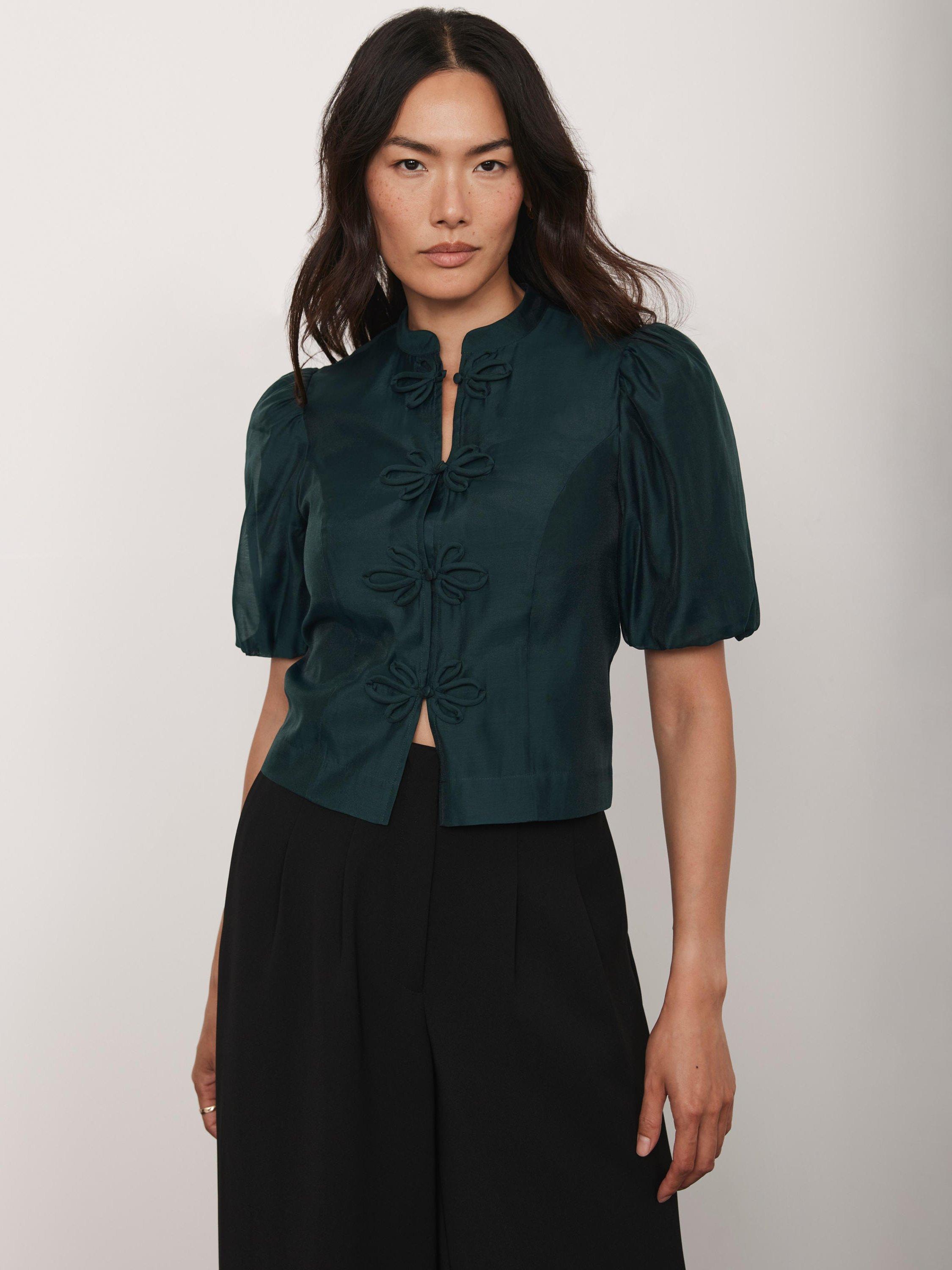 A top with a high neckline, short puff sleeves featuring a floral button fastening through the front.