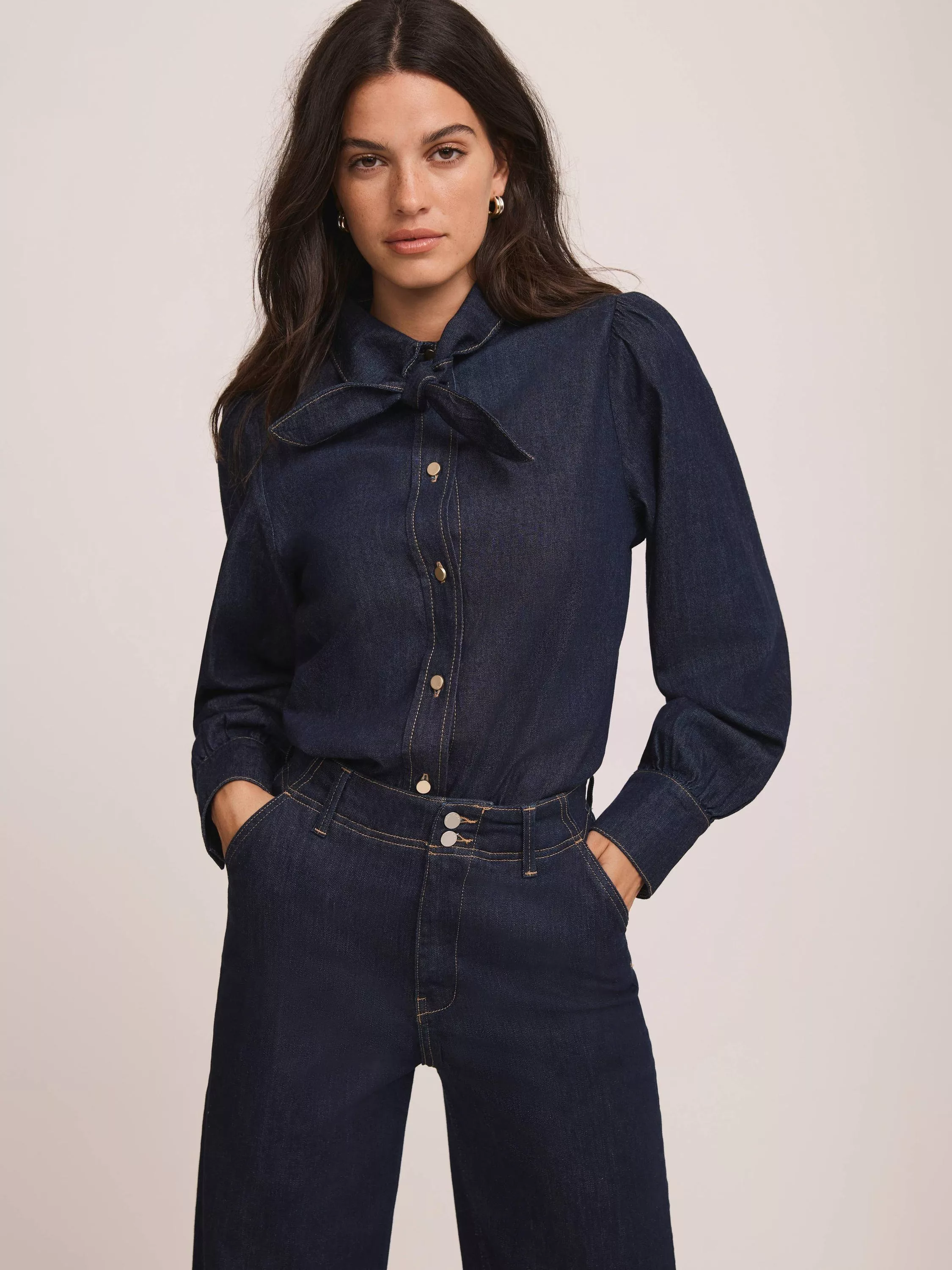 A blouse by Mint Velvet that's light and breathable in cotton. With a tie neck and long sleeves, it comes in a mix-and-match ready plain colour. Effortless style for daily dressing.