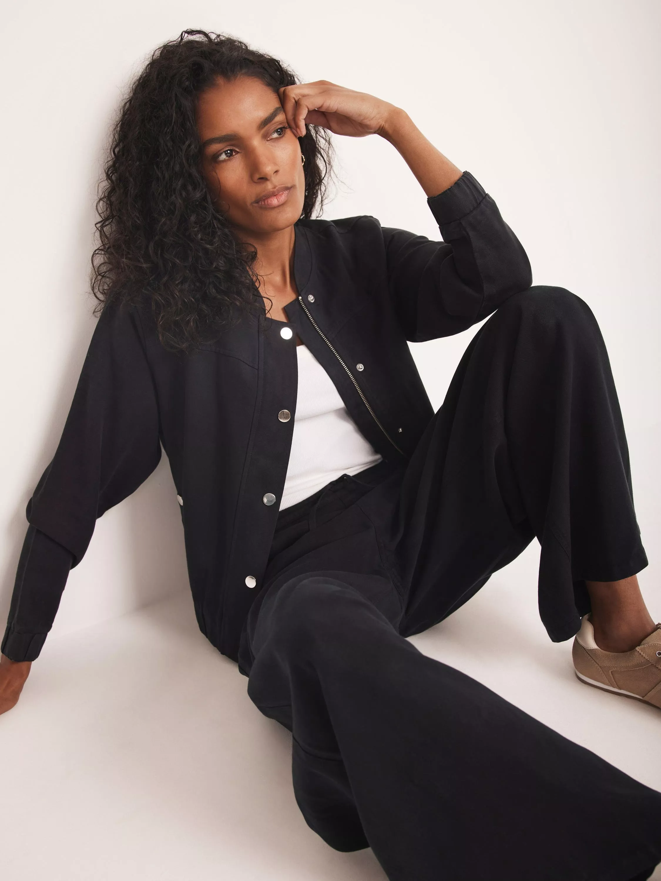 Neutral tone jacket with a classic bomber collar, long sleeves, elasticated cuffs, popper welt pockets, drawstring waistband with a popper fastening through the front.