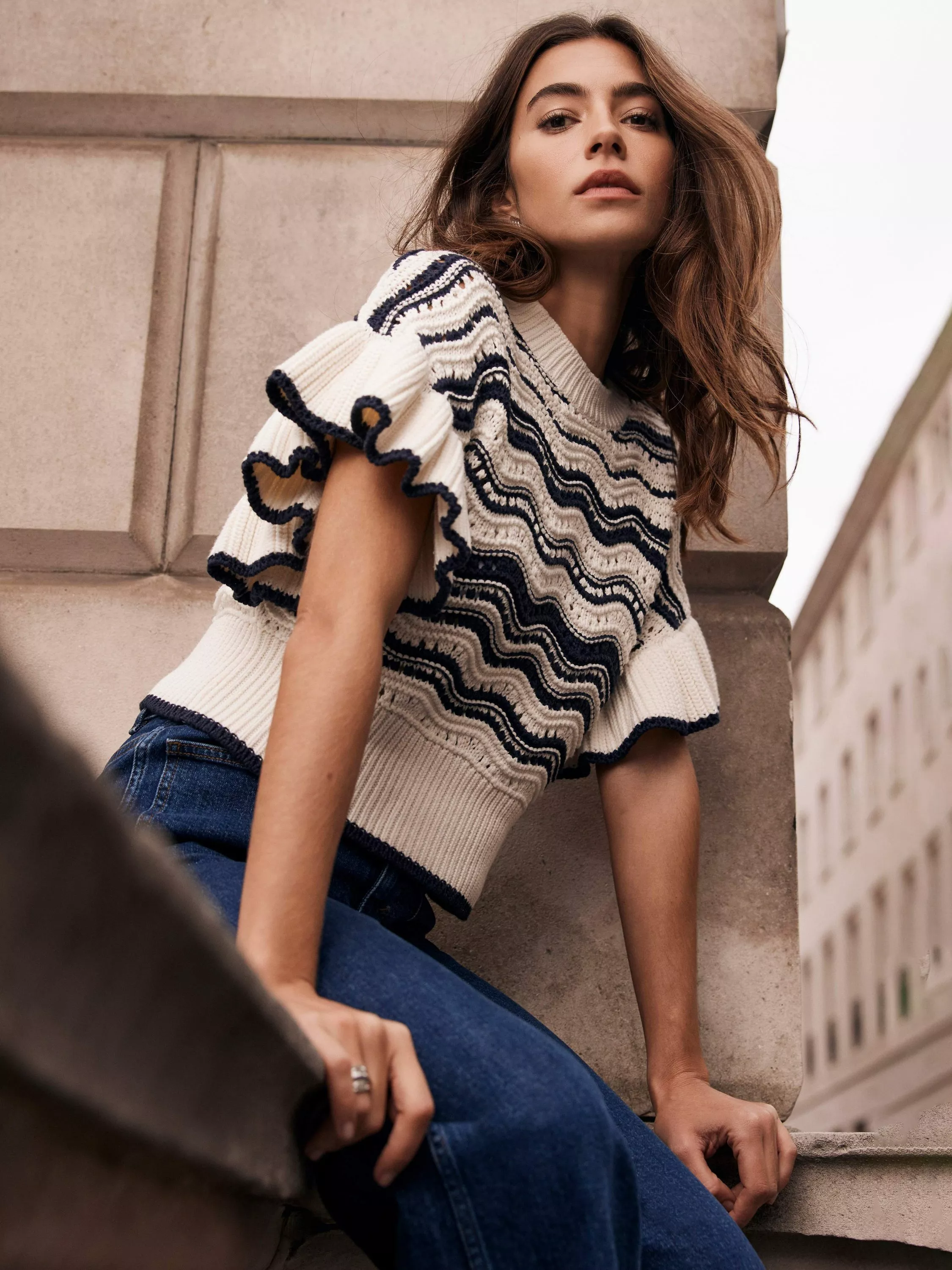 A wavy striped top in a cropped silhouette with a crew neckline, ruffle trim cap sleeves with contrast trim.