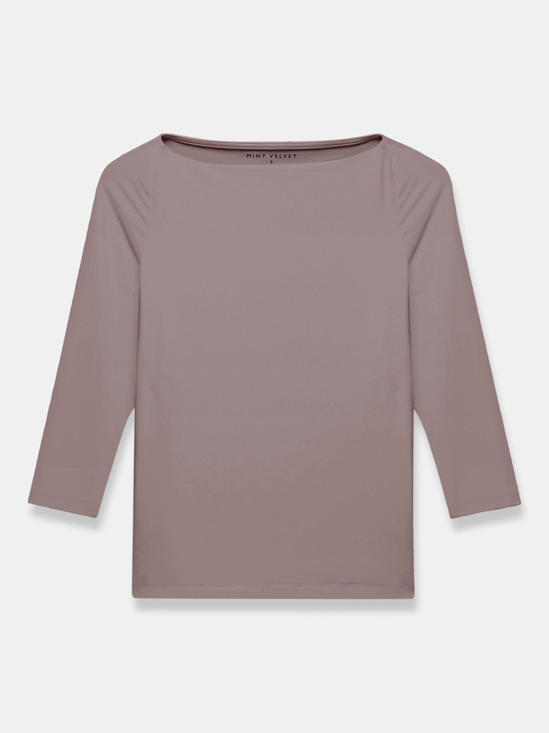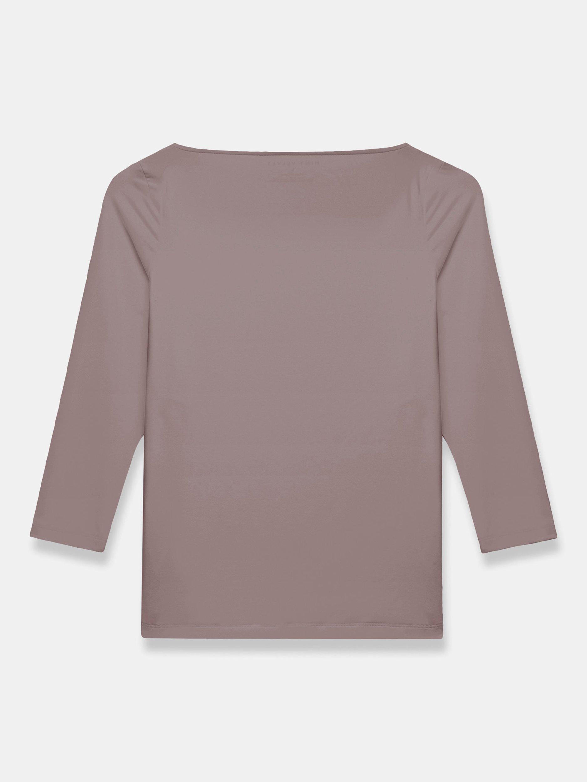 A basic top featuring a wide neckline and 3/4 length sleeves.