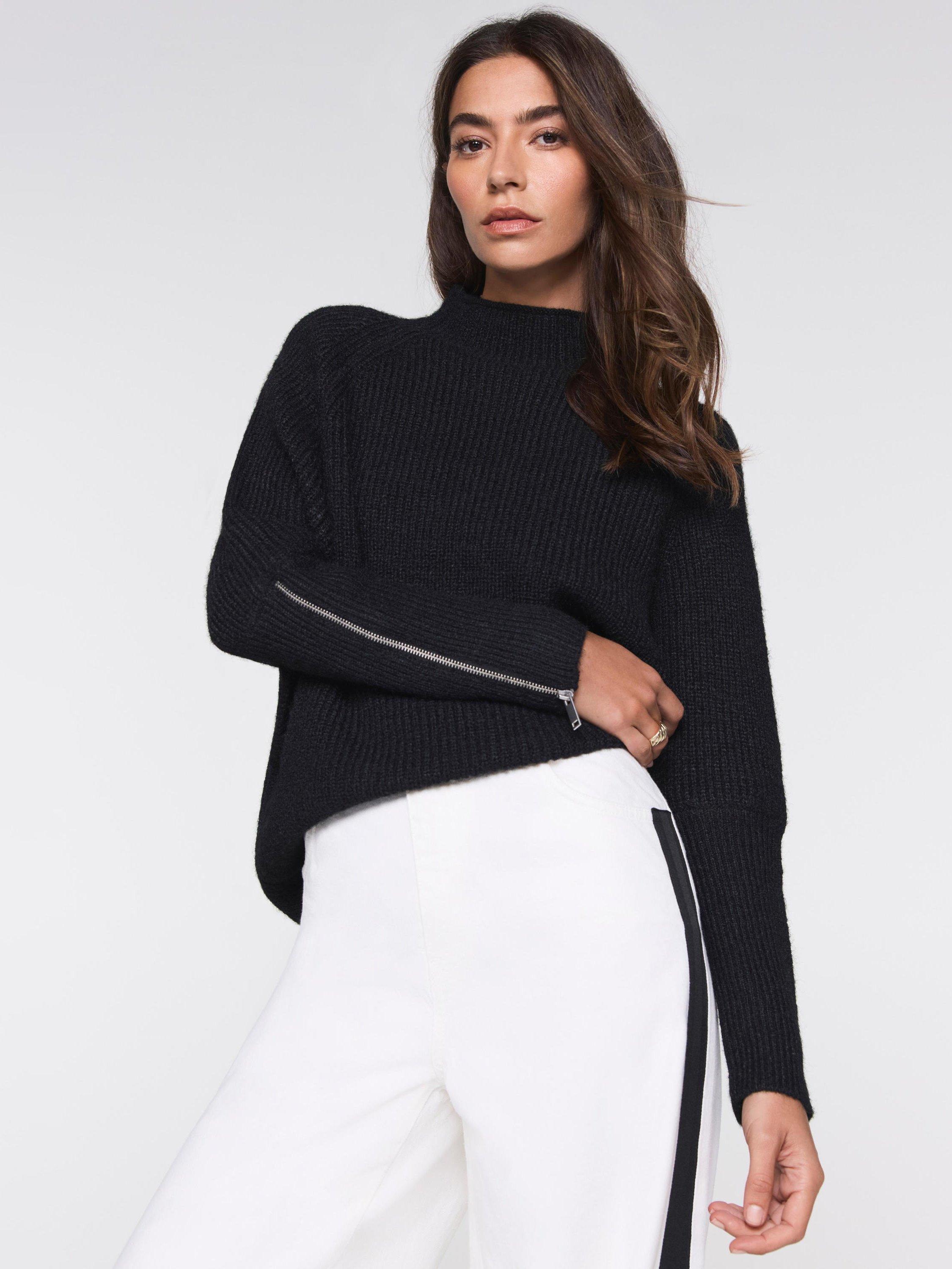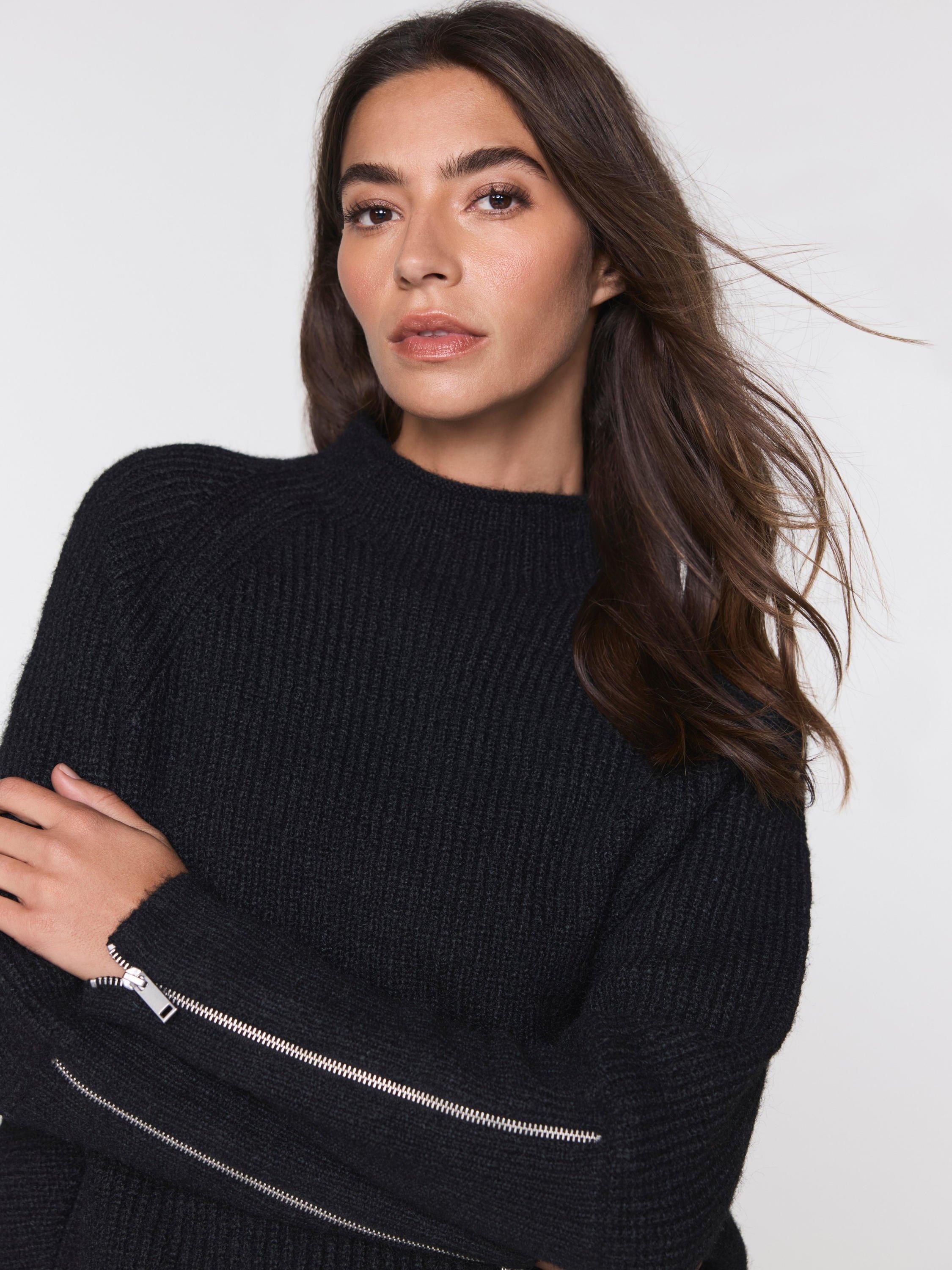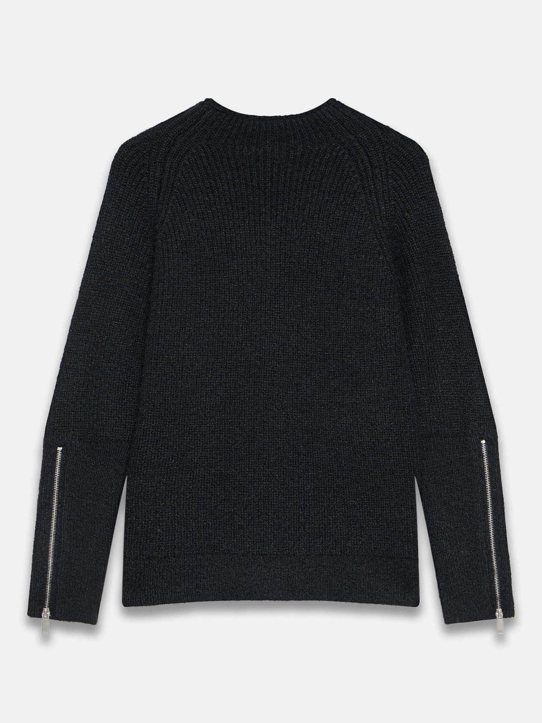 Black knit jumper featuring a crew neckline, long sleeves, exaggerated cuffs with a silver tone zip cuff detail.