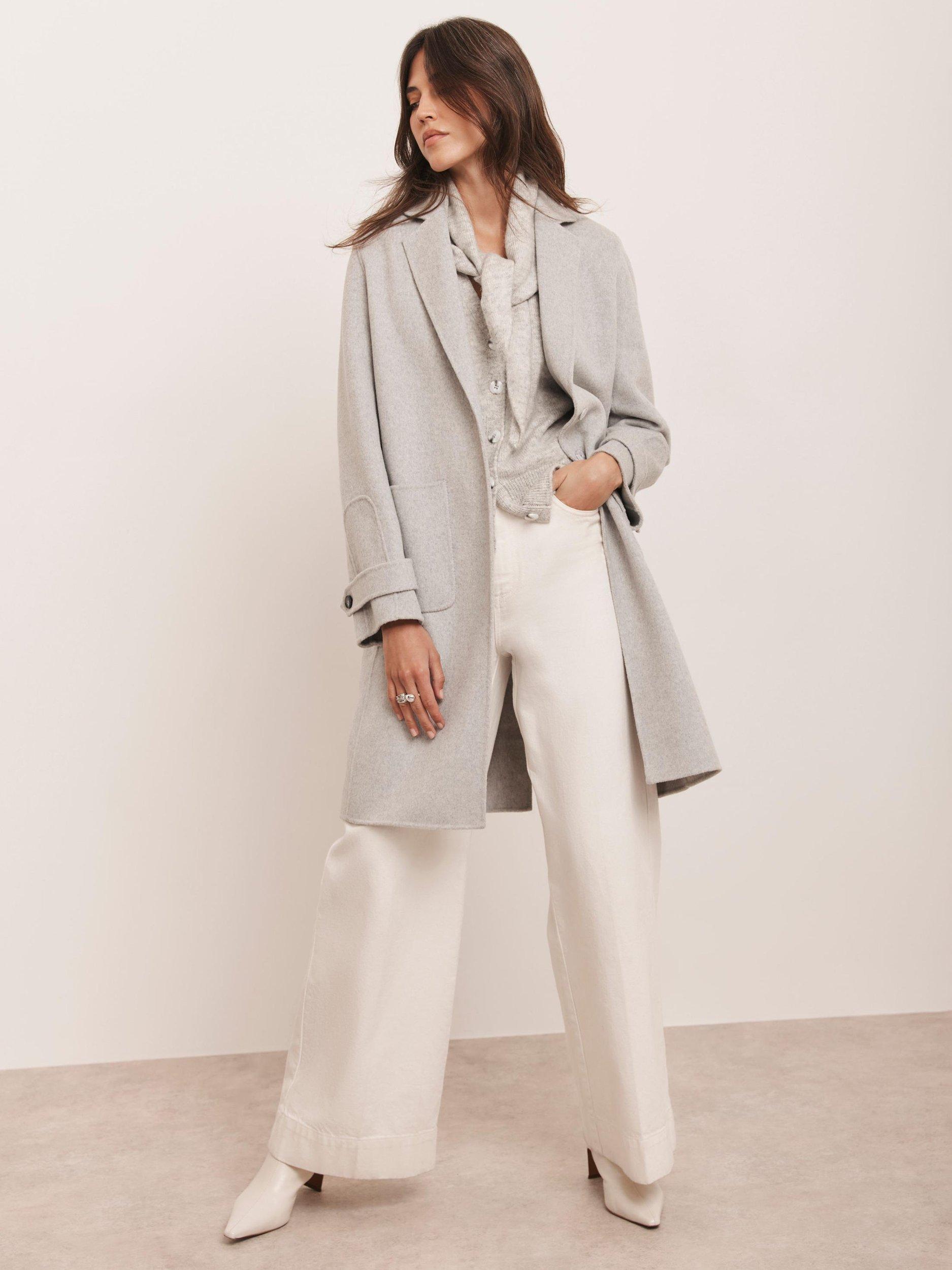A wool blend coat in a midi silhouette with pealed lapels, long sleeves, buttoned cuffs, square pockets, split back and fastening through the front.