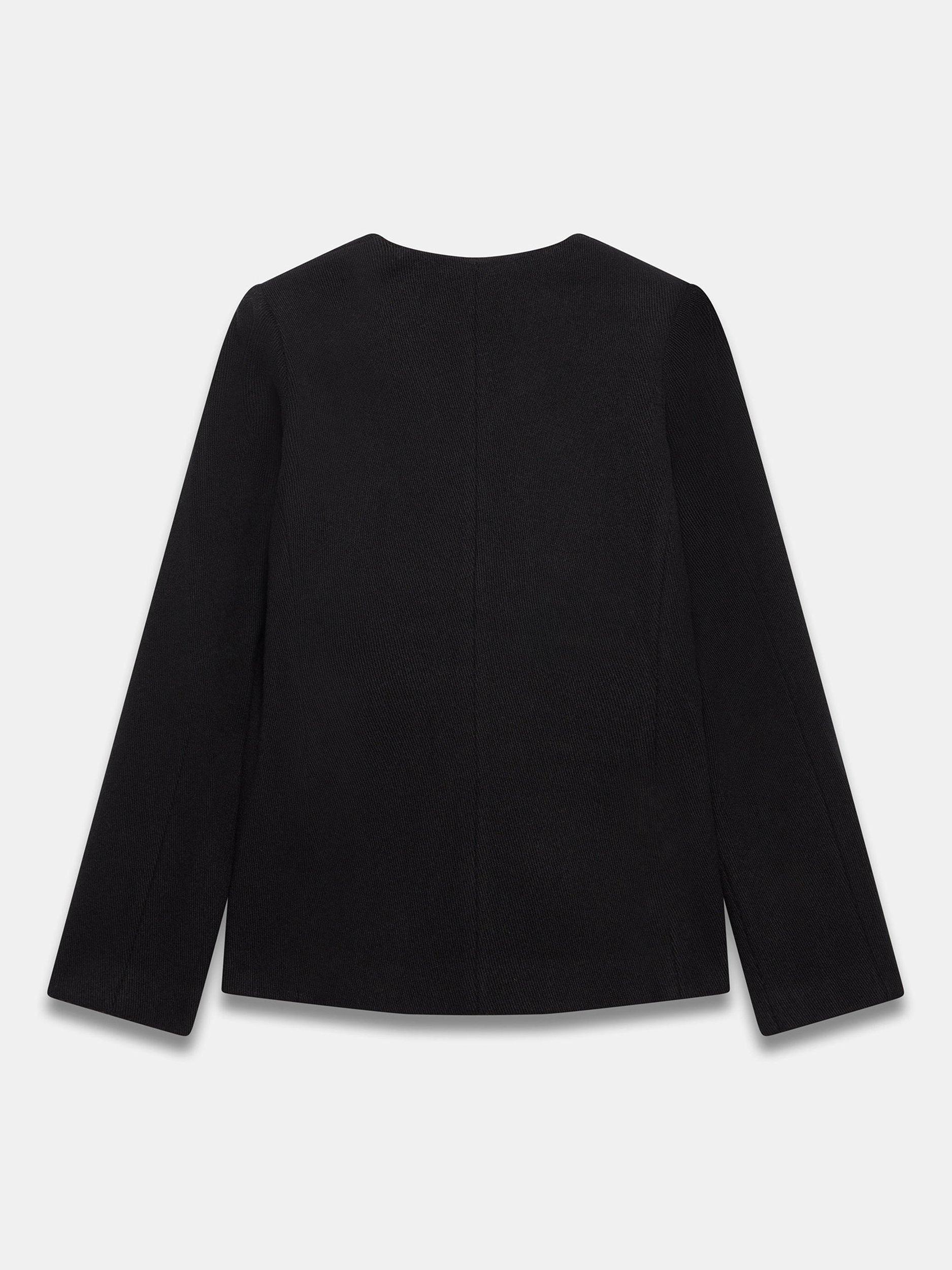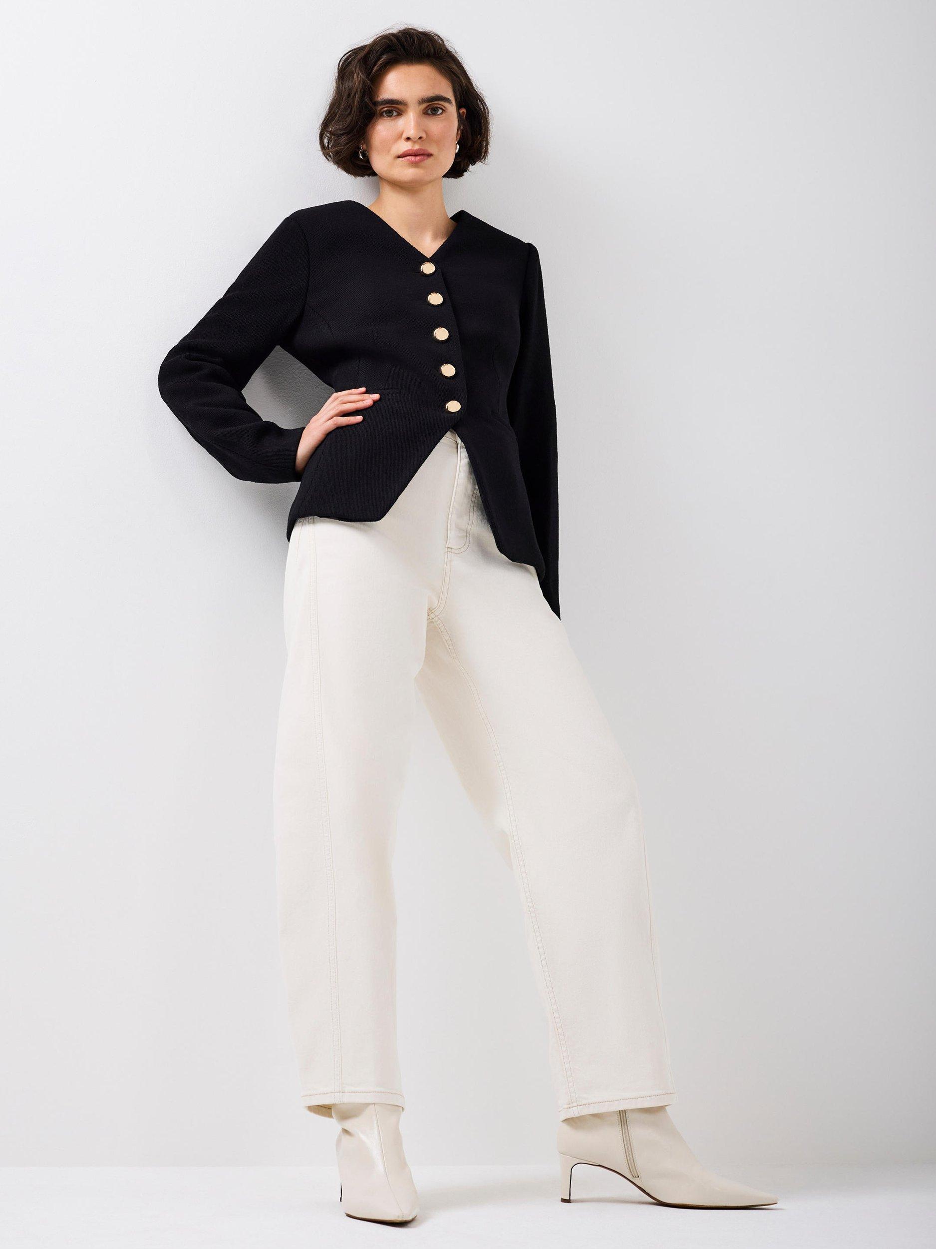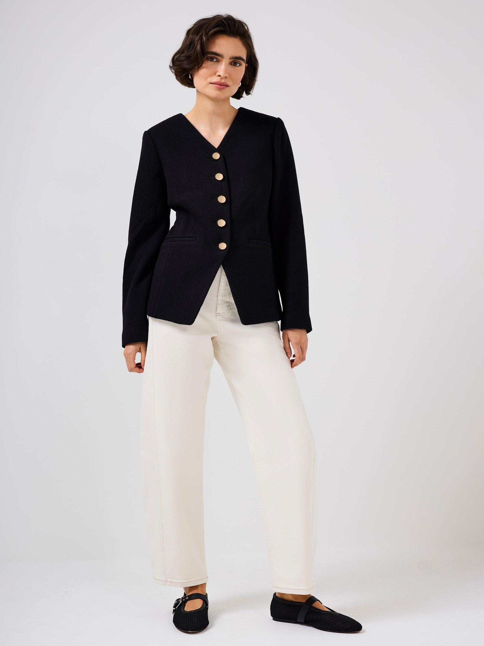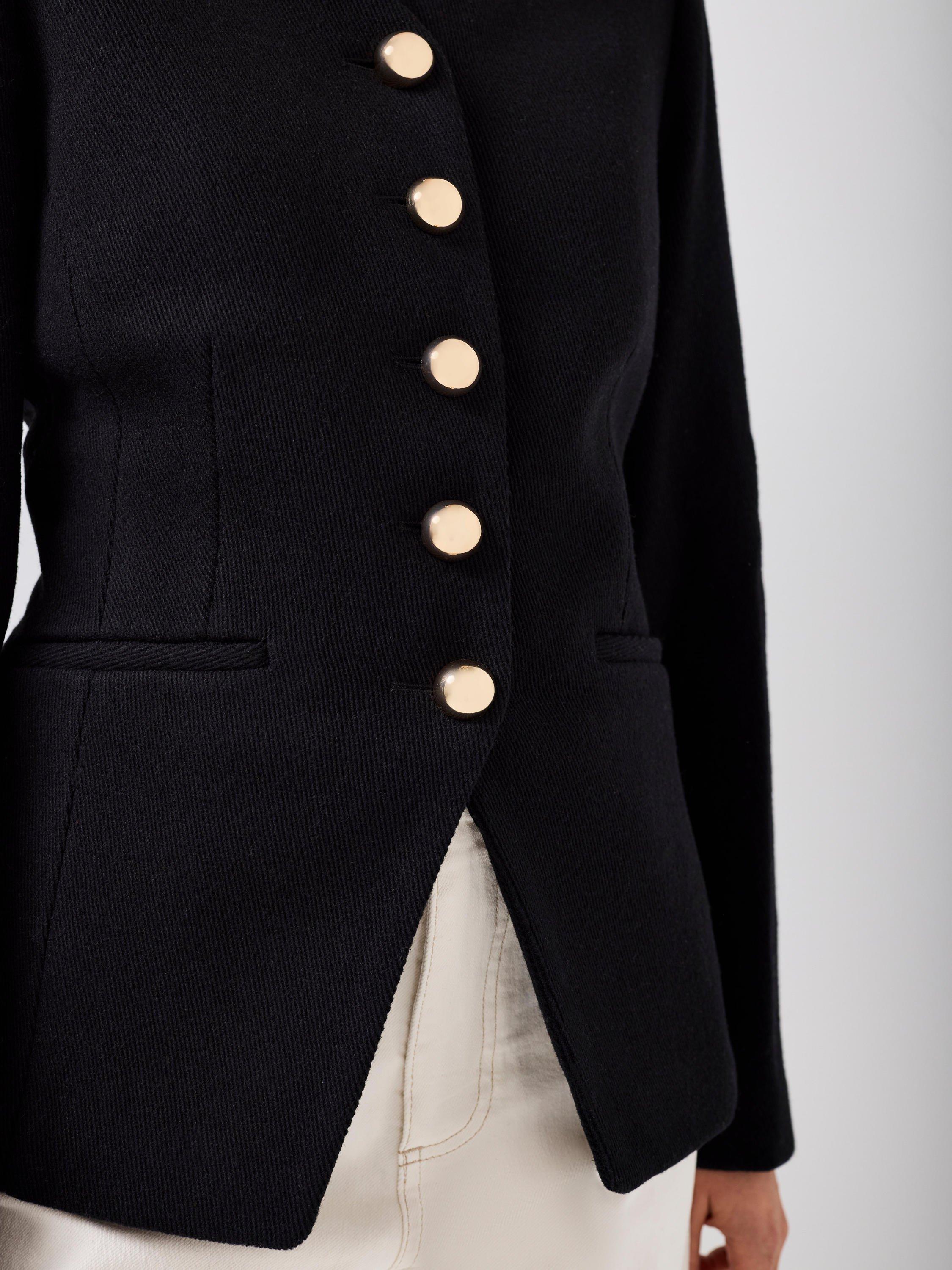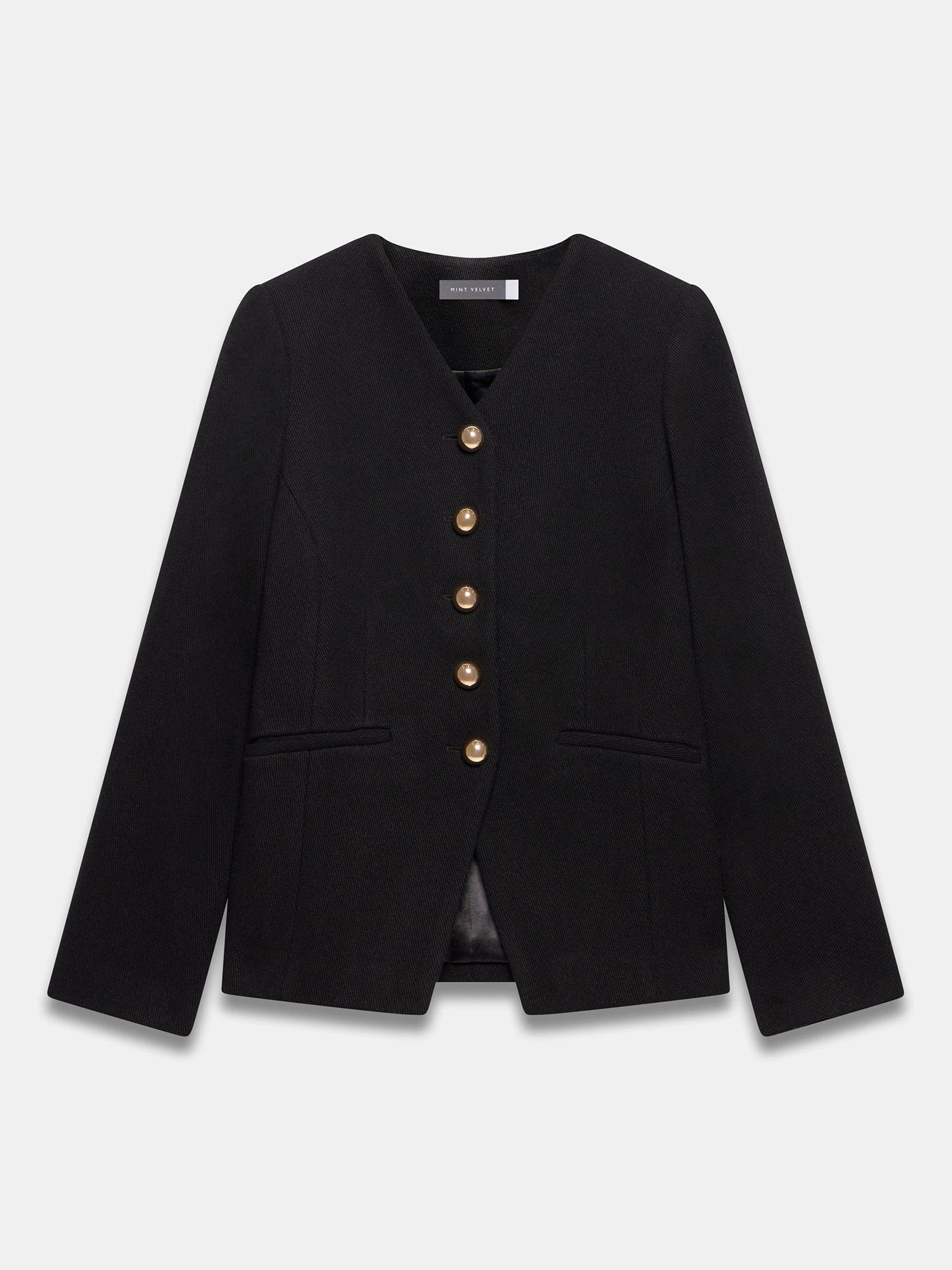 A sculptured jacket featuring a V-neckline, long sleeves, welt pockets, split front with metallic-tone button fastenings through the front.