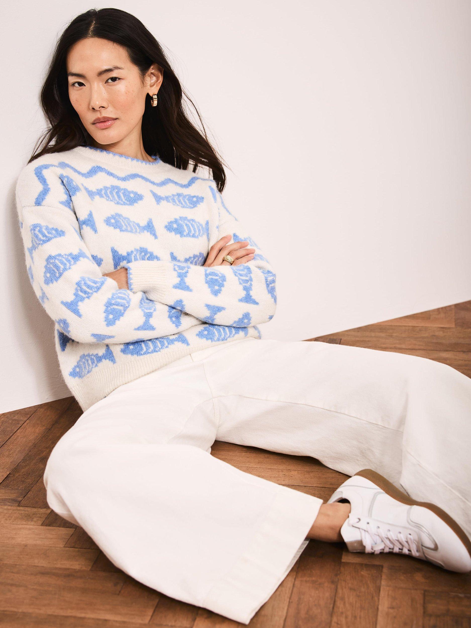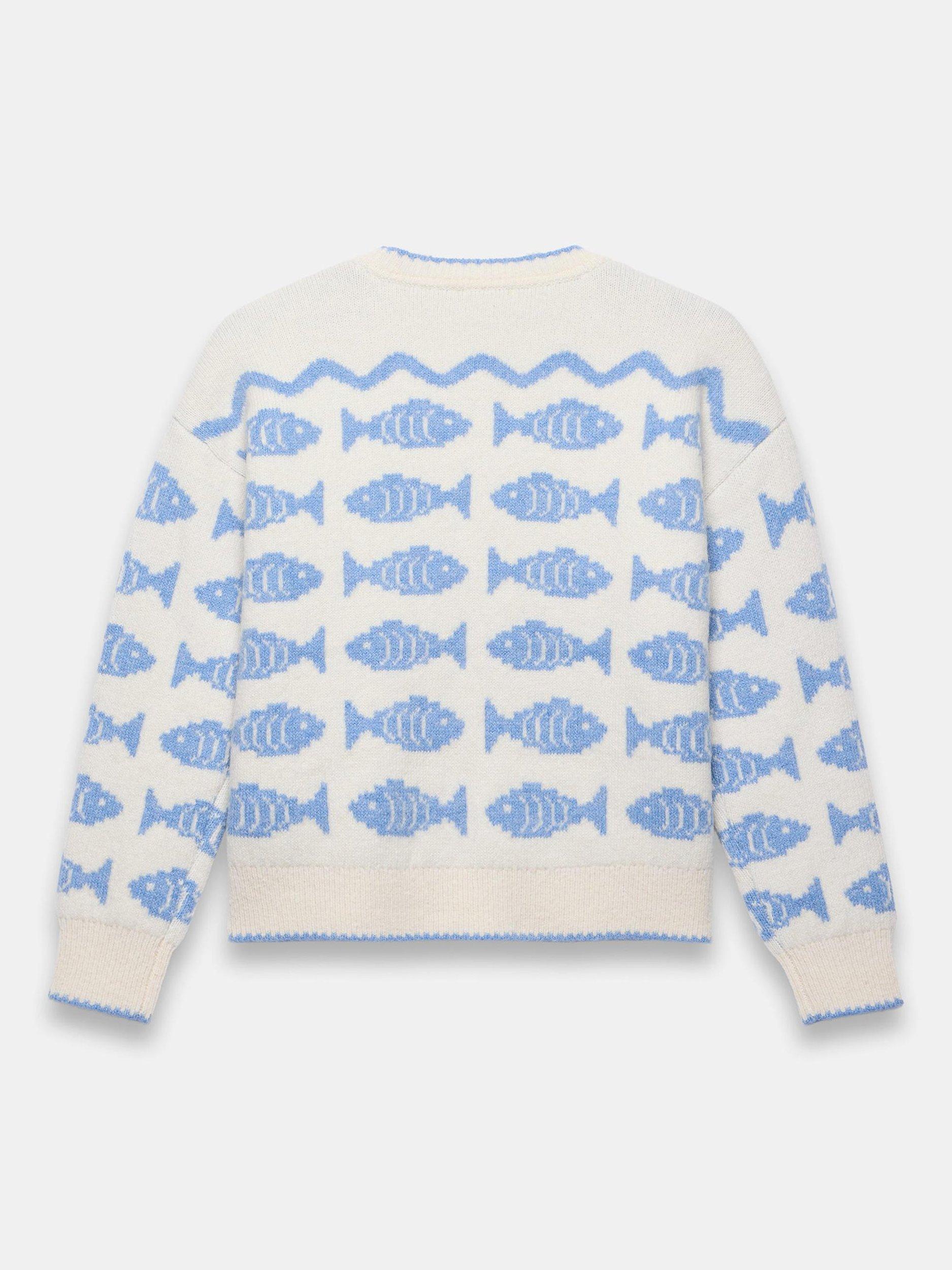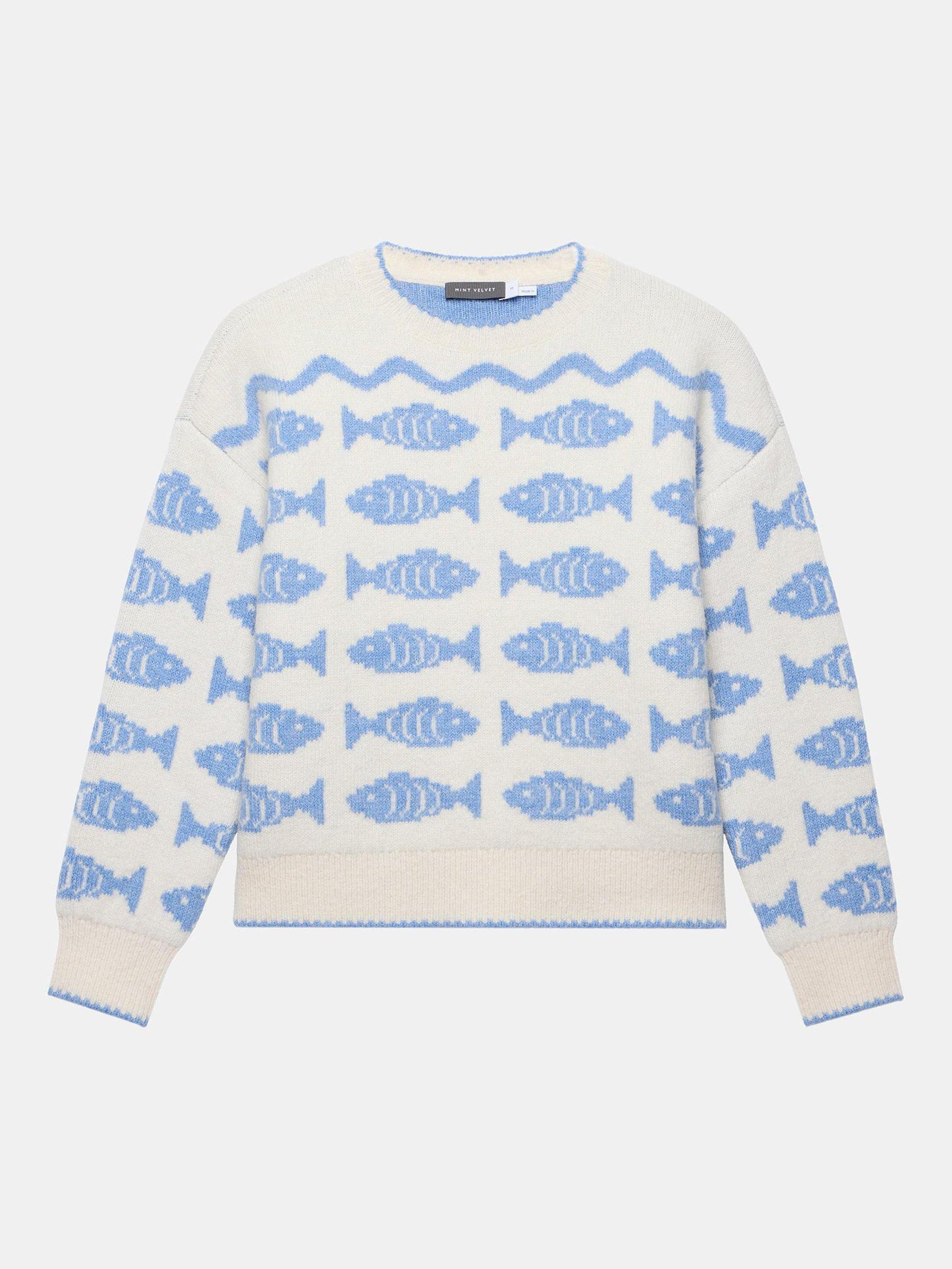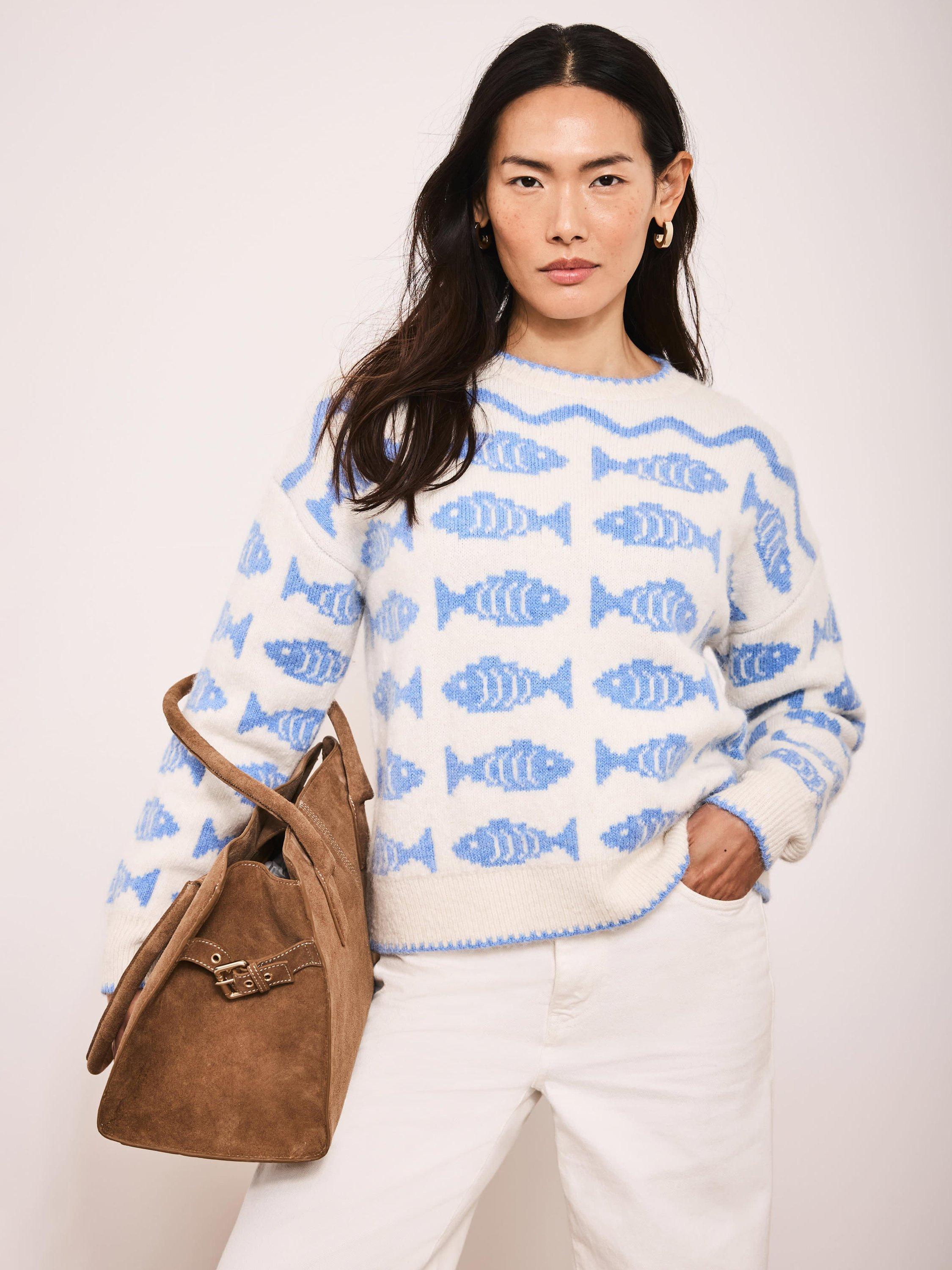 Blue knit jumper featuring a crew neckline, striped fish design, long sleeves and contrast trim.