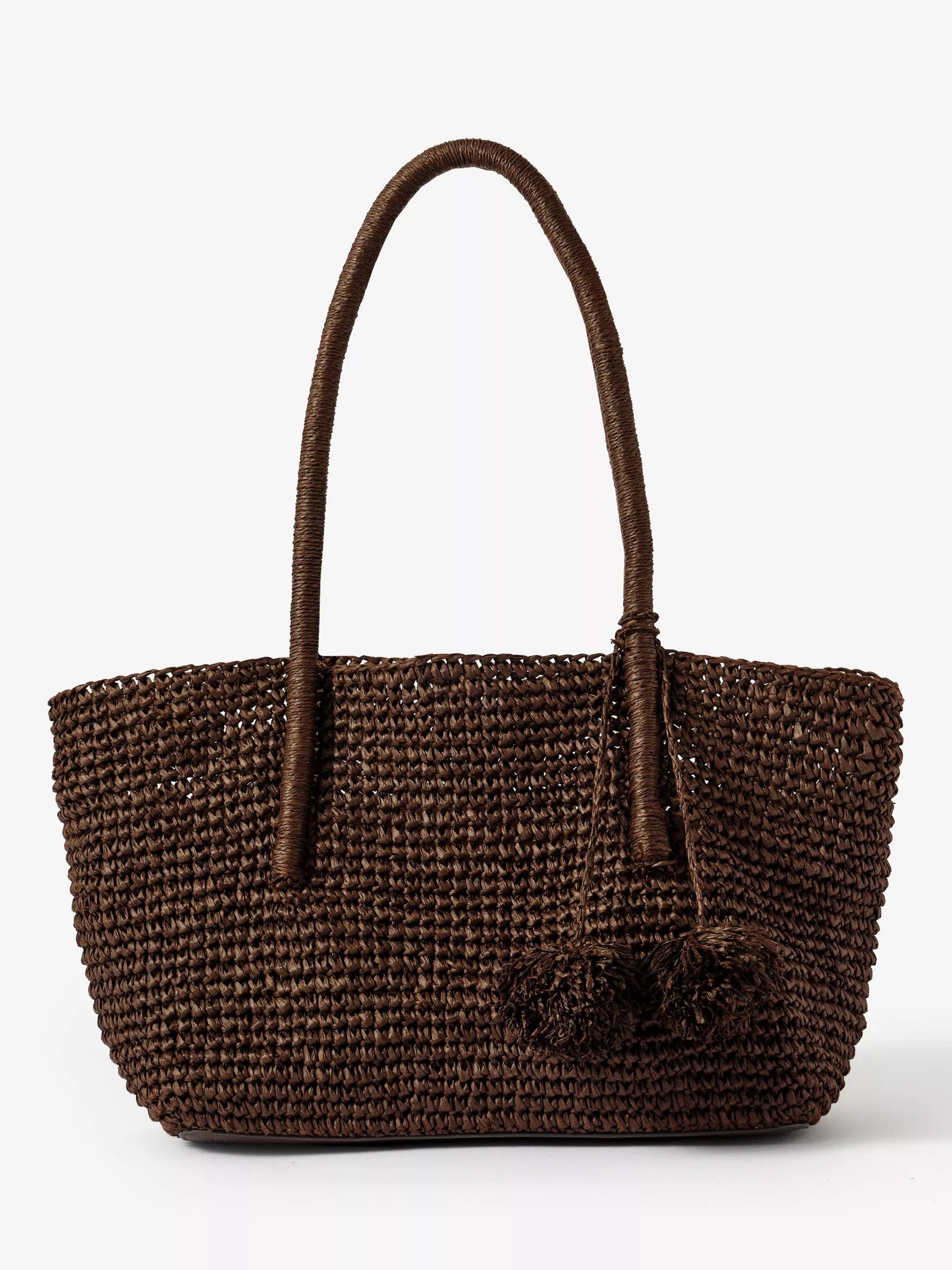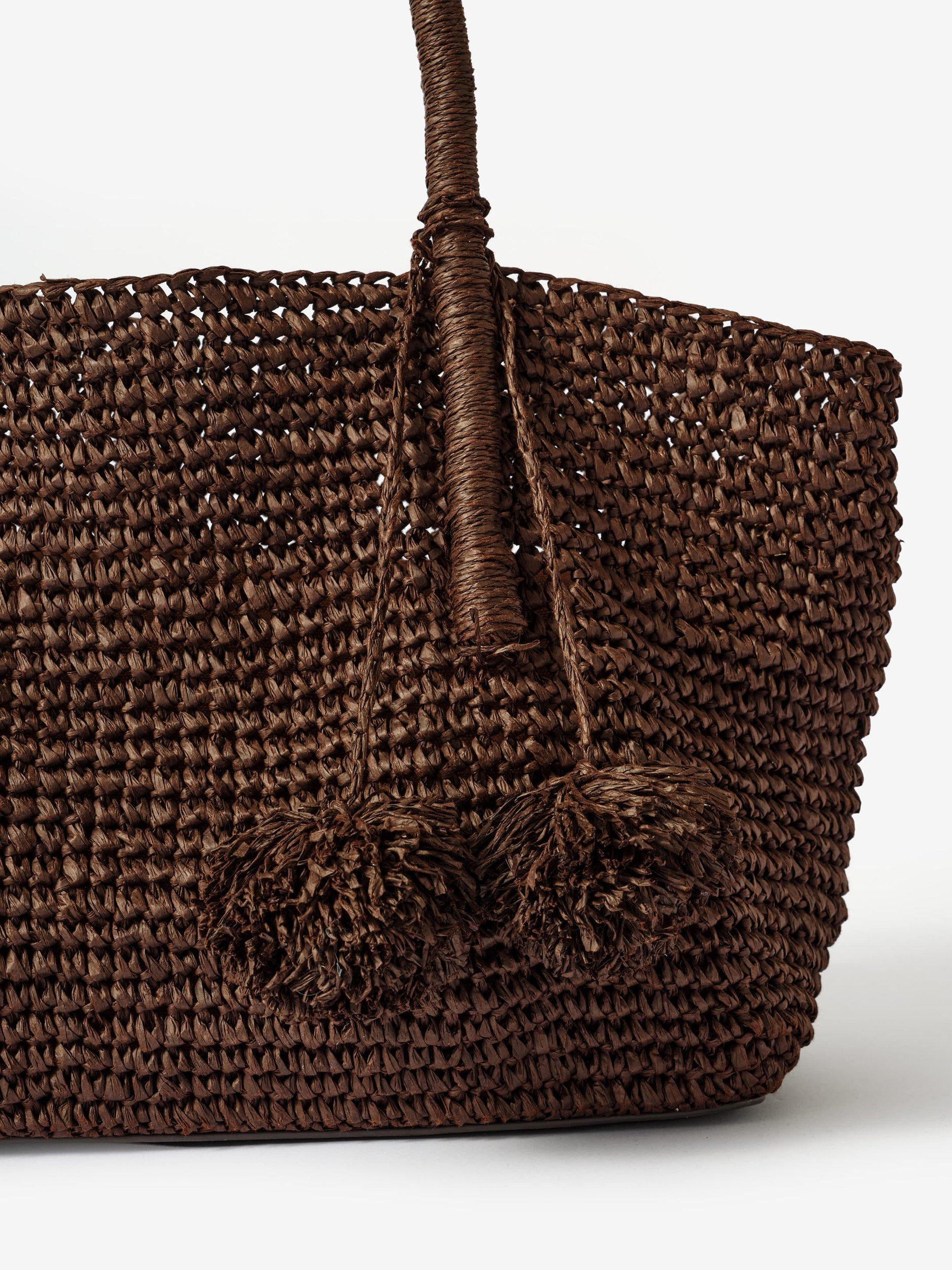 A woven tote bag featuring a removable charm and an internal zip cotton pouch attached by poppers with slip and zip pockets.