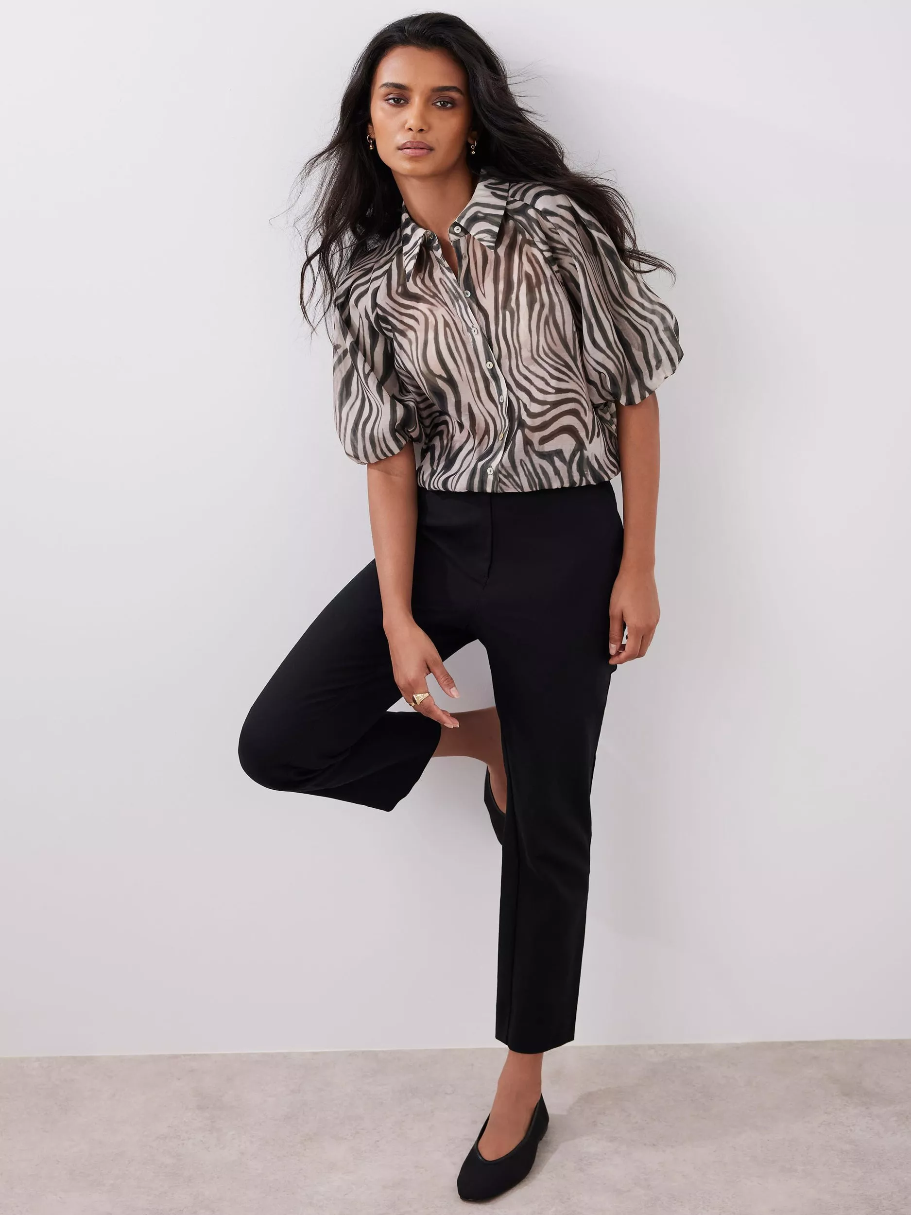 A lightweight zebra print shirt with a classic collar, short puff sleeves, elasticated waistband with a button fastening through the front.