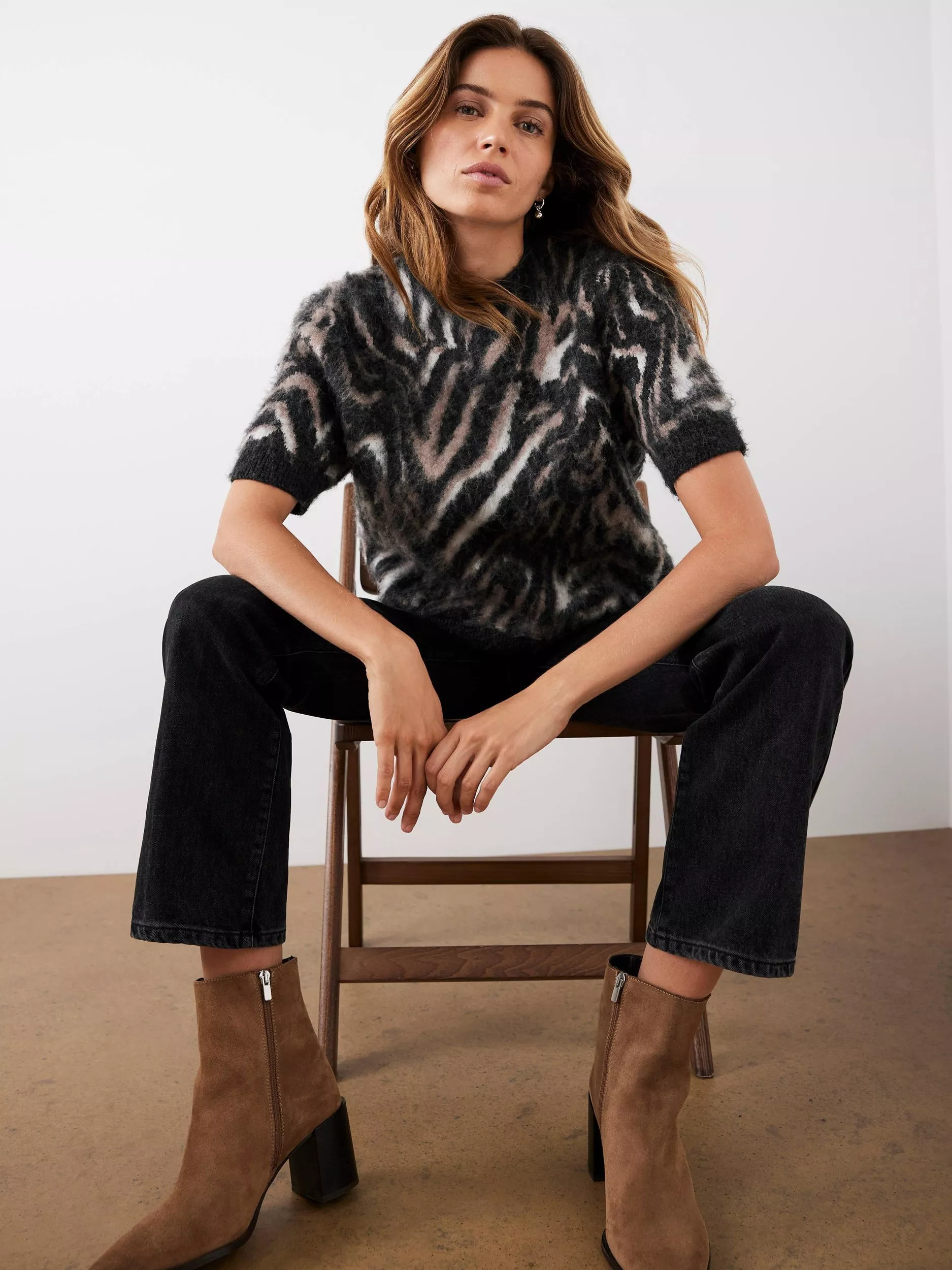 A wool-rich zebra knit top featuring a crew neckline, short sleeves and contrast tone trim.